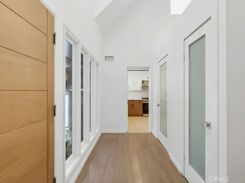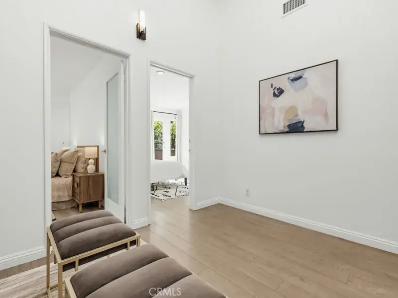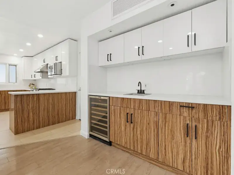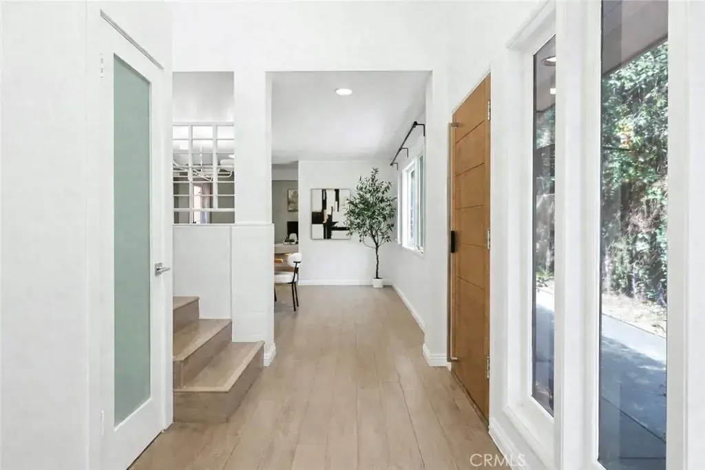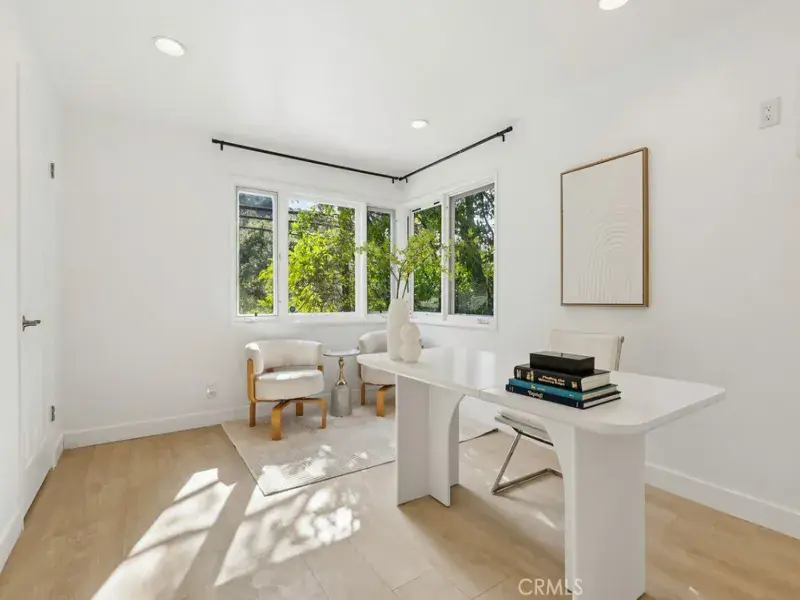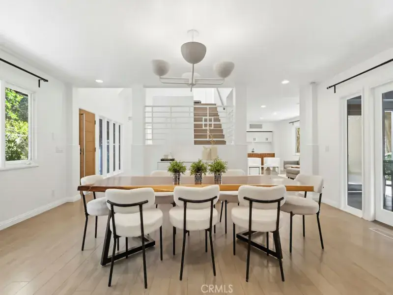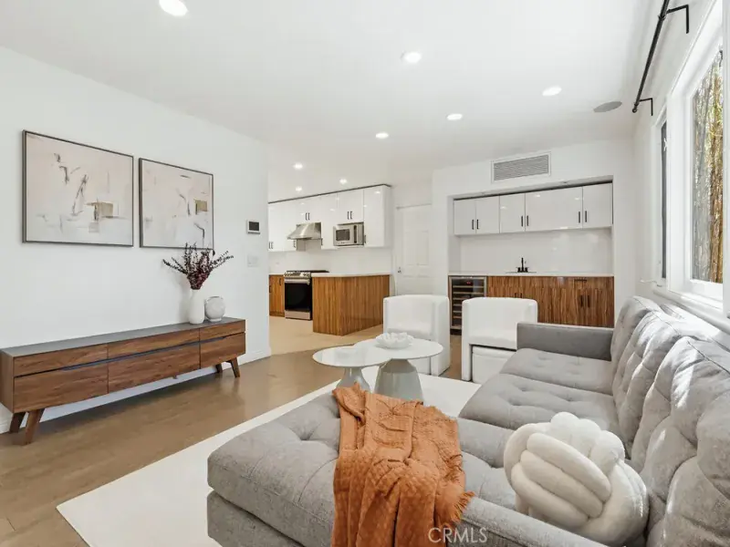 Beautifully remodeled residence featuring a bright, open-concept floor plan and refined flooring throughout. French doors seamlessly connect the interior living spaces to lush private gardens, creating an effortless and inviting indoor-outdoor flow.