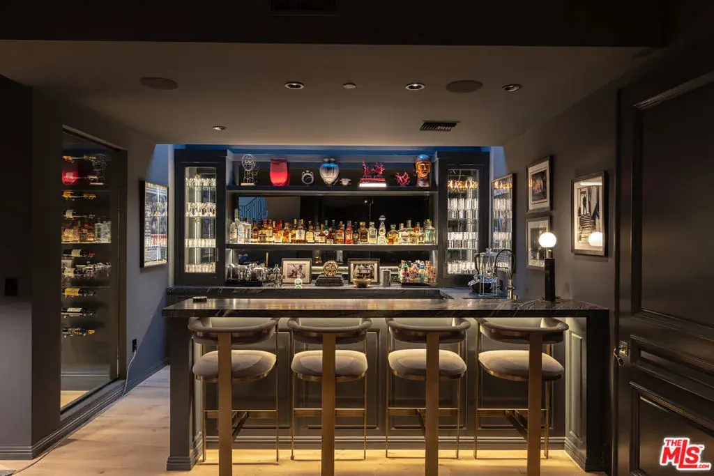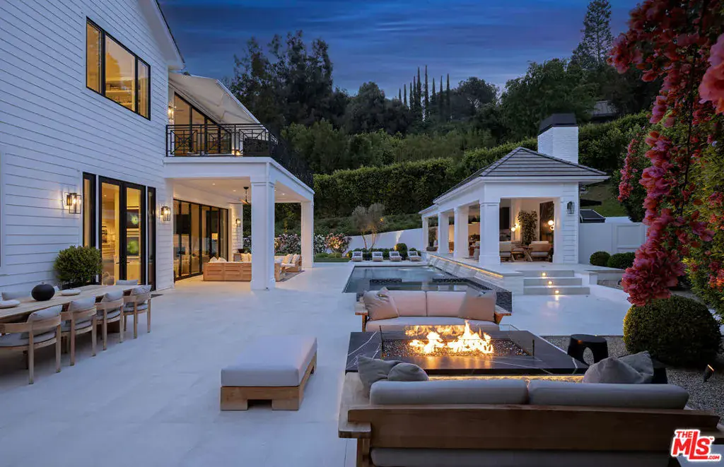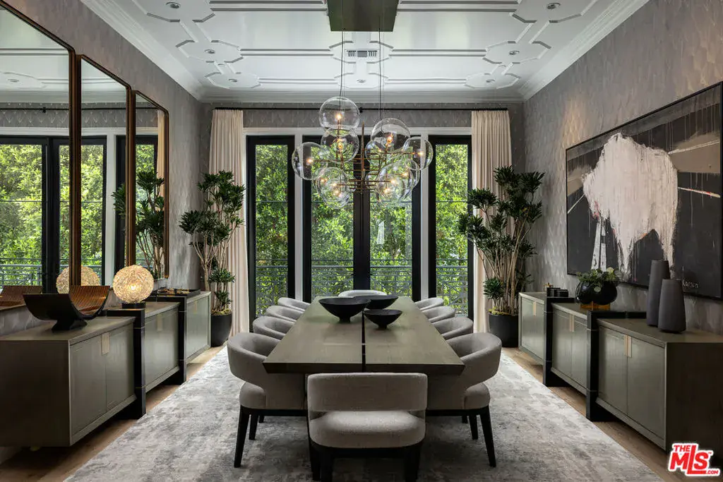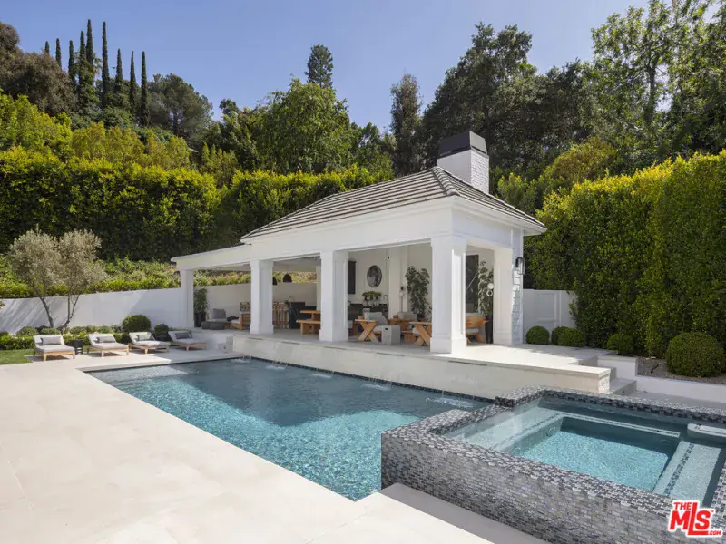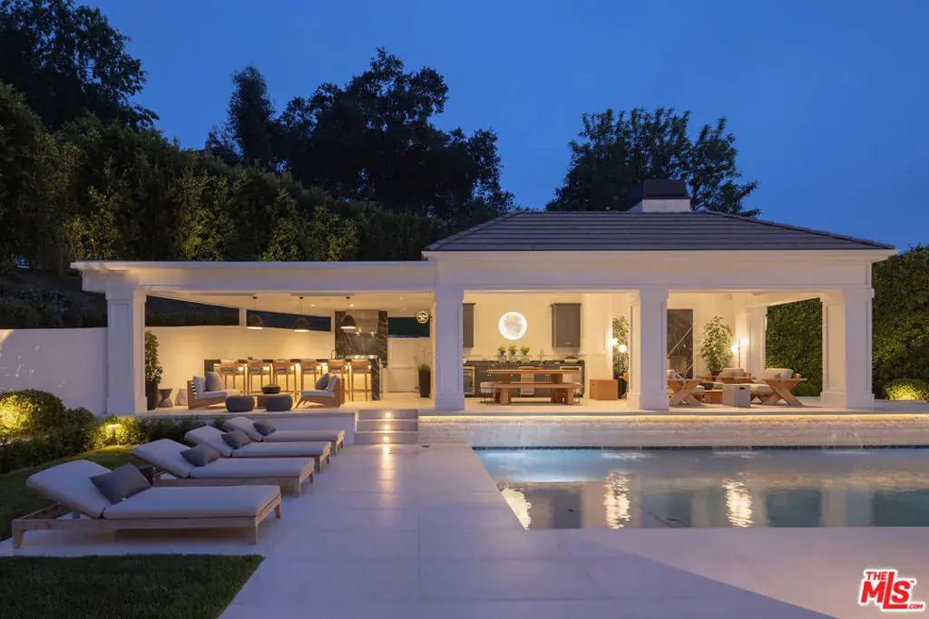 Positioned within the coveted Hidden Valley enclave of Beverly Hills, this impeccable estate offers privacy and tranquility behind secure gates, with 24/7 guard protection and lush, mature landscaping. Situated in one of the area’s most prestigious guard-gated communities, this residence showcases timeless design, grand proportions, and a thoughtfully updated aesthetic that harmonizes with its natural surroundings. Every element of this home has been masterfully conceived to deliver an unparalleled living experience. A dramatic 24-foot ceiling in the entry foyer sets the tone, featuring custom-crafted millwork and elegant wrought-iron accents that echo throughout the interiors. Spanning approximately 12,000 square feet, the residence is graced with wide-plank white oak floors, 12-foot-high ceilings, and expansive windows that frame serene canyon vistas. The main level unfolds with a series of distinguished spaces, including a formal living room, office, formal dining room, and multiple powder rooms. A spacious family room seamlessly connects to the outdoor entertaining areas, where a sprawling backyard oasis includes a pool, spa, outdoor kitchen, bar, dining pavilion, and fire pit lounge. The chef’s kitchen is a masterpiece of both design and functionality, outfitted with honed Calacatta marble countertops, a La Cornue 1908 range and oven, Wolf microwave, Sub-Zero refrigerator and freezer, dual Miele dishwashers, a wine fridge, and an oversized eat-in island, all framed by crisp white cabinetry. Two ensuite bedrooms and a two-car garage complete the main floor. Effortless access to the estate’s three levels is provided by a private elevator. Upstairs, the opulent primary suite offers a serene retreat with a fireplace, a balcony with picturesque views, dual marble bathrooms featuring soaking tubs, and a pair of custom dressing rooms with abundant built-in storage. Four additional ensuite bedrooms, each with spacious dressing closets, complete this floor. The lower level features a host of amenities for relaxation and entertainment. With 11-foot ceilings, this space includes a cozy home theater, a wet bar, lounge, gaming area, temperature-controlled wine room, fully equipped fitness studio, and laundry facilities. Additionally, the subterranean auto gallery spanning approximately 2,590 square feet boasts a revolving car turntable and accommodates up to six vehicles, offering limitless opportunities for customization. Fully automated through Savant and Lutron systems, the home’s technology provides seamless control over lighting, drapery, audio, televisions, fireplaces, and entry systems, ensuring modern convenience at every turn. Perfectly positioned within top-tier school districts and offering convenient access to Beverly Hills, the Westside, and the Valley’s finest shopping, dining, and nightlife, this estate is a rare offering that combines sophistication, comfort, and cutting-edge amenities.