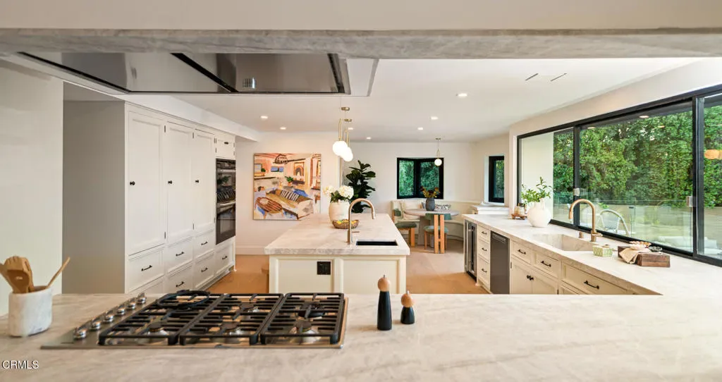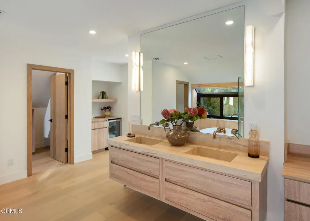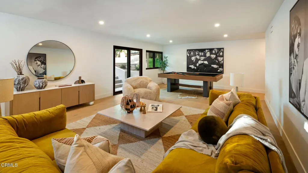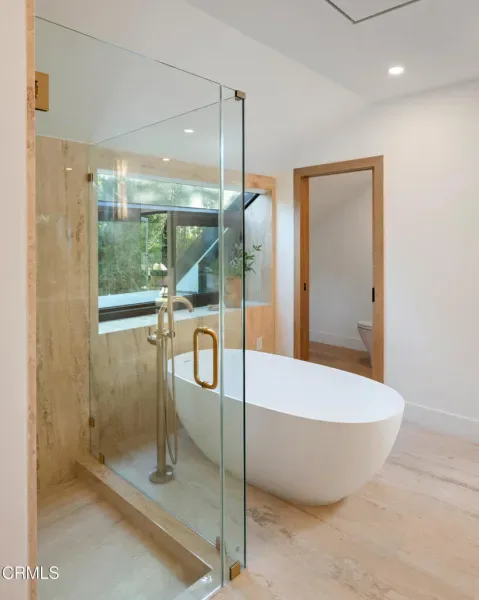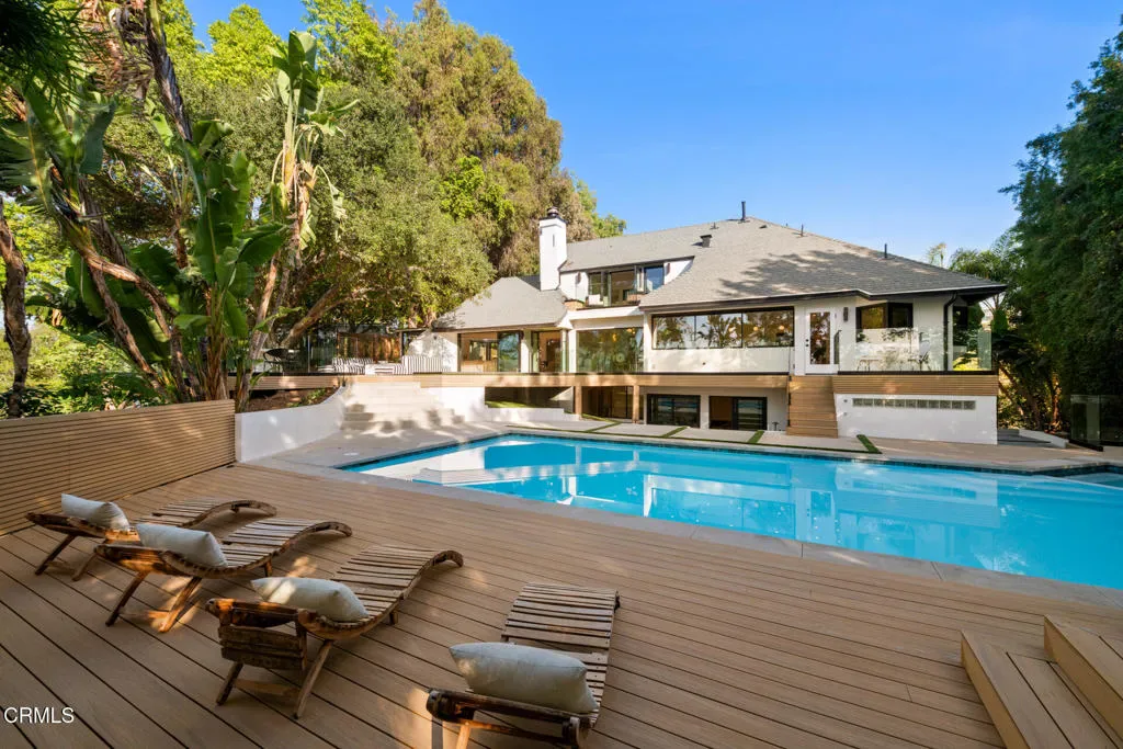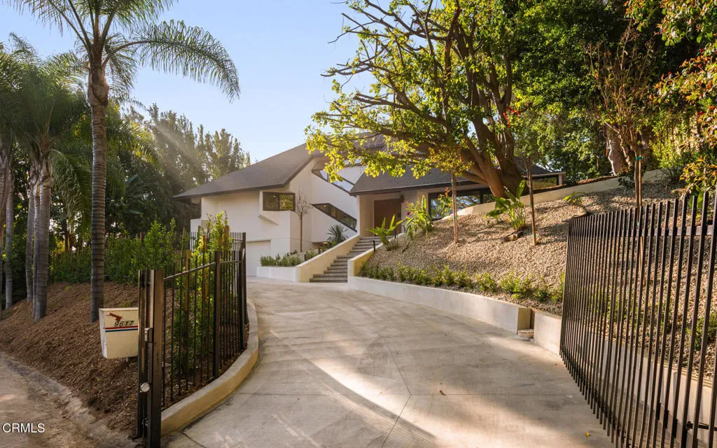 Tucked behind a long private driveway and secured by double gates, this newly renovated residence offers exceptional privacy and tranquility within the exclusive gated enclave of Oak Pass Road–an intimate Beverly Hills community celebrated for its serene setting and notable celebrity residents.Surrounded by mature landscaping and natural canyon beauty, the 4,000+ square-foot home is a peaceful retreat just minutes from the world-class shopping, dining, and lifestyle offerings of Beverly Hills. The main level welcomes you through a striking grand pivot entry door into an open, light-filled floor plan designed for gracious living and entertaining. Architectural highlights include vaulted ceilings, a central fireplace, refined custom details, wide-plank French oak flooring, and designer Spanish alabaster lighting throughout.The expansive chef’s kitchen seamlessly blends elegance and functionality, showcasing striking Taj Mahal marble countertops, a center island, breakfast nook, abundant storage, and top-of-the-line Miele and Viking appliances–ideal for both everyday living and effortless entertaining.The upper level is dedicated entirely to the primary suite, a private sanctuary complete with a fireplace, balcony, walk-in closet with custom built-ins, and a spa-inspired ensuite bathroom adorned with full-slab travertine stone finishes.The lower level offers a spacious entertaining lounge with direct access to the pool and outdoor living areas, creating a seamless indoor-outdoor experience. The backyard is framed by sleek glass railings that preserve unobstructed canyon views, enhancing the sense of openness and connection to the surrounding landscape. With a private entrance, this level also includes a versatile bonus room with an adjacent bathroom–perfect for use as an additional bedroom, gym, studio, playroom, or home theater.Set within one of Beverly Hills’ most coveted and tranquil gated communities, this turnkey five-bedroom, four-bathroom residence delivers a rare blend of privacy, scenic canyon surroundings, and proximity to city amenities–an exceptional opportunity to own a newly renovated home offering gated seclusion, captivating views, and an elevated outdoor lifestyle.