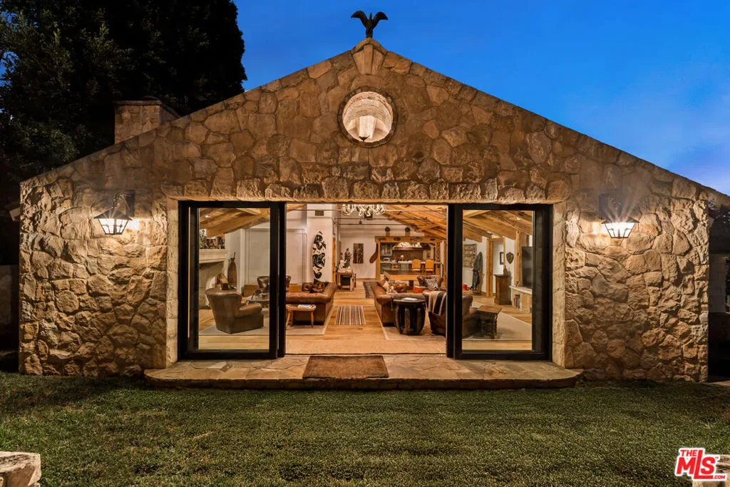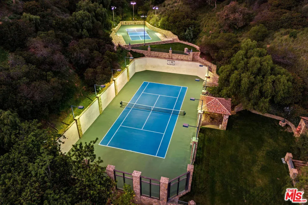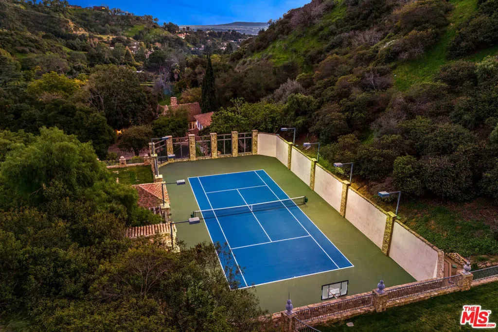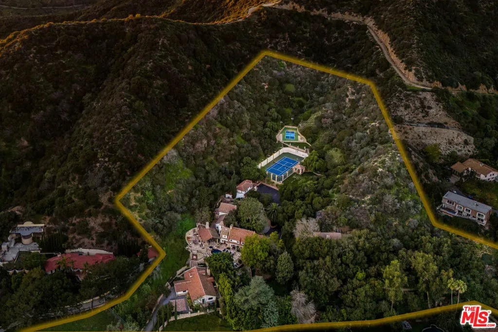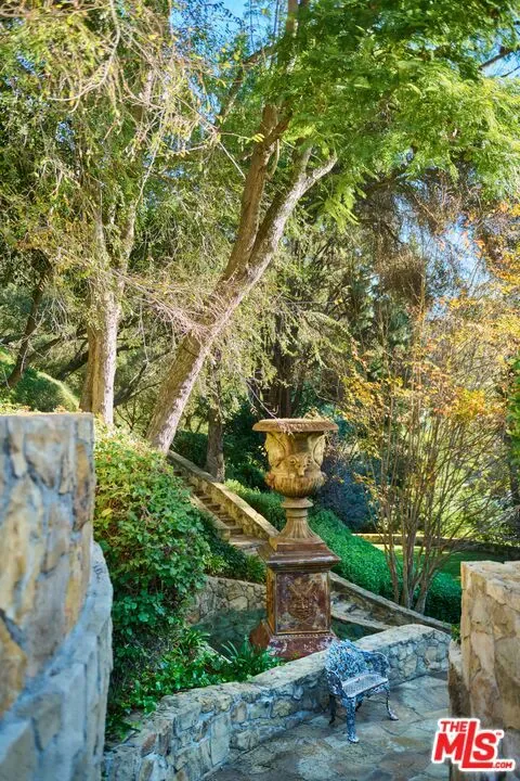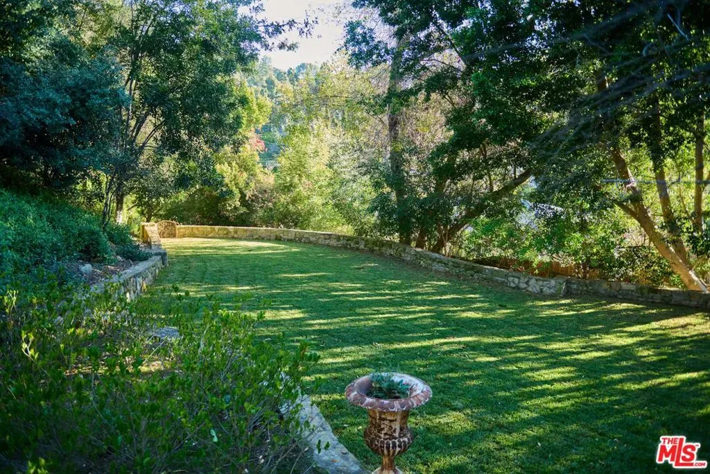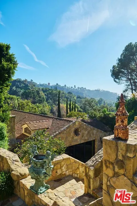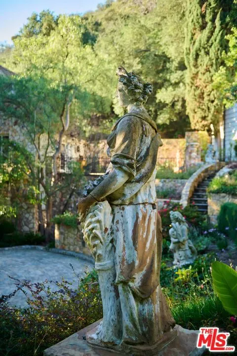 Once the storied Beverly Hills estate of Hollywood legend James Cagney, this rare and formerly celebrity-owned gated compound presents a once-in-a-generation opportunity to acquire a historic luxury estate in Beverly Hills 90210. Tucked privately beneath Franklin Canyon Nature Reserve, this expansive multi-residence Beverly Hills compound spans more than five acres of secured gated grounds, offering an unheard-of combination of acreage, provenance, and seclusion. Extensively renovated, updated and restored over many years, the private gated estate unfolds as a village-like enclave with multiple residences connected by hand-laid stone pathways winding through tiered citrus gardens, sculptural courtyards, candle-carved stone walls, and museum-quality European statuary. Mature landscaping and curated outdoor rooms create a timeless environment ideal for both intimate living and large-scale entertaining. The “Main Villa” is a romantic architectural centerpiece featuring reclaimed European terracotta roof tiles, exposed trussed-beam cathedral ceilings, leaded glass windows, and multiple restored original fireplaces. Designed for seamless entertaining, the home flows effortlessly from wine cellar and butler’s pantry to formal dining and elegant yet warm living rooms, evoking timeless character. This main villa residence offers two primary bedroom suites with couture-scale closets and both suites include grand ensuite baths, soaking tubs, double vanities, step in showers for two, while an additional guest bedroom suite features luxurious cedar closet dressing room and en suite bath. Additional structural assets across the estate compound include a secluded guest residence known as “The Boathouse,” with wood floors and trussed beams of antique 19th Century reclaimed French Oak complete with its own private gated drive and porte-cochre, ideal as an event venue, creative retreat, or production studio. “The Carriage House-Artist’s Studio,” is a multipurpose creative studio with full kitchen, en suite bath and auto garages. Plus an additional detached “Guest Cottage”, which was Cagney’s original art studio where he complete many collection paintings but now renovated to include a full kitchen and en suite bath. This epic compound provides multiple self-contained living environments, making this an exceptional multi-generational Beverly Hills estate uniquely versatile. Other features and amenities include separate regulation tennis and pickleball courts with grandfathered night lighting, a tennis spectator pavilion with wet bar, a glass-tile swimming pool and spa with poolside cabana and outdoor dining bistro. The Pavillion and Pool Cabana each include a fully equipped outdoor chef’s kitchen. Expansive flat lawns and play fields offer rare recreational space within the hills above Sunset Boulevard. A true trophy property, the former James Cagney Estate stands as a legacy Beverly Hills estate where architecture, landscape, and artistry converge, perfectly suited for multigenerational living, artists-in-residence, or those seeking an irreplaceable Hollywood history estate in one of Los Angeles’ most exclusive enclaves.