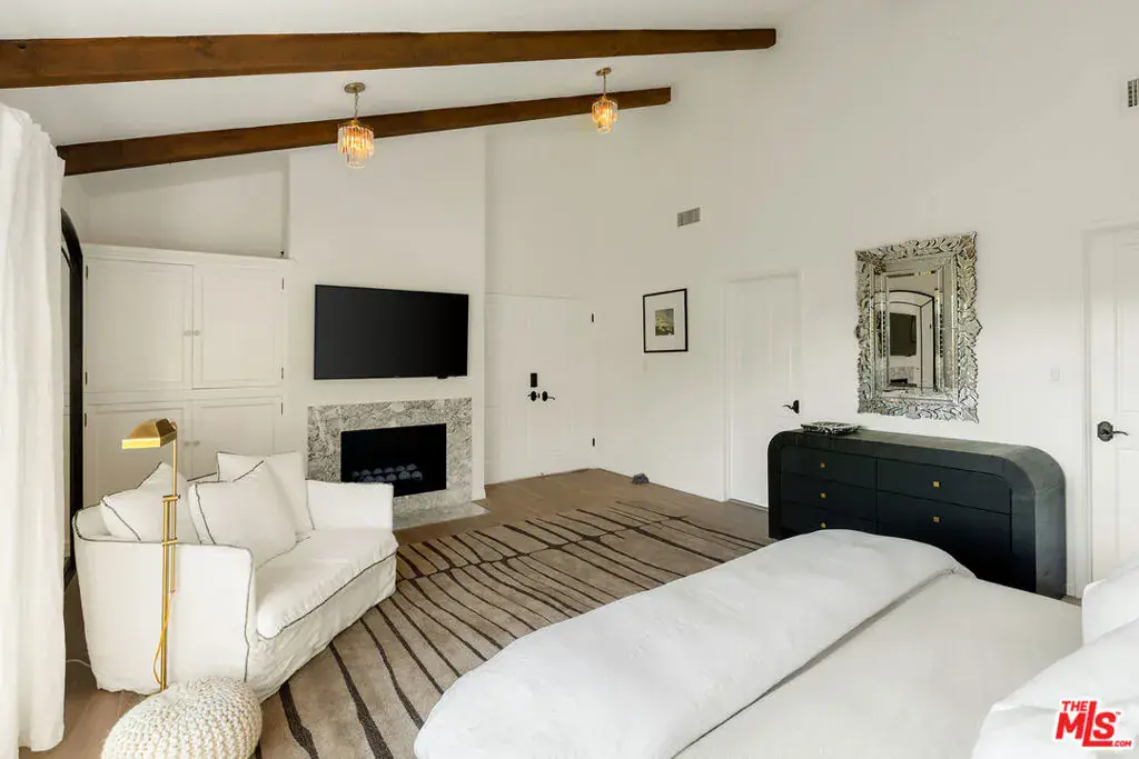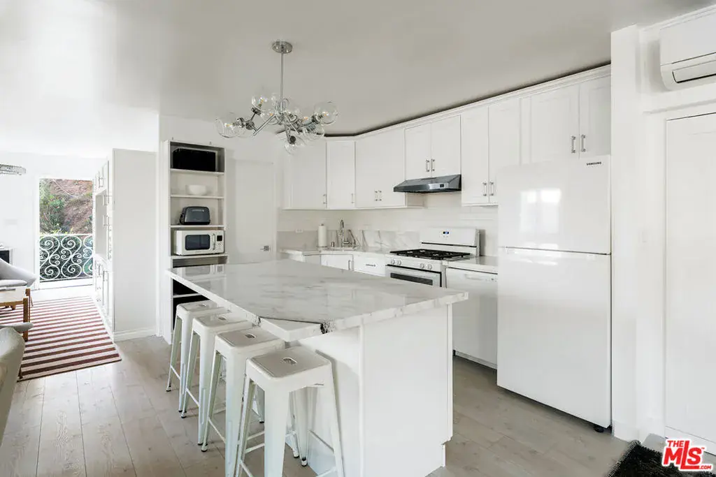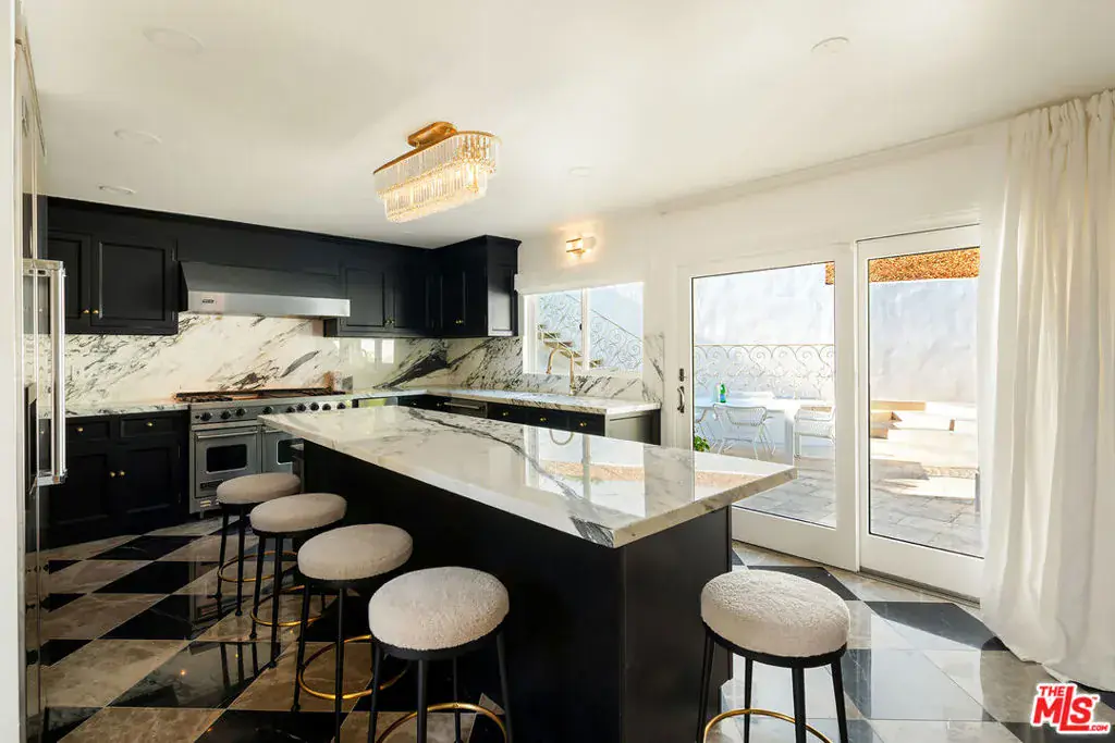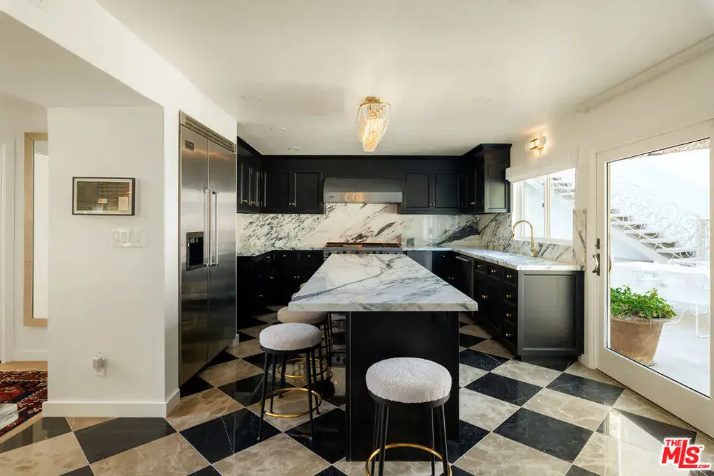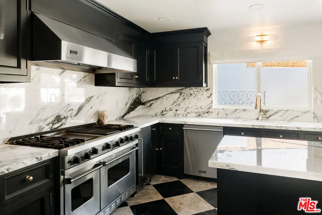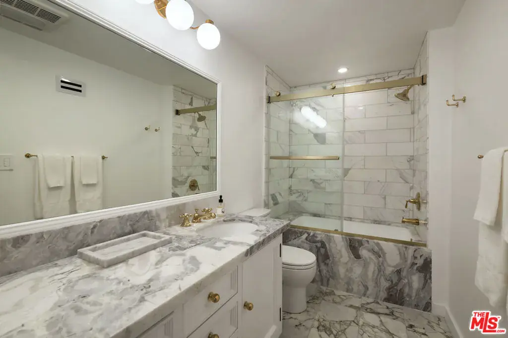 Nestled in a quiet 4 house cul de sac off of San Ysidro Drive, this recently renovated home with a fully equipped guest house is just minutes from everything Beverly Hills has to offer. Offered fully furnished and equipped. Completely ready for an easy move in. The main house creates ample curb appeal with large windows, ivory travertine stairs, and cream wrought iron accents. Nero Marquina & Emperador marble laid in a harlequin pattern sets the tone of the kitchen that includes a 9ft center island accented with shearling barstools, marble slab backsplash, Viking appliances, unlacquered brass hardware, commercial grade range, and brand new walk-in pantry. The formal dining and living rooms are laid out for seamless entertaining with a full bar, camel colored quartzite fireplace, large antique hutch for serving dinner parties, and sliding doors towards the front & back for open air. The moody powder room mixes Nero Marquina & Rojo Alicante marble with an overmount copper sink original to the house. There was special attention paid to opting for natural materials when designing the spaces including natural stones, wool rugs, linen curtains, cotton velvets, wool boucle, shearling/hides, and solid hardwood floors. Crystal chandeliers and a warm color palette invite you home. The primary suite features soaring vaulted ceilings, marble fireplace, walk-in closet, and Carrara marble bathroom with a clawfoot tub. The walkout lower level with Terrazzo floors throughout includes a spacious bedroom with en-suite Calacatta green + Calacatta gold marble & Picasso quartzite full bathroom, full laundry room, and access to the attached garage. The backyard is an oasis with an ivory travertine patio, saltwater pool with jacuzzi, outdoor dining for 10, and Viking grill. The spacious guest house is perched above the backyard and is fully equipped with its own kitchen w/ veined granite countertops, laundry, marble bath, built-in closet space, and wrap-around deck w/grill. Access to the guest house is separate via a side gate with its own address.
