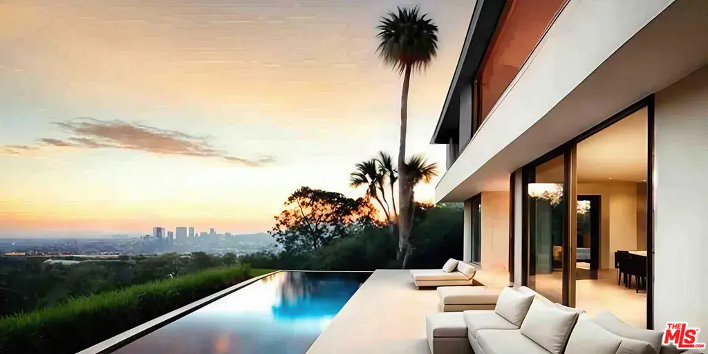 Perched atop a private knoll in Beverly Hills Post Office, 9924 Beverly Grove Drive commands panoramic views stretching from Downtown Los Angeles to the Pacific Ocean. Tucked away on a quiet private road and surrounded by some of the area’s most notable residents, including LeBron James, Lisa Kudrow, and Kylie Jenner, this hillside retreat offers an uncommon combination of privacy, prestige, and long term potential. The existing mid century residence spans approximately 2,582 square feet with three bedrooms and three bathrooms. At the heart of the home, a striking indoor pool sits beneath three oversized skylights, flooding the space with natural light and creating a dramatic spa like atmosphere rarely found in Beverly Hills properties. High ceilings throughout enhance the sense of volume and openness, while the main living areas were thoughtfully designed to frame sweeping city to ocean views. Set on nearly half an acre, the property presents meaningful upside for multiple buyer profiles. For a mid century enthusiast, it offers the opportunity to thoughtfully restore and modernize a classic hillside retreat with extraordinary bones. For those exploring expansion, a recent underbuilt analysis indicates the potential to build approximately 5,300 to 6,000 square feet across multiple levels, subject to buyer verification. Properties that combine panoramic views, private road access, architectural character, and expansion flexibility in BHPO are increasingly limited. Whether preserved and elevated or reimagined into a larger custom estate, 9924 Beverly Grove Drive represents a rare opportunity in one of Los Angeles’ most sought after hillside enclaves.