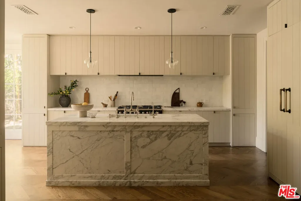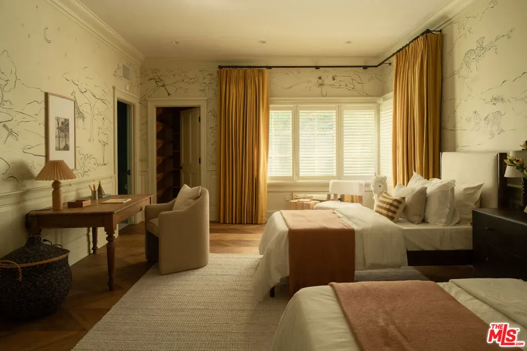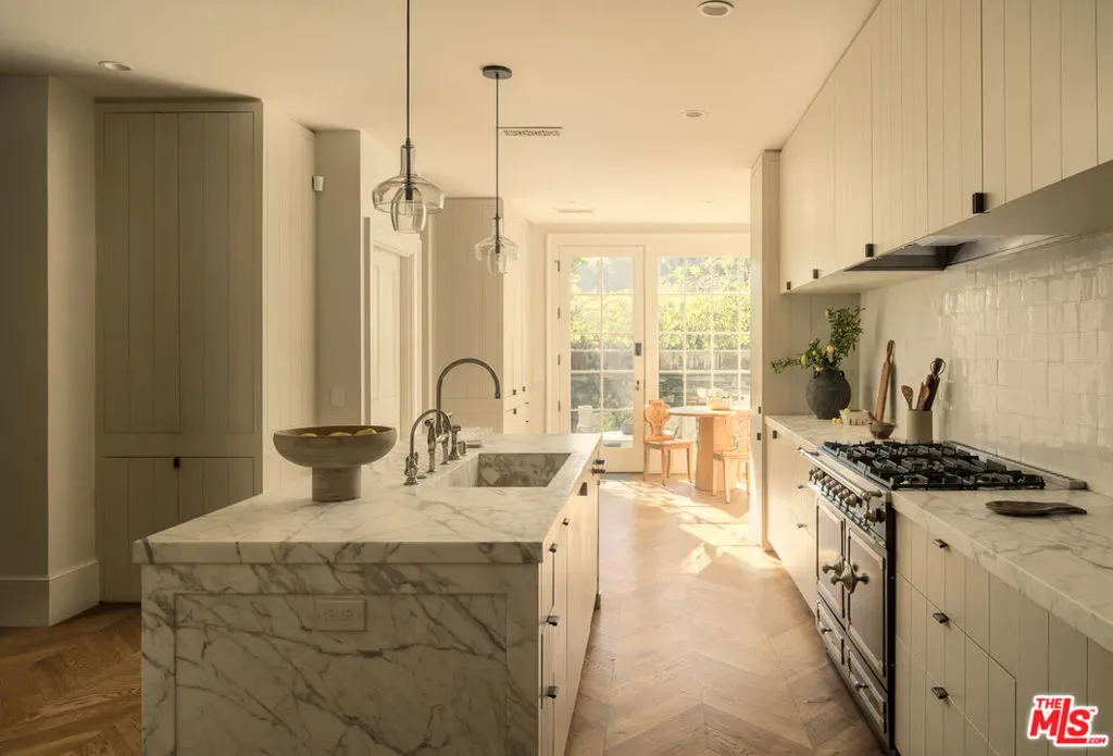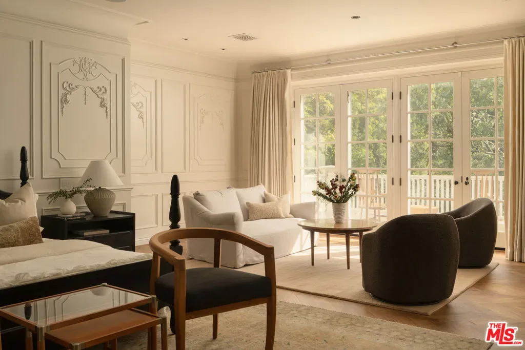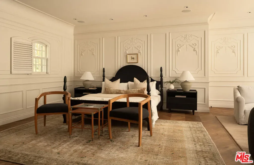 Located in the coveted guard-gated enclave of Hidden Valley Estates, this beautifully renovated French Traditional residence designed by AD100 firm Clements Design spans approximately 5,500 square feet. Privately set behind lush landscaping, the 5-bedroom, 6-bathroom home blends timeless architecture with modern comfort. The custom kitchen features a La Cornue range, built-in Miele coffee system, and a Carrara marble island that opens to the formal dining area. A sunlit, west-facing breakfast nook flows into a serene outdoor seating space surrounded by mature greenery, stonework, a koi pond, and multiple water features. Custom marble floors lead to the formal living room with a stunning wood-burning fireplace and an adjacent newly built screened porch outfitted with electric heaters. A spacious family room with handcrafted shelving, generous storage, and a sleek bar equipped with a wine and beverage fridge and icemaker offers a versatile space ideal for entertaining or relaxed lounging. A cozy en-suite bedroom completes the main level. The upper level, accessible by two separate staircases, offers four beautifully appointed en-suite bedrooms, including a luxurious, oversized primary suite with a sitting area, private balcony, and generously sized walk-in closet. The park-like grounds feature a 40-foot swimming pool, two fire pits, and multiple seating areas across over 13,000 square foot lot delivering a private, verdant landscaped retreat that perfectly embodies refined California living. First time offered in over a decade, this is a rare opportunity combining exceptional design, tranquility, and one of the most sought-after addresses in the area.