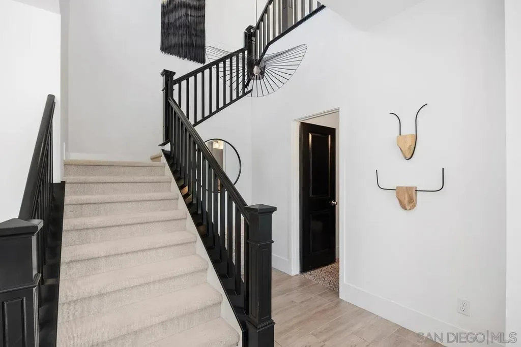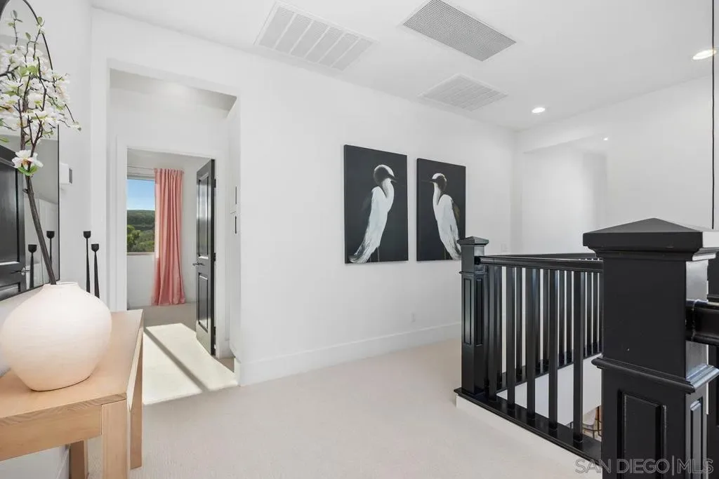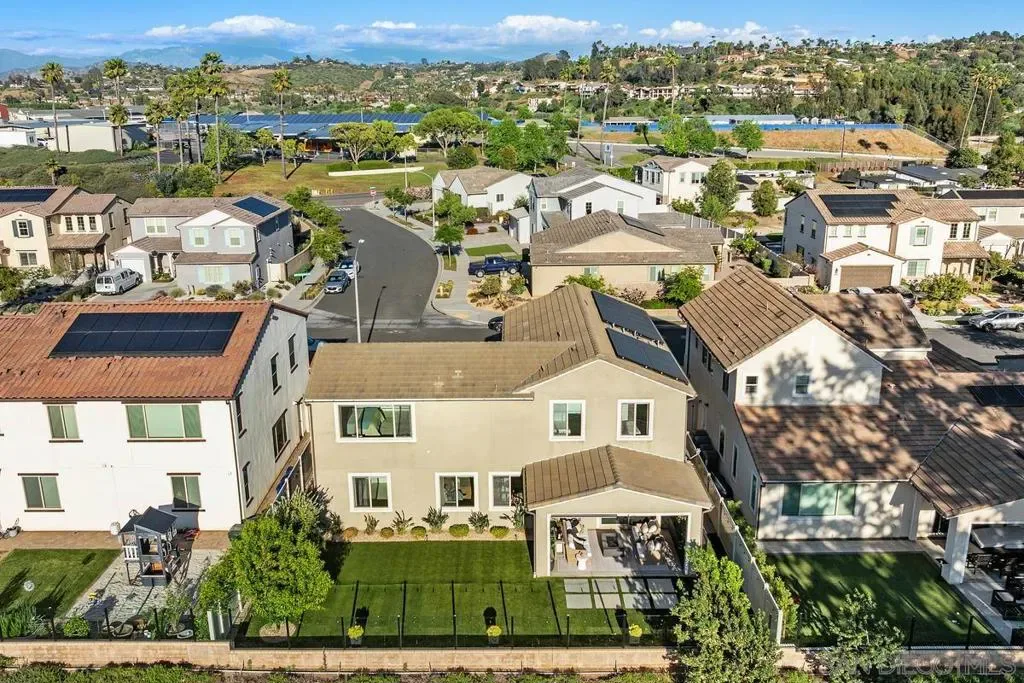 Exuding sophistication and model-home perfection, this exceptional residence in the coveted S.L. Rey community of Bonsall offers refined living at its finest. Thoughtfully designed, the home features 4 spacious bedrooms upstairs and a versatile main-level bonus room ideal for a private office or guest retreat. At the heart of the home, the chef-inspired kitchen showcases quartz countertops, an expansive island, soft-close cabinetry, a walk-in pantry, and a butler’s pantry with custom built-ins for seamless organization. Premium upgrades include a hands-free faucet, newer double oven and microwave, and stylish pendent lights. The living space is enhanced with surround sound and a designer feature slat wall, while upstairs offers plush, like-new carpeting, a statement staircase with stunning designer chandelier suspended from the second story ceiling, upgraded ceiling fans, and smart motorized blinds. Additional high-end features include 7-inch baseboards, smart lighting controls, A/C, OWNED solar, and a tankless water heater for optimal efficiency and comfort. Step into a beautifully curated outdoor retreat featuring low-maintenance turf, mature fruit trees, and tranquil greenbelt views-an ideal setting for both relaxation and entertaining.The epoxy-finished 3-car garage, along with rain gutters and French drains, reflects the home’s attention to detail. Enjoy close proximity to top-rated schools and over 100 acres of scenic walking, biking, and equestrian trails—all with no Mello-Roos. A rare opportunity to own a truly turnkey home where luxury, comfort, and lifestyle meet
