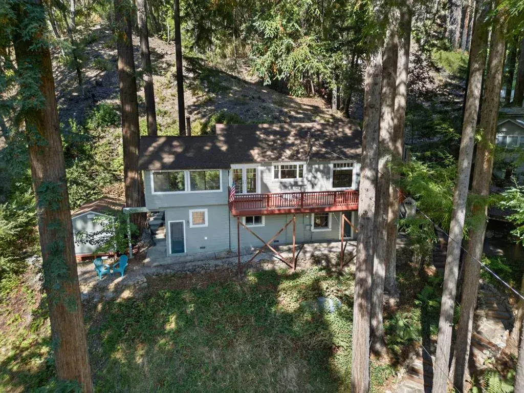 Welcome to your peaceful retreat in the historic Bracken Brae community where you can enjoy exclusive trails & river beach access. Situated on a private road & backing to greenbelt, this 3 parcel property feels secluded & quiet. The reverse floor plan elevates the main living spaces to capture light, ridge view & treetop privacy. This 3 bed, 2 bath home greets you with a livingroom featuring Brazilian cherry floors, a cozy fireplace with a woodburning insert & sweeping redwood views. The bright, thoughtfully designed kitchen showcases custom cabinets, quartz counters & a suite of Bosch appliances, opening into a sunroom where wall-to-wall windows bring the forest right to you. Step out onto the spacious deck perfect for entertaining or relaxing in fresh mountain air. Downstairs offers a private bedroom & bath plus a versatile bonus room ideal for an office, playroom or guest space. The houses flexible layout offers room to make it your own. Central heating system, exhaust fans & all appliances replaced in 2021. With oversized parking for a boat or RV, carport, 2 sheds & outdoor shower for after a river swim or muddy paws, this home blends everyday comfort with outdoor adventure. Just minutes from town & a short drive to Big Basin, its a true blend of home, nature & community.