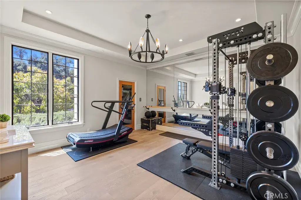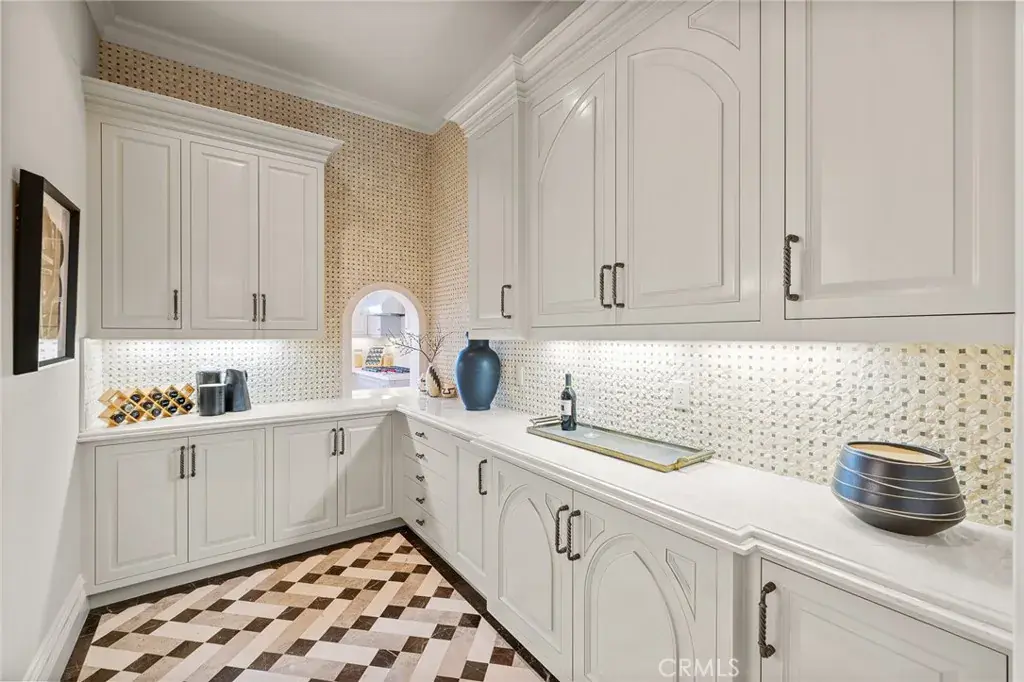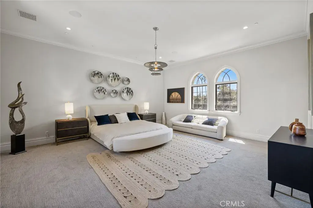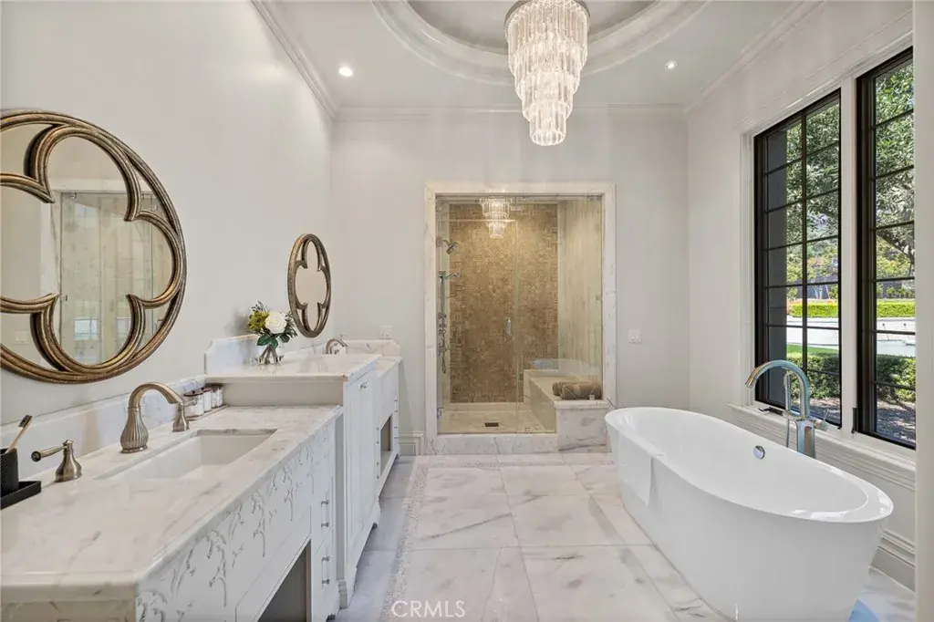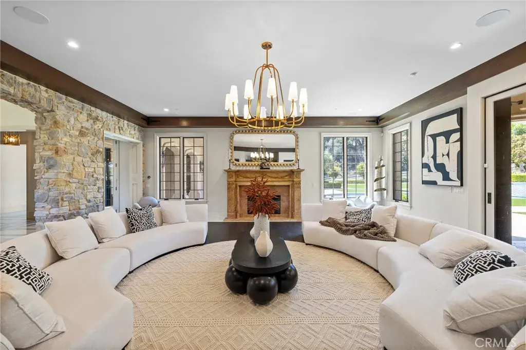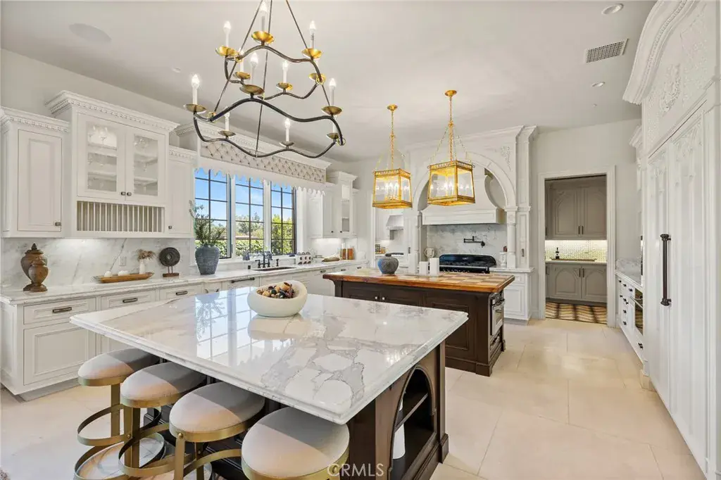 The main residence offers 7 bedrooms and 9 bathrooms, showcasing soaring cathedral ceilings, gothic arches, fleur-de-lis detailing, and intricate woodwork. A soft neutral palette accented by antiqued metallics and natural finishes evokes both warmth and grandeur. Custom highlights include a gilded coffered library, gourmet kitchen with artisan cabinetry, secondary wok kitchen, private home theater, and dedicated spa room for ultimate relaxation.
