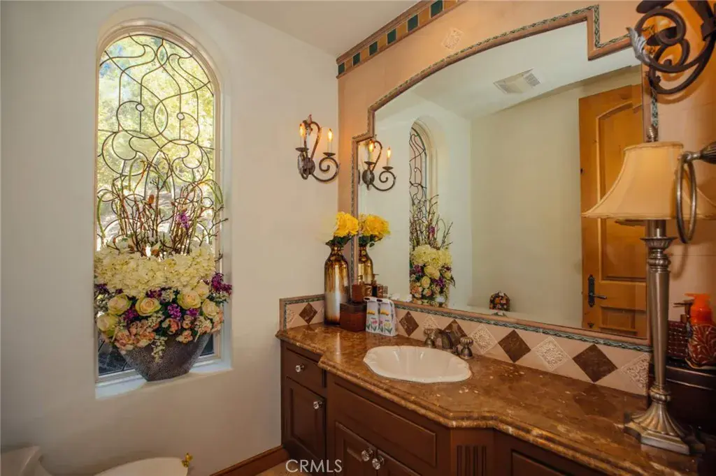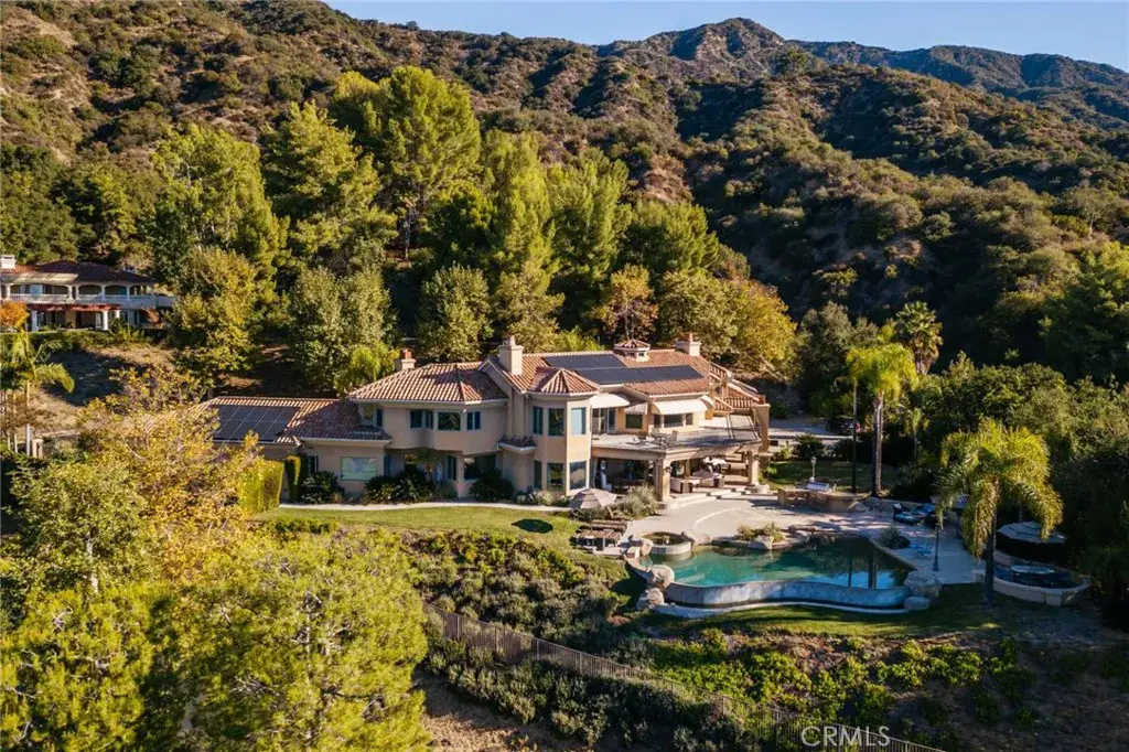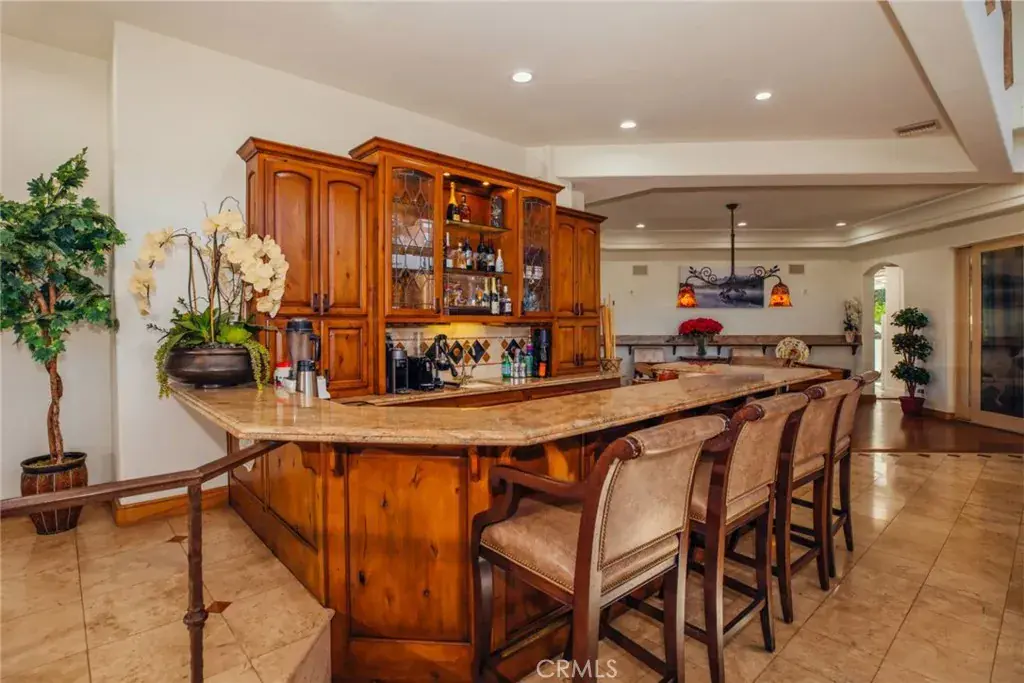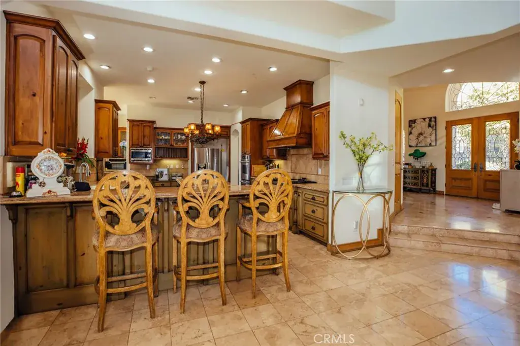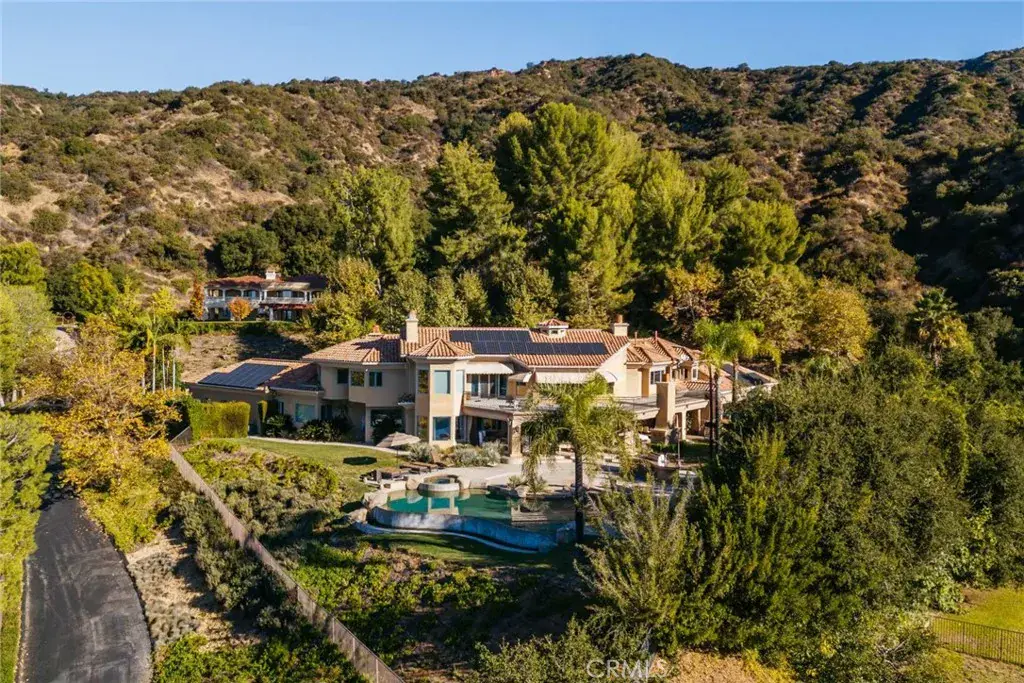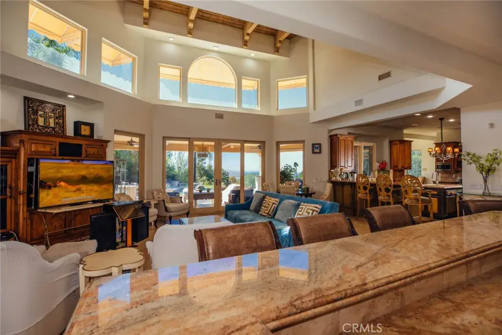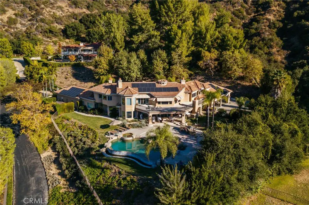 Custom built estate located at the top of the exclusive 24-hour guard gated community of Bradbury Estates on a 5+acres lot. 2nd time on market, this home offers spectacular panorama city lights & mountain views. No expense was spared when this custom home designed by J Don Crenshaw, one of the most revered architects in the area, was built by Mur-Sol Construction. With magnificent tall open beam ceilings, custom built knotty alder cabinets & doors, this beautiful Mediterranean style home features a spacious gourmet kitchen with Thermador Professional stainless cook top 6 burners & griddle, 2 convection ovens, warming drawer, 2 dishwashers, refrigerator, large island with sink, abundance of granite counter tops & walk-in pantry. Open floor plan with huge great room with soaring ceiling & large walkup wet bar with back bar aside billiard room. Immense outdoor living area with fireplace, open beam ceiling, gas lamps-overlooking beautiful infinity pebble tech pool & spa with beach entry. Viking BBQ bar, Viking refrigerator, Perlick draft beer disp. & sink, next to poolside fire pit. Perfect for the Car enthusiast or collector is a 3-car garage plus an 8-car garage with tall doors & high ceilings-can accommodate a motor home & car lifts. It has heavy power & plumbed with airlines. Pre-plumbed for 2 baths, could be converted into 2-bedroom suites & theater adding 1,652 square feet. A wonderful opportunity to entertain friends and family in this beautiful home in the exclusive Bradbury Estate.