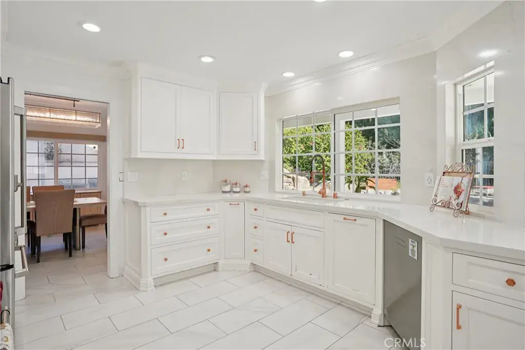 The upgraded kitchen is a chef’s delight, featuring stainless steel appliances, a gas cooktop, marble countertops, recessed lighting, wine refrigerator, and generous cabinetry. The kitchen opens effortlessly to the casual dining area and family room, creating an inviting and functional gathering space. A downstairs bedroom has been thoughtfully opened to expand the family room, enhancing the home’s open and airy feel.
