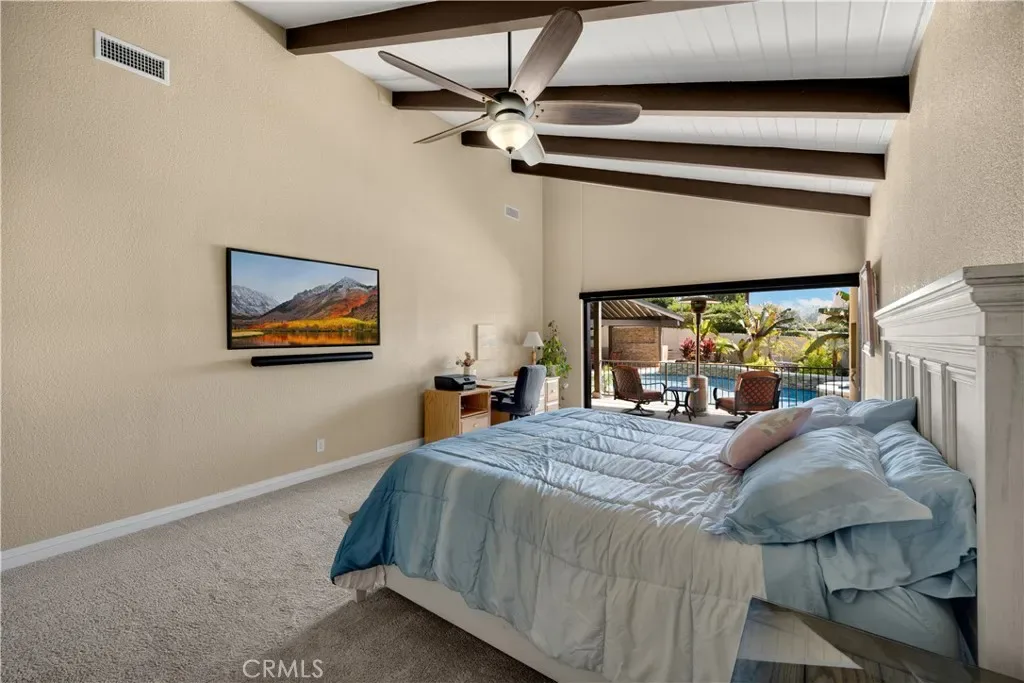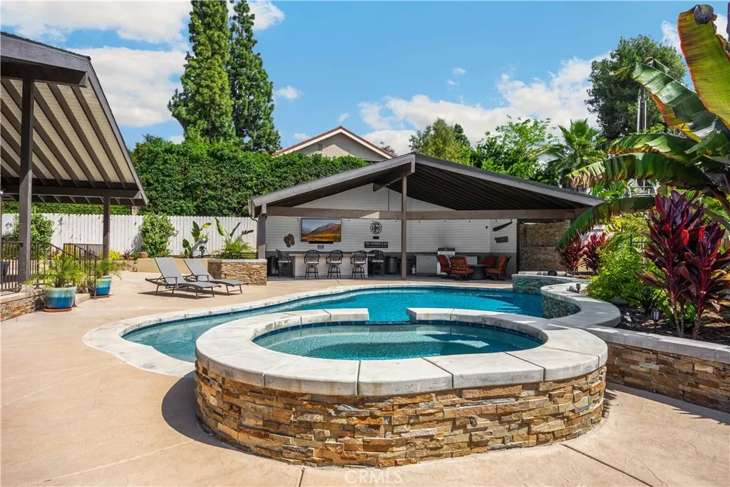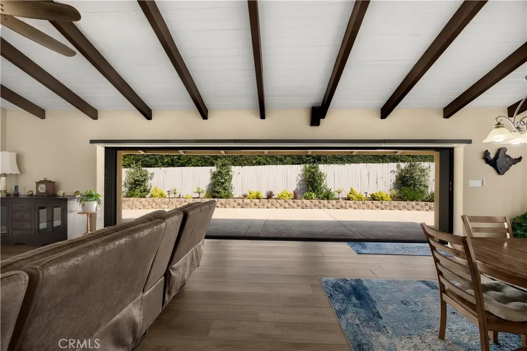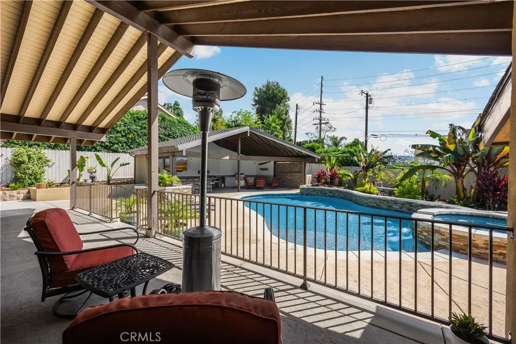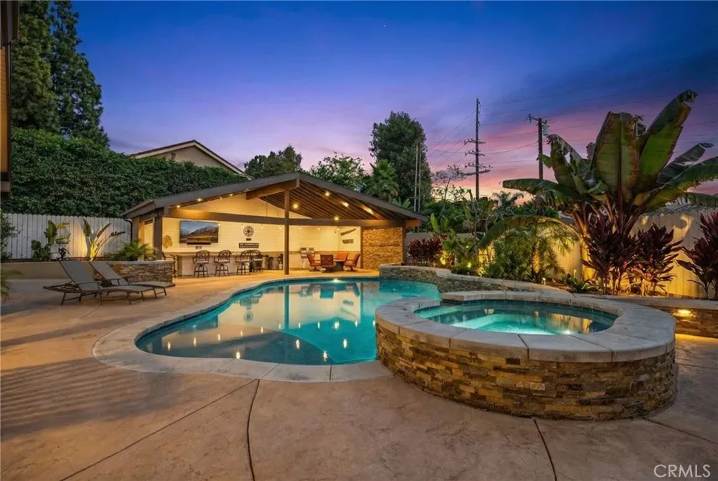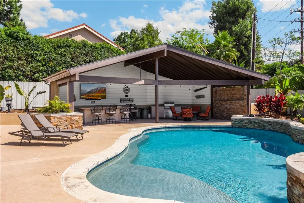 Tucked at the end of a quiet Brea cul-de-sac, this GORGEOUS custom single-story residence offers 5 bedrooms, 4 bathrooms, 3,274 sq ft, and an attached four-car garage. Completely reimagined in 2023—torn down to two walls and expanded by roughly 1,500 sq ft—it blends modern comfort with thoughtful design. Double doors open to an inviting entry, with a convenient three-quarter bathroom immediately to the right. From here, you step into the living room, where a vaulted ceiling with exposed beams frames a dramatic 25-ft LaCantina five-panel multi-slide door that disappears into the wall, creating seamless indoor-outdoor living. Motorized shades add ease and ambiance. The dining area enjoys the view to the back patio and sits between the living room and kitchen, keeping gatherings connected. The kitchen features Brazilian granite counters, custom cabinetry, a large island, and Viking appliances including a drink fridge and double oven. The primary suite feels like a retreat, offering its own 15-ft three-panel multi-slide door, a stunning bathroom with a soaking tub, a huge shower with three shower heads, and an oversized walk-in closet with built-in organizers. Down the hall are three guest bedrooms, a full bathroom, and a laundry room with a sink and cabinetry. The mother-in-law suite provides exceptional flexibility with its separate entrance, generous layout, handicap accessibility, and private bathroom. The backyard is built for year-round enjoyment with a PebbleTec saltwater pool and spa, a 40-ft by 18-ft peaked patio cover, and an outdoor kitchen featuring a custom 12-ft bar, built-in BBQ, and an 85″ Samsung TV with sound bar. Additional highlights include RV parking, a built-in speaker system throughout the home and yard, a 4-zone dual HVAC system, underground utilities, an exterior drainage system, and vaulted ceilings in all living areas and bedrooms. Nearby are award-winning schools, great restaurants, and abundant shopping options. Don’t miss this one!
