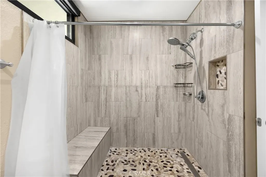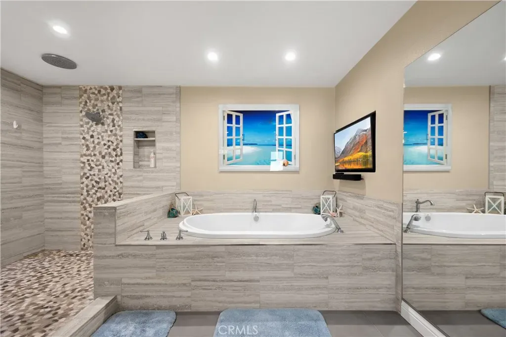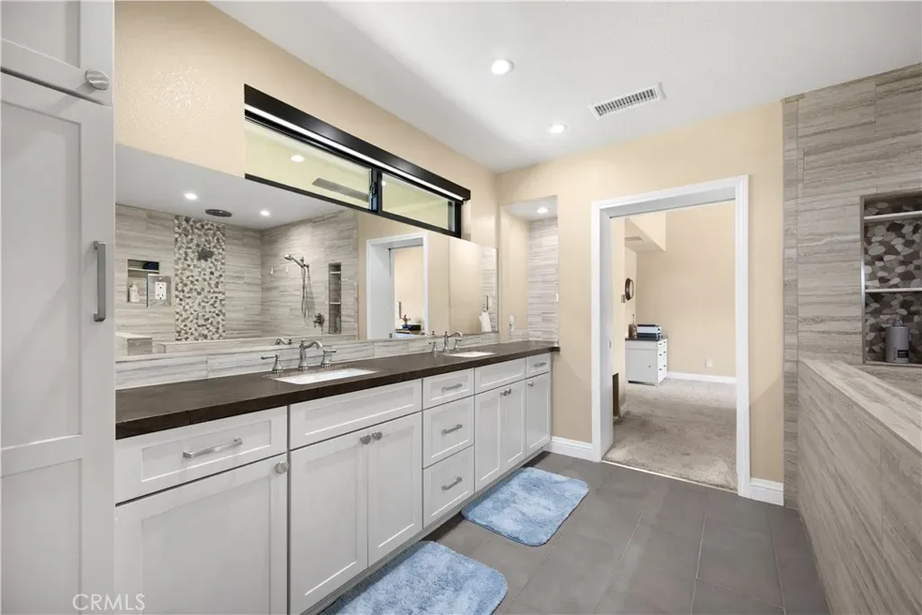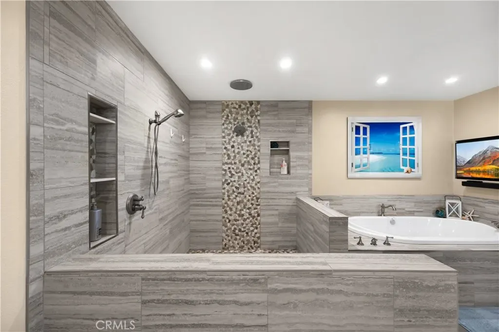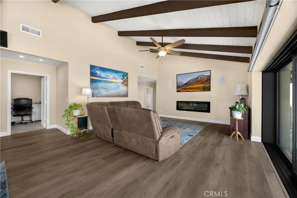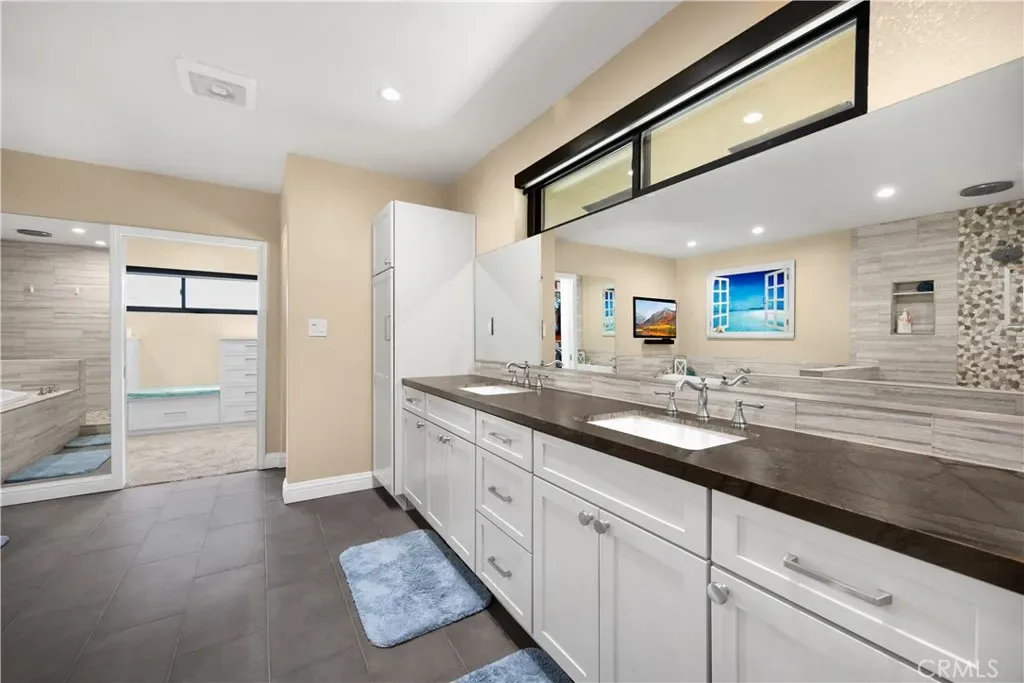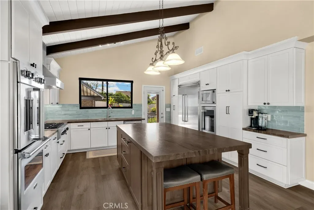 Tucked at the end of a quiet Brea cul-de-sac, this GORGEOUS custom single-story residence offers 5 bedrooms, 4 bathrooms, 3,274 sq ft, and an attached four-car garage. Completely reimagined in 2023—torn down to two walls and expanded by roughly 1,500 sq ft—it blends modern comfort with thoughtful design. Double doors open to an inviting entry, with a convenient three-quarter bathroom immediately to the right. From here, you step into the living room, where a vaulted ceiling with exposed beams frames a dramatic 25-ft LaCantina five-panel multi-slide door that disappears into the wall, creating seamless indoor-outdoor living. Motorized shades add ease and ambiance. The dining area enjoys the view to the back patio and sits between the living room and kitchen, keeping gatherings connected. The kitchen features Brazilian granite counters, custom cabinetry, a large island, and Viking appliances including a drink fridge and double oven. The primary suite feels like a retreat, offering its own 15-ft three-panel multi-slide door, a stunning bathroom with a soaking tub, a huge shower with three shower heads, and an oversized walk-in closet with built-in organizers. Down the hall are three guest bedrooms, a full bathroom, and a laundry room with a sink and cabinetry. The mother-in-law suite provides exceptional flexibility with its separate entrance, generous layout, handicap accessibility, and private bathroom. The backyard is built for year-round enjoyment with a PebbleTec saltwater pool and spa, a 40-ft by 18-ft peaked patio cover, and an outdoor kitchen featuring a custom 12-ft bar, built-in BBQ, and an 85″ Samsung TV with sound bar. Additional highlights include RV parking, a built-in speaker system throughout the home and yard, a 4-zone dual HVAC system, underground utilities, an exterior drainage system, and vaulted ceilings in all living areas and bedrooms. Nearby are award-winning schools, great restaurants, and abundant shopping options. Don’t miss this one!