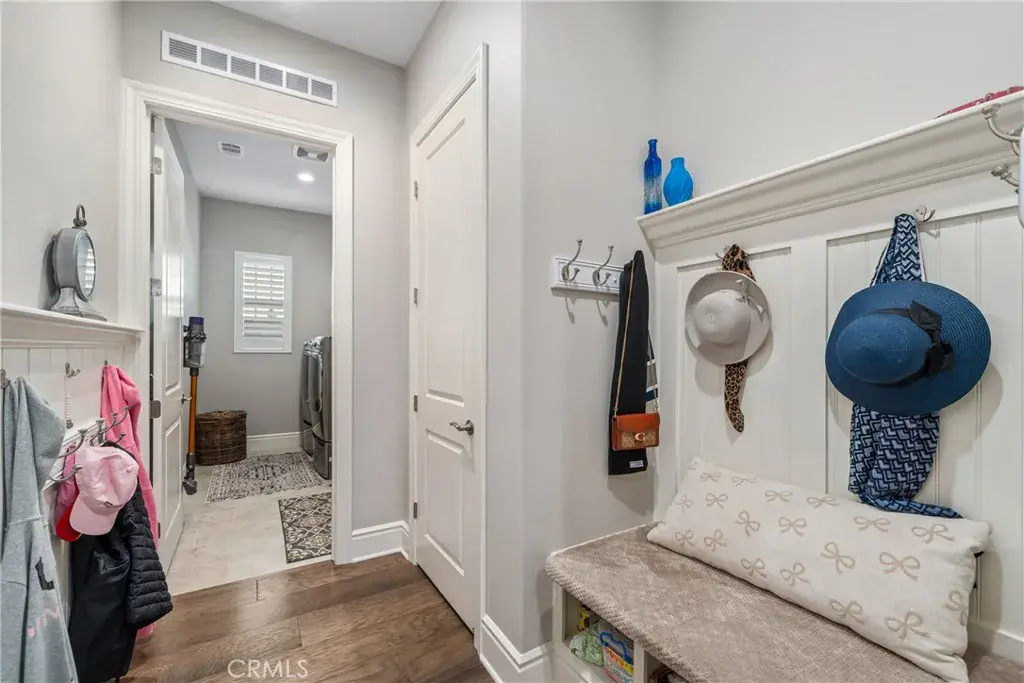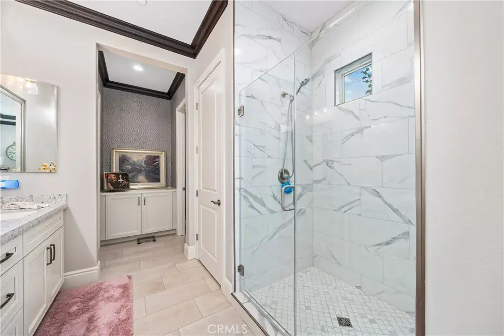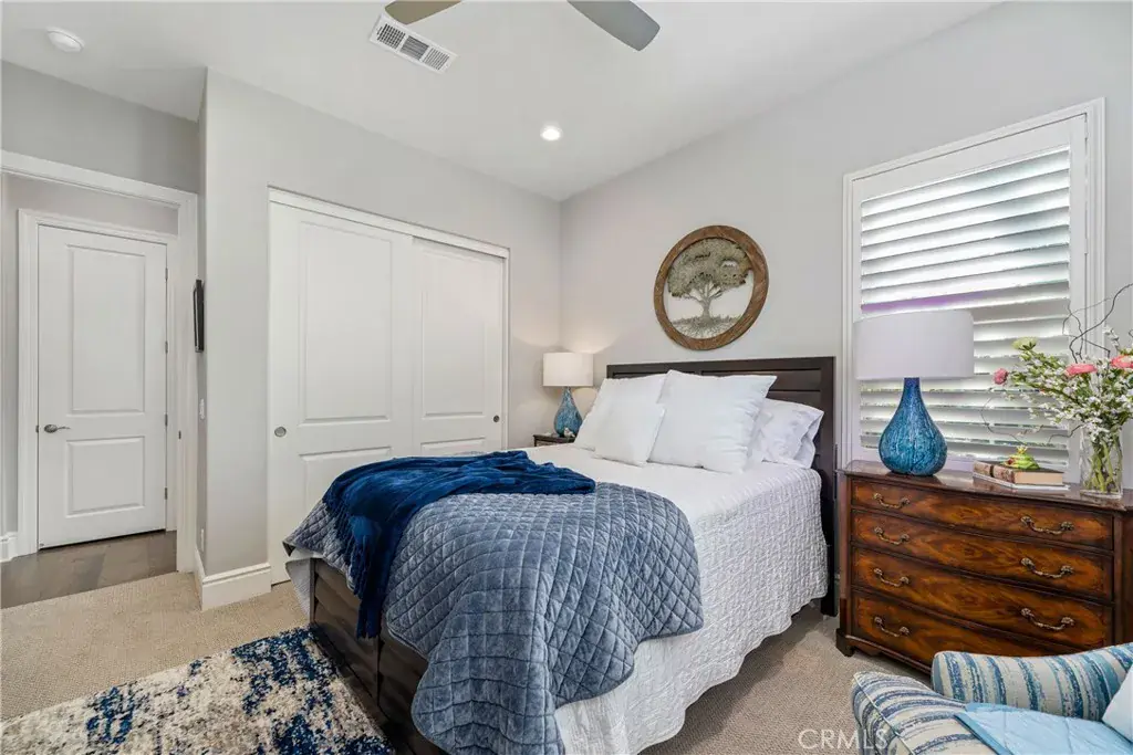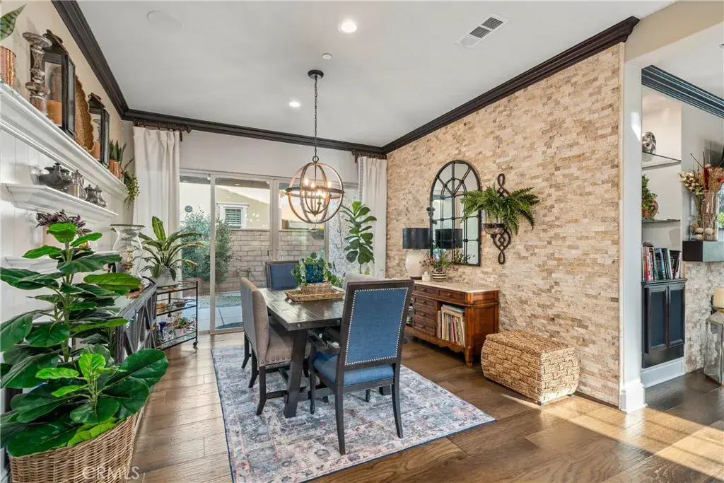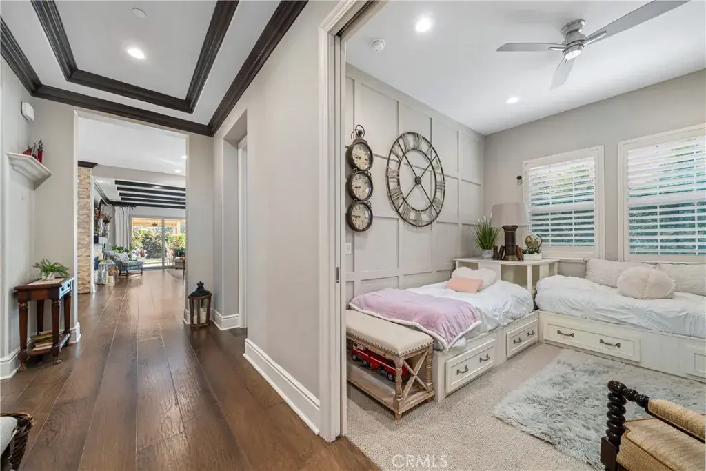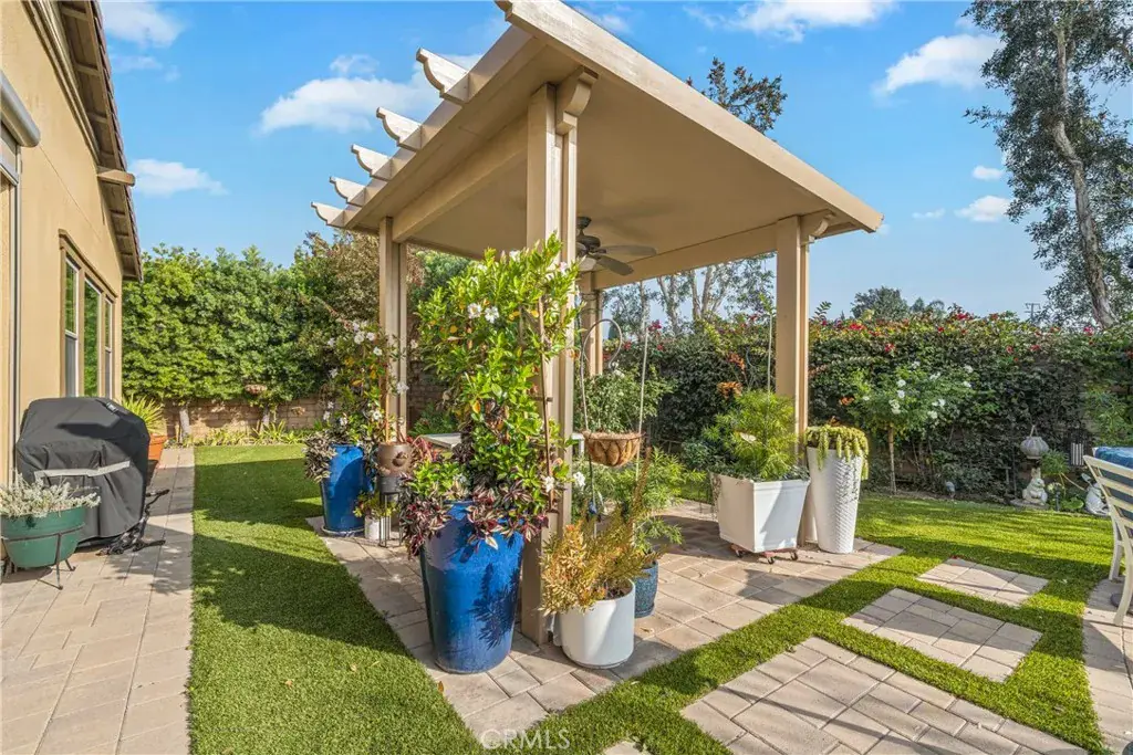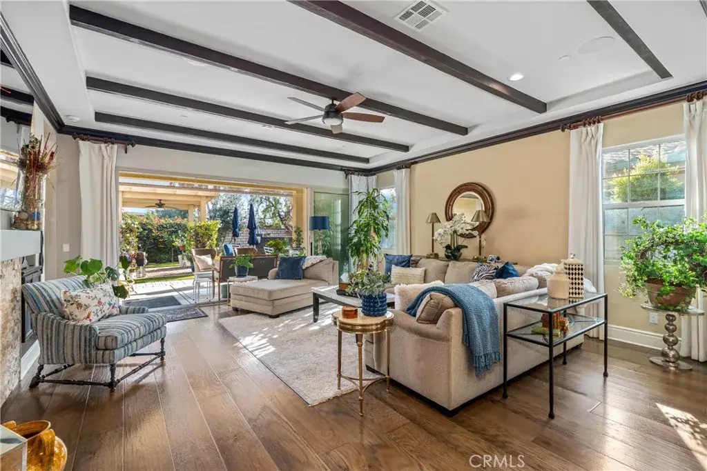 The family room is accented by striking wood beams and an impressive wall of sliding glass doors that span nearly the entire length of the space, opening almost completely to seamlessly blend indoor and outdoor living. Situated on a large lot, the backyard is an entertainer’s dream with a covered patio extension, pergola, lush grass area, mature fruit trees, and a private spa, ideal for relaxing or hosting gatherings.