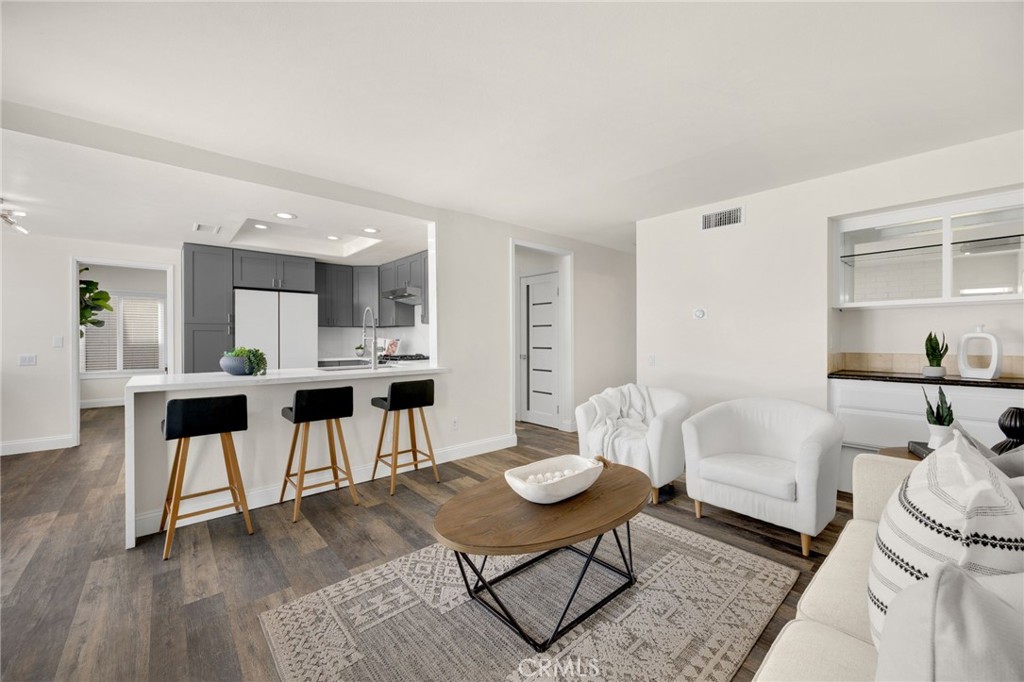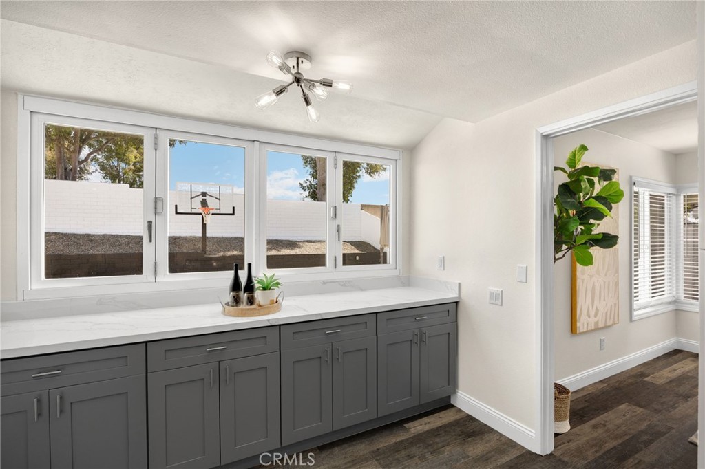 The updated kitchen features quartz countertops, Samsung appliances, a breakfast bar, and a buffet with an accordion window that opens to the backyard—creating the perfect setup for indoor-outdoor entertaining.