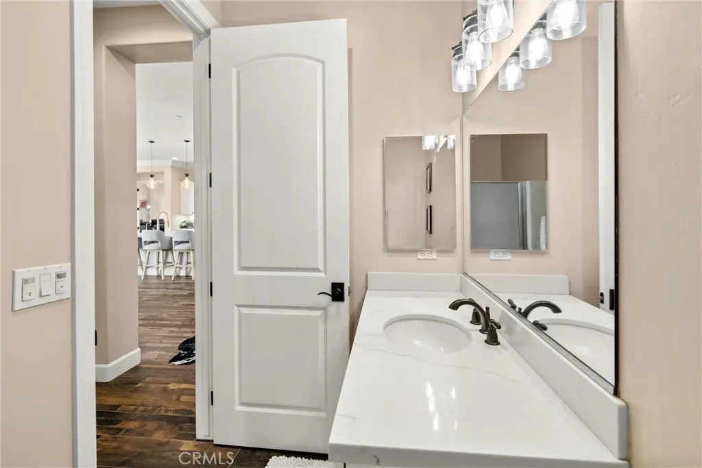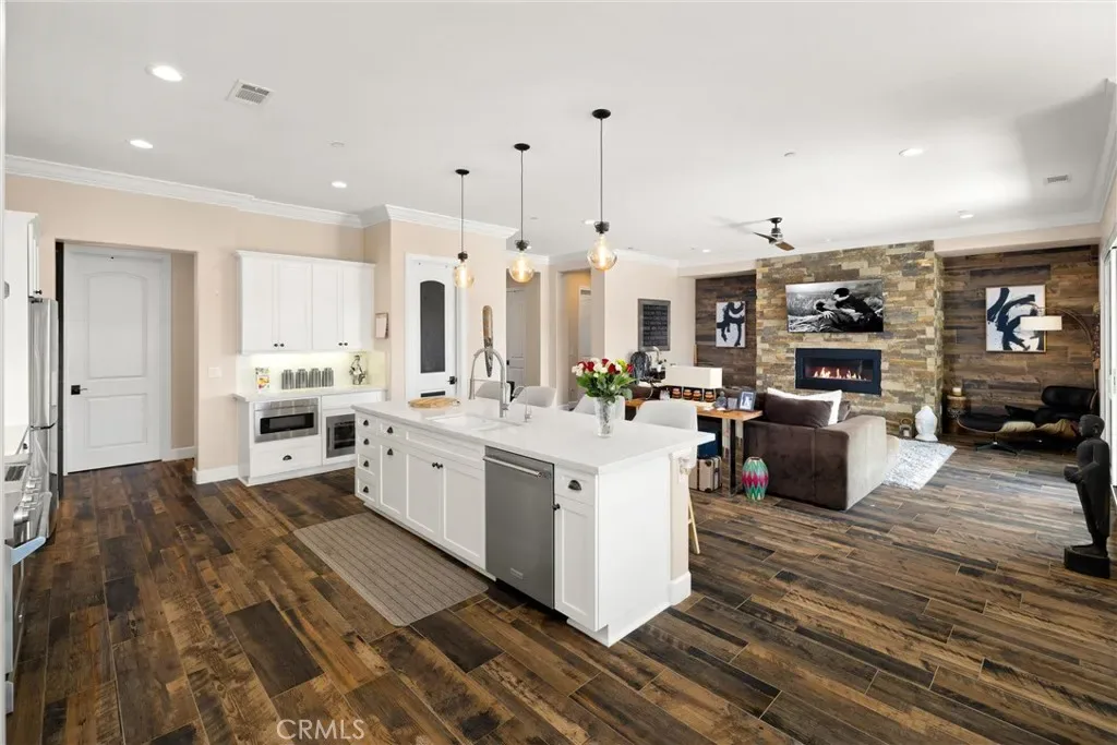 Step into a light-filled open floor plan with 10-foot ceilings and 8-foot solid-core doors, creating an immediate sense of space and sophistication. The gourmet chef’s kitchen is the heart of the home, featuring quartz countertops, custom soft-close cabinetry, premium appliances, and a wine refrigerator. The living room centers around a striking hand-cut stone fireplace, while durable wood-look tile flooring flows throughout, blending warmth with practicality.