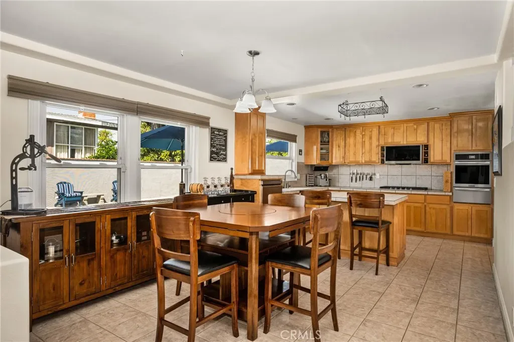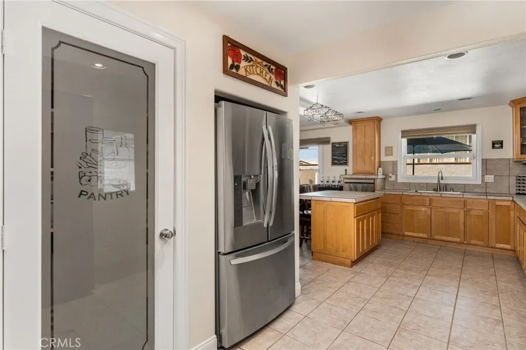 Step through the double-door entry into a warm and inviting interior featuring tile flooring and rich wood floors on the main level, with wood laminate flooring upstairs. The spacious kitchen is designed for both functionality and style, showcasing wood cabinetry, tile countertops, a center island, a large pantry, and newer stainless steel appliances, including a five-burner cooktop.