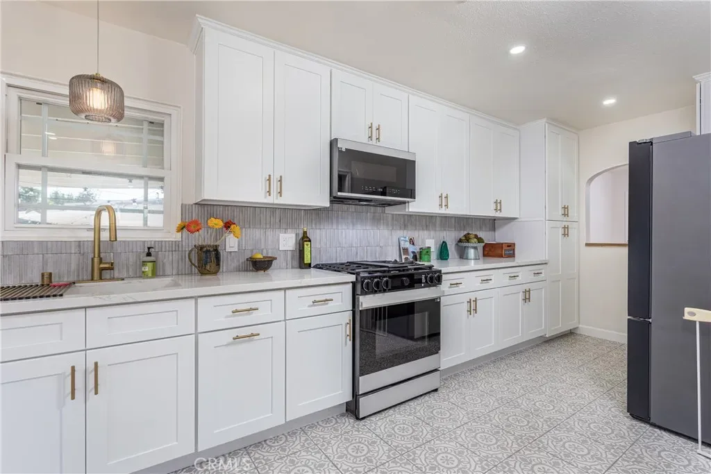The kitchen has been beautifully refreshed with new cabinets, countertops, backsplash, sink, and tile flooring, along with Samsung Bespoke appliances installed less than a year ago. Additional highlights include an electric fireplace, new awnings, rain gutters, driveway pavers, and an Aluma wood carport with pergola. Outdoor areas are set up for relaxing and entertaining, with a resurfaced patio (June), replastered pool with newer equipment (2016), lush new sod and sprinklers in the front yard, plus an electric car charger.