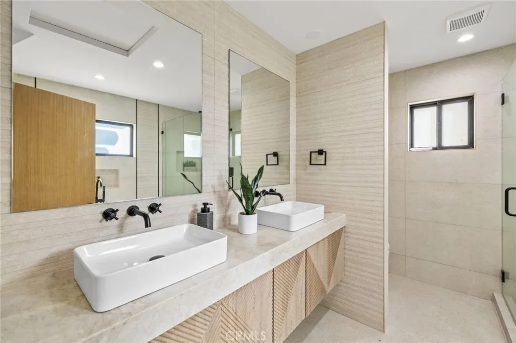 The primary suite offers a true retreat with two walk-in closets and a spa-inspired bathroom featuring a soaking tub, double vanity, and a custom-tiled shower that exudes elegance.