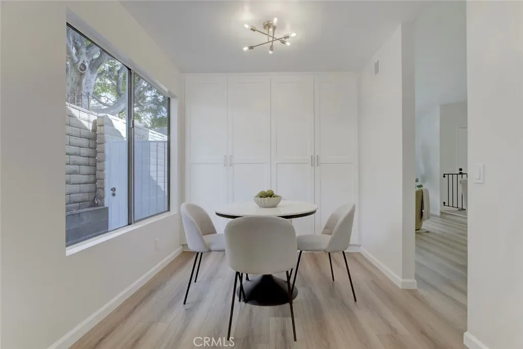 The fully renovated kitchen offers quartz countertops, soft-close cabinetry, brand-new appliances, a spacious pantry, and a cozy breakfast nook area. Just off the kitchen, an expansive family room/den opens through a large sliding glass door to the backyard, creating a seamless indoor-outdoor living experience.