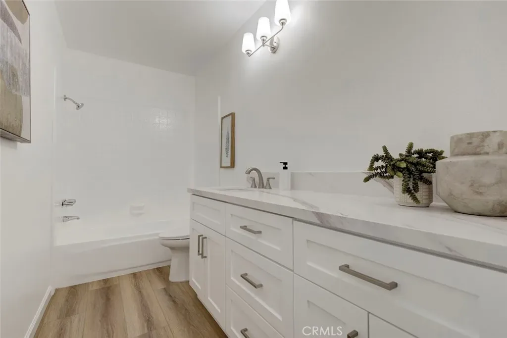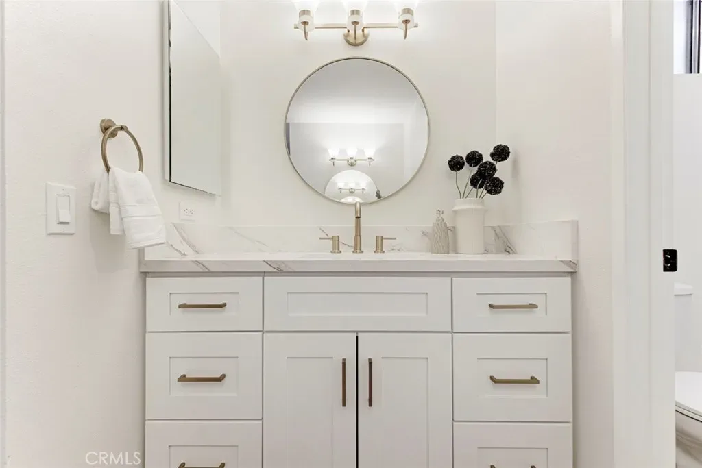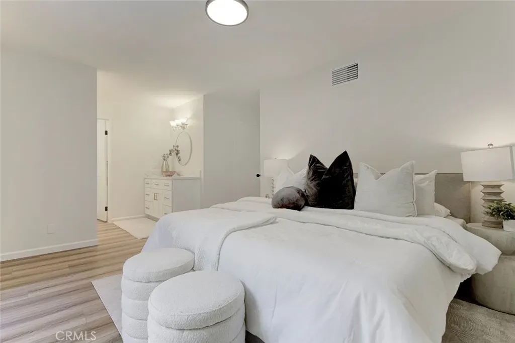 The primary suite includes a thoughtfully designed double vanity setup, with one sink and an additional dedicated space for personal use, along with a large sliding door providing direct access to the backyard. Additional highlights include updated flooring throughout, fresh interior and exterior paint, modern lighting fixtures, and upgraded bathroom vanities.