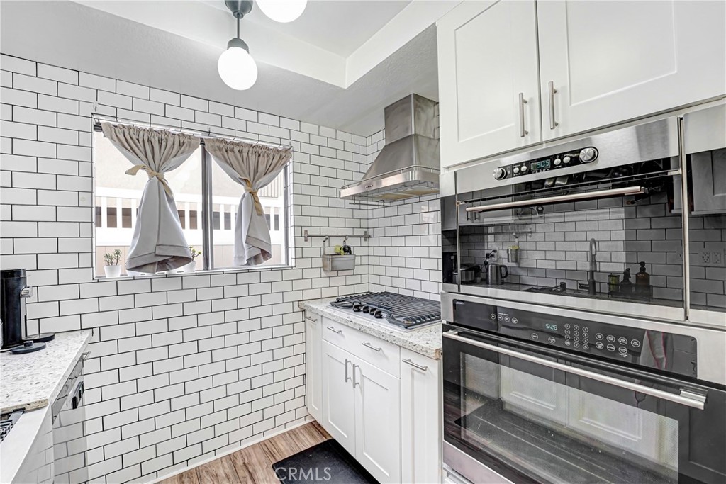 Upon entry, you’re greeted by a spacious open-concept living and dining area featuring a cozy brick fireplace, updated luxury vinyl plank flooring, and modern lighting throughout. The generously sized dining space flows seamlessly into a beautifully appointed custom kitchen, complete with subway tile backsplash, shaker cabinetry, stainless steel appliances, a double oven, gas range with hood, and dishwasher. Step outside to your private walk-out patio—an ideal spot to enjoy morning coffee, entertain guests, or soak up the California sunshine. A convenient downstairs half bath makes the main level perfectly suited for entertaining. Upstairs, a central landing offers abundant storage with custom closets and an in-unit stackable washer and dryer. The spacious primary suite easily accommodates a king-size bed and full bedroom furniture, and features wall-to-wall closet space. The attached, fully renovated bathroom includes a sleek glass-enclosed shower with a rain showerhead. The second bedroom is equally impressive, with easy access to another updated full bathroom—perfect for guests, family, or a home office. Completing the home are two gated garage parking spaces, making commuting effortless—though you may rarely need your car. This condo is just a short walk to Burbank Town Center, along with an abundance of shopping, dining, and nearby Griffith Park.