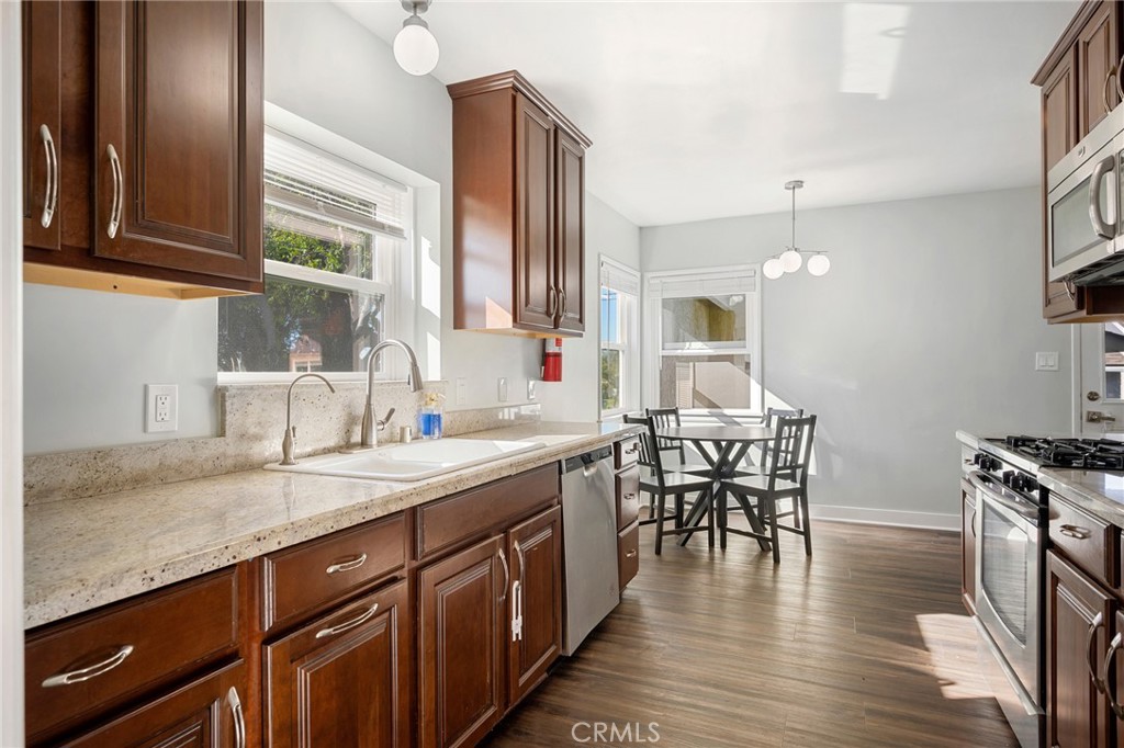 The interior features three bedrooms, a den, two bathrooms, a formal dining room, and a spacious living room, ideal for both comfortable living and entertaining. The kitchen is tastefully appointed with granite countertops, stainless-steel appliances, premium tile flooring, and a charming breakfast nook, seamlessly connecting to the main living areas.