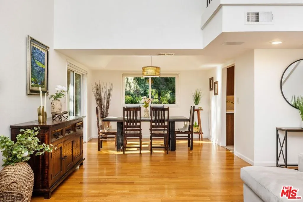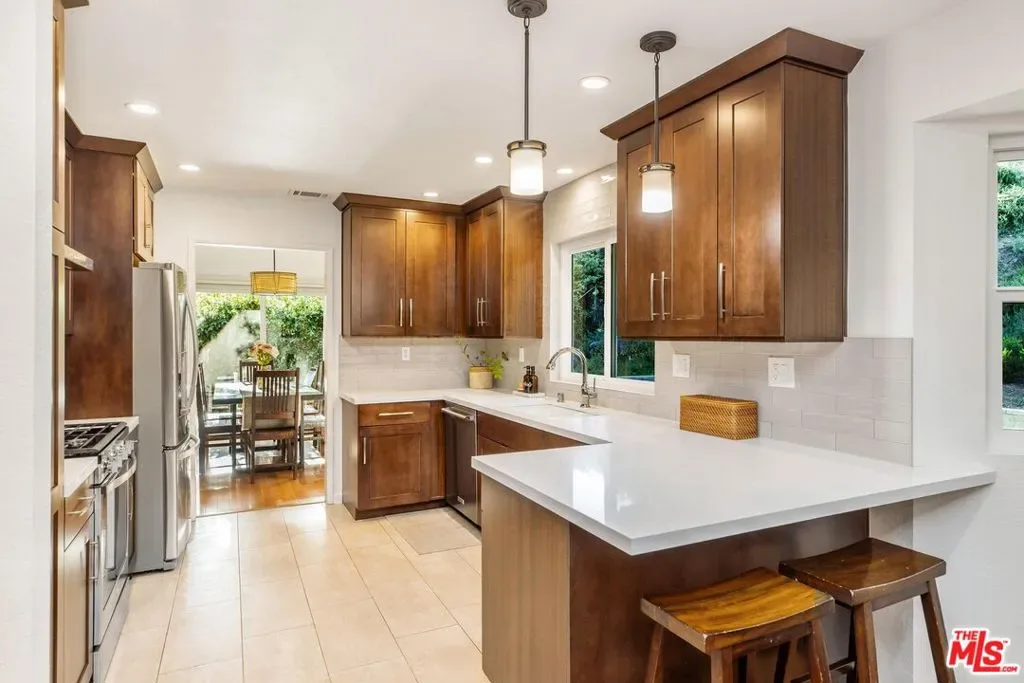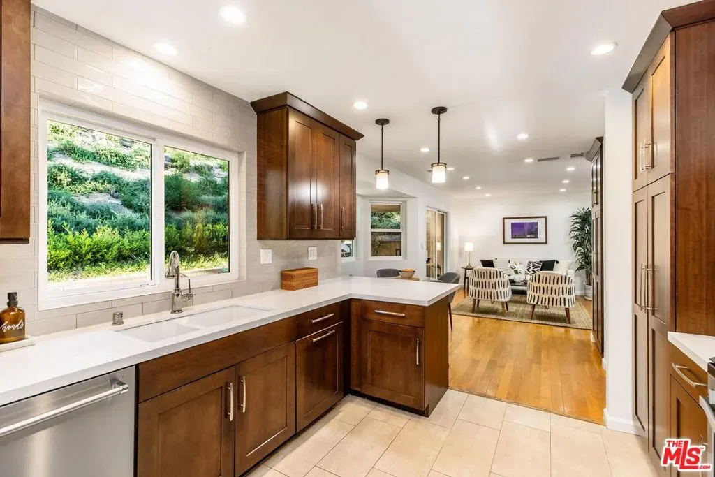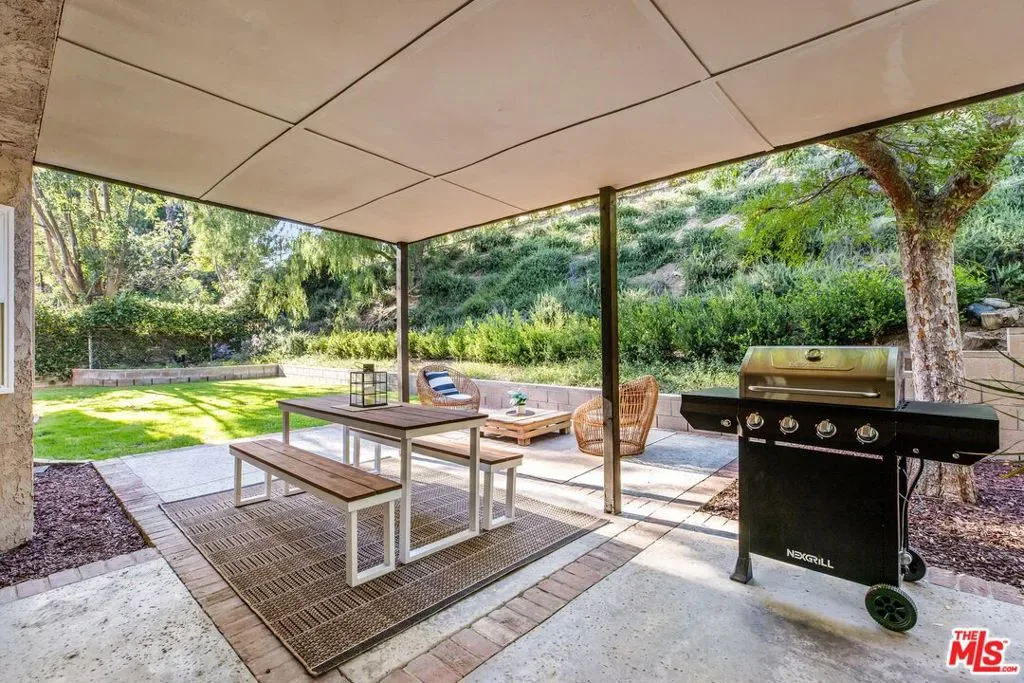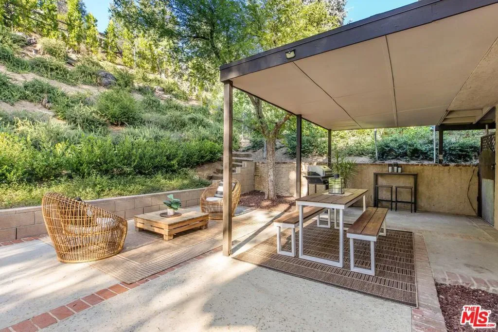 Set on a peaceful cul-de-sac in the hills of Burbank, this recently remodeled 4 BD/3 BA home showcases an expansive entertainer’s backyard, a thoughtfully designed floor plan, and elegant finishes throughout. Beyond the mature front landscaping, an inviting living room welcomes you with vaulted ceilings, a charming brick fireplace with a wood mantel, and rich wood flooring underfoot. The space flows seamlessly into a formal dining room highlighted by a tray ceiling and sliding glass doors that open to a side patio, perfect for effortless indoor-outdoor living. Just beyond, the bright kitchen offers abundant cabinetry, sparkling countertops, stainless steel appliances, and bar seating. Ideal for both quiet mornings and lively gatherings, it connects to an additional living area with a breakfast nook and sliding glass doors leading to a covered patio. A main-level bedroom, well-suited for an office or guest suite, and a sleek bathroom with a step-in shower complete the first floor. Upstairs, three bedrooms await, including a stunning primary suite featuring lofted ceilings, a walk-in closet with built-ins, and a private balcony with treetop and city views. The ensuite bath includes a dual vanity, generous storage, and a step-in shower with a bench. Two additional bedrooms offer ample closet space and share an updated full bath with a shower/tub combination. Outside, the private backyard feels like a retreat, with a secluded hillside backdrop, expansive lawn, multiple covered patios, and numerous areas for relaxing or entertaining. Additional highlights include a dedicated laundry room with side-by-side washer and dryer and a two-car garage with direct access to the kitchen. Located near award-winning schools, the Burbank Empire Center, and the shops and dining of Downtown Burbank, this meticulously maintained home offers comfort, style, and convenience in one exceptional setting.
