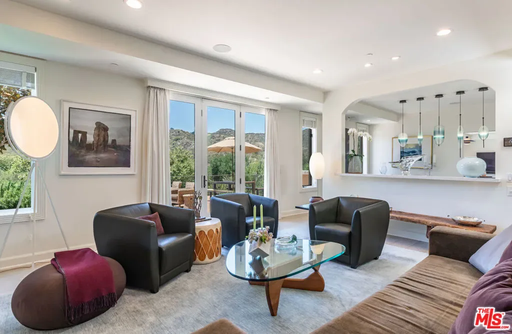 Tucked into the heart of the Santa Monica Mountains, this enchanting Mediterranean estate is a rare sanctuary where luxury and nature exist in perfect harmony. Set on 2.8 private acres along an exclusive gated lane in Monte Nido, shared with only two other prestigious estates, this serene retreat is close to acres of parkland and miles of trails – yet just minutes from iconic Malibu beaches. The setting is truly magical. Sweeping panoramic mountain views glow gold at sunset, while morning clouds roll gently over the ridgelines. A seasonal creek winds through the property, framed by mature oaks, California sycamores, citrus, and plum trees. Hummingbirds flit through the gardens, hawks soar above, and fish glisten in the entry fountain, creating a peaceful connection to nature. A grand courtyard entry opens to a warm, refined interior with soaring ceilings, Murano hand-blown glass lighting, and wide-plank hand-skived white oak floors throughout. The living room flows seamlessly to a large view terrace for indoor-outdoor living, while the elegant dining room features sculptural lighting inspired by Venice’s sky and sea. The light-filled kitchen overlooks the mountains and BBQ terrace and features an island, Thermador appliances, and a cozy seating area with TV. The main-level primary suite is a tranquil retreat with pool and spa views, a spa-like bath with soaking tub and separate shower, and a walk-in closet. A second bedroom or office and full bath complete the main level. Upstairs are three additional bedrooms with stunning views, two full baths, a laundry room, and extra storage. Thoughtfully upgraded with premium systems and finishes, the home is conveniently located near Calabasas shopping, the 101, and within the award-winning Las Virgenes School District, close to Viewpoint, Muse, and Pepperdine University. A peaceful mountain escape offering refined living, natural beauty, and effortless access to the coast without the pace of city life.