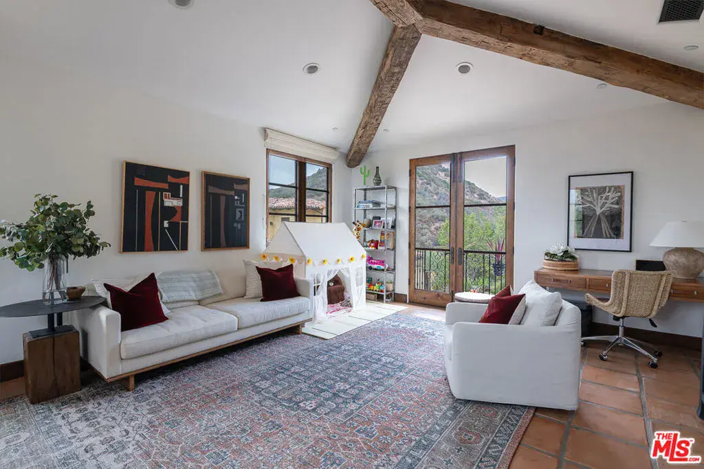 A timeless opportunity in the prestigious Malibu Canyon area of Calabasas. This privately gated nearly 5-acre Spanish Revival Hacienda offers an unparalleled retreat and breathtaking views, conveniently situated minutes between Malibu Canyon and Mulholland for effortless access to both Malibu and Calabasas including the award-winning Las Virgenes school system and renowned private institutions. This custom architectural masterpiece, designed by celebrated architect Doug Burdge, AIA, showcases exquisite craftsmanship and stunning interiors curated by award-winning designer Tammy Randall Wood, ASID. The main house features five bedrooms and six bathrooms, including a luxurious primary suite with a rotunda retreat, French doors, and a spectacular spa bath with marble accents that boasts an eagle clawfoot tub extending into endless mountain views. Entertainment options abound, including a state-of-the-art movie theater equipped with a 4K projector and JBL surround sound, as well as a stunning 1200-bottle wine cellar, underground storage and safe room, and a home gym. Outdoor amenities include a mountain-view heated saltwater pool and spa, a bocce court, and an outdoor kitchen with a professional 8-burner Viking grill, all set against expansive flagstone decking, eight patios, and beautifully landscaped grounds featuring pepper trees, olive trees, and vibrant flora. The property abuts thousands of acres of conservation land, ensuring unobstructed views and tranquility. Equipped with a Control4 Smart Home system, this estate offers seamless control of gates, cameras, and sound systems, complemented by a whole-home audio system, a 14-zone camera system, and an advanced security system. The separate guest house offers one bedroom, one bathroom, a full kitchen, two balconies, and exudes the same luxurious finishes as the main residence. With a total of four garages two in the main house and two in the guest house this estate provides ample parking including a gated motor court which can accommodate up to 10 vehicles. Immersed in unique architectural details which encompass antique barn beams, handmade Mexican Saltillo tile floors, and custom wrought iron elements throughout. Additionally, the estate features seven tranquil fountains, including custom Spanish-tiled installations, advanced HVAC systems, and whole-home water softening and purification systems. Experience luxury living at its finest in this unparalleled estate that beautifully blends sophistication, comfort, and natural beauty.