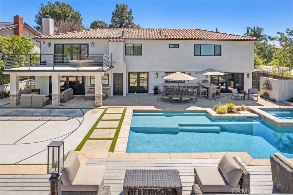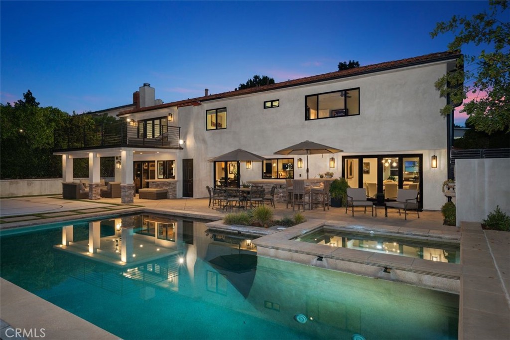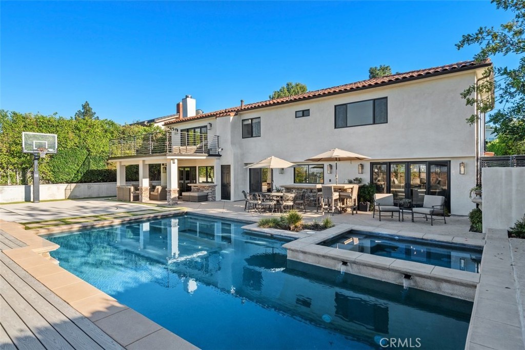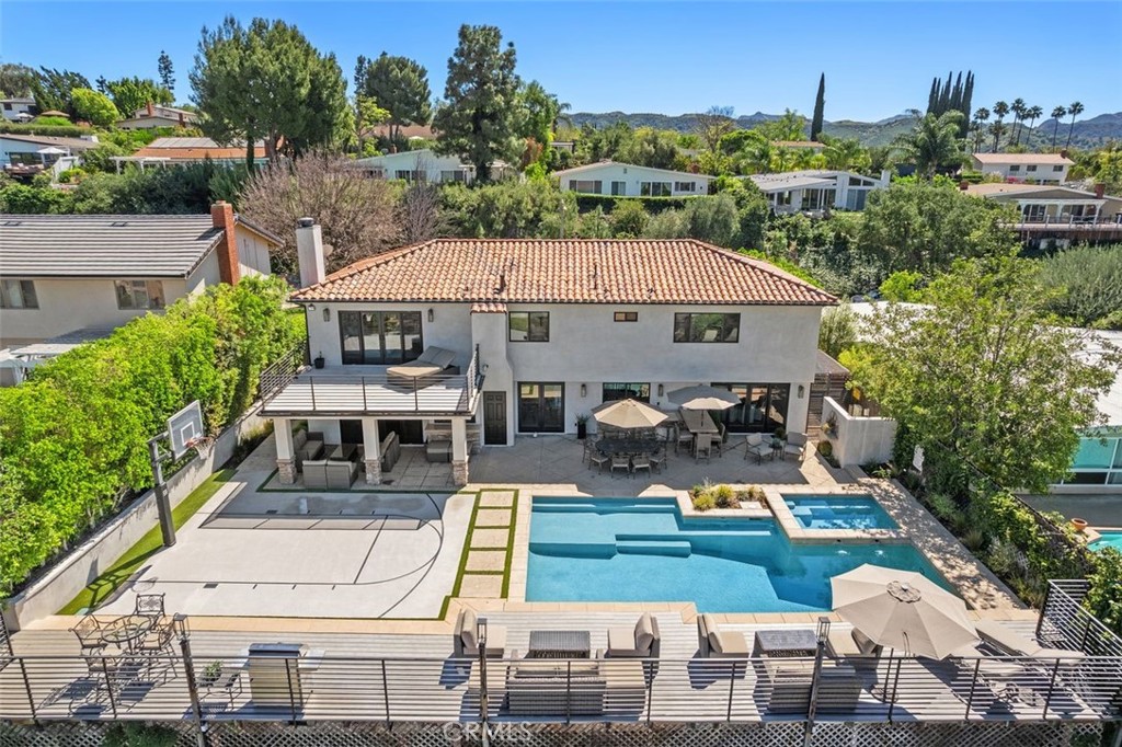 A rare offering in prime Mulwood with VIEWS, this warm Spanish style property is designed for effortless indoor-outdoor living and unforgettable entertaining. Spanning nearly 3,700 square feet, this home features 5 bedrooms and 5.5 bathrooms, including a desirable downstairs bedroom. The size, views and bedroom count are a unique find in Mulwood! A charming front courtyard welcomes you into a light-filled interior with several spots to gather, including a salon with a pool table and bar, a light and bright den and a more formal sitting area that flows into the courtyard. Newer glass doors throughout allow for a seamless flow to the outdoors. The layout is ideal for both everyday comfort and elevated entertaining. Upstairs, the spacious primary suite offers a private retreat with a cozy fireplace, walk-in closet, balcony, and sweeping views. Two of the three additional upstairs bedrooms include en-suite baths, providing both privacy and flexibility. The resort-style backyard is complete with a pool, oversized spa, covered patio, deck, half sport court, and a covered dog run – perfectly blending function and lifestyle. A finished 3 car garage currently serves as a gym, adding even more versatility. The downstairs bedroom has its own full bathroom and is ideal for multi generational living or an office. With its rare size, unique Spanish character, and exceptional indoor-outdoor experience, this is a standout offering in one of Calabasas’ most sought-after neighborhoods. Truly a special home ready for you to make lifelong memories! In close proximity to all three assigned public schools and Gelson’s shopping center, this property really has it all!