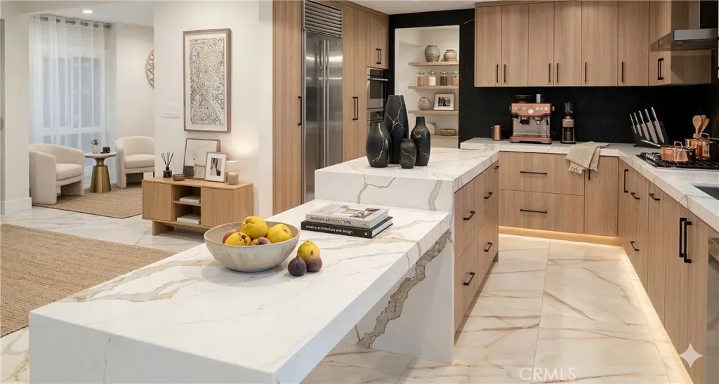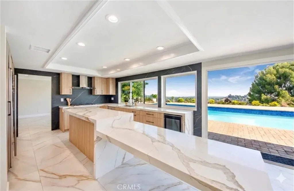 At the heart of the home is a custom gourmet chef’s kitchen, a true showpiece outfitted with premium Wolf appliances, a Sub-Zero refrigerator, waterfall-edge countertops with accent lighting, and dramatic accordion-style glass doors that create a seamless indoor-outdoor living experience.