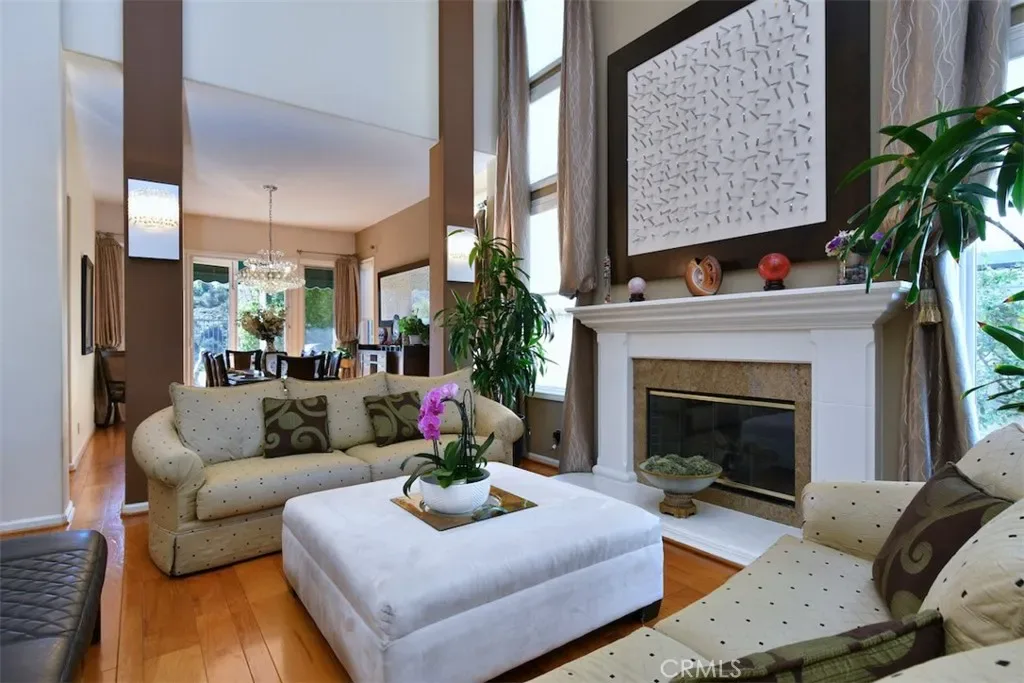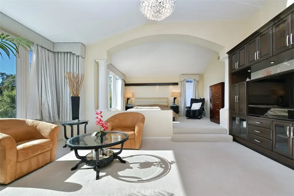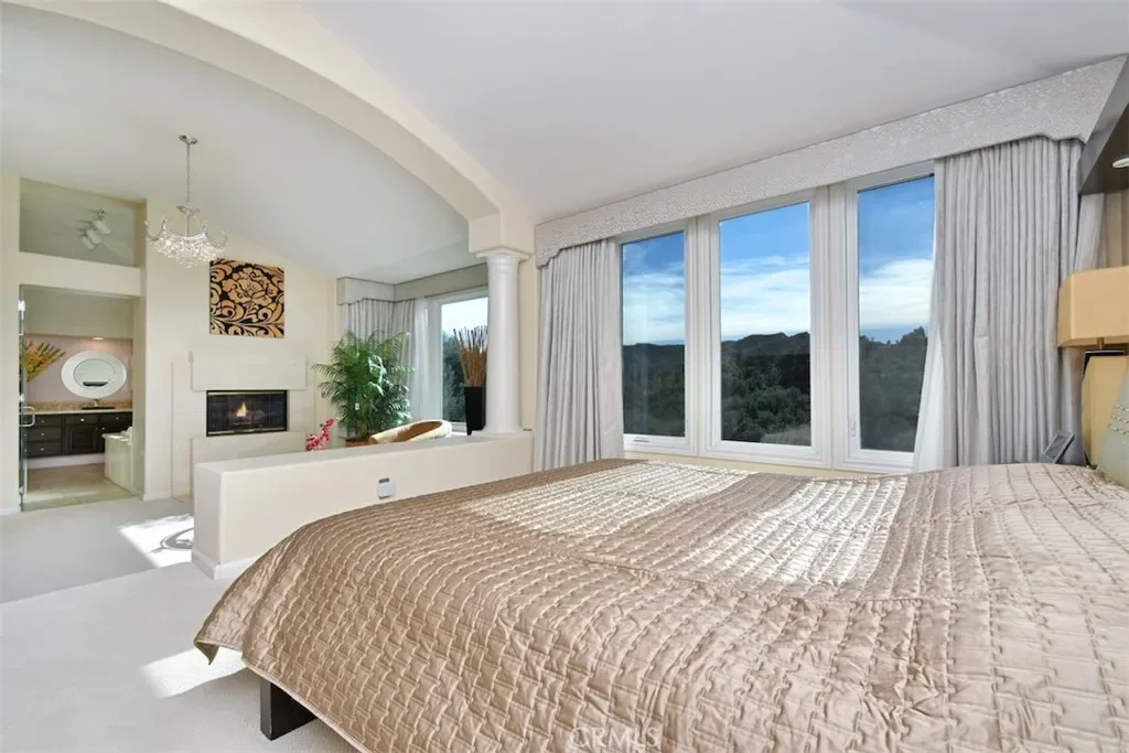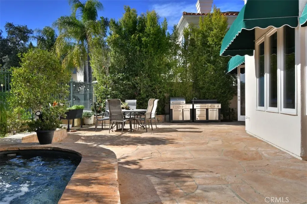 Located in the prestigious Bellagio Community, this elegant Mediterranean estate showcases exceptional design, privacy, and sweeping views. Offering approximately 3,560 square feet of light-filled living space, this residence presents a rare opportunity within one of Calabasas’ most coveted communities. The home features five bedrooms and four baths, including a highly desirable main-level bedroom with a full bathroom—ideal for guests, multigenerational living, or a private home office. An expansive open floor plan is highlighted by soaring two-story ceilings, abundant natural light, recessed LED lighting throughout, and multiple fireplaces. Formal living and dining rooms flow seamlessly into a chef’s kitchen, complete with an eat-in island, breakfast nook, wet bar, and extensive custom cabinetry with built-in desks and designer storage. The luxurious primary suite is a true retreat, offering mountain and countryside views, a custom bed frame, a double-sided fireplace, and a spa-inspired bathroom with a jacuzzi tub and adjoining steam bath/sauna. A spacious laundry room and beautifully appointed secondary bedrooms complete the interior. Recent upgrades include a tankless water heater, Tesla charger, solar system with 36 panels, Milgard fiberglass windows in select bedrooms, a Flume water-leak detection system, Rachio smart sprinkler timer, and updated window treatments throughout most of the home. The private resort-style grounds are equally impressive, featuring lush landscaping, stone patios, a tranquil outdoor waterfall, an in-ground heated spa, and a built-in BBQ—perfect for both entertaining and everyday enjoyment. Offering a refined blend of elegance, comfort, and modern efficiency, this exceptional estate is set within one of the most sought-after neighborhoods in the highly acclaimed Las Virgenes School District.