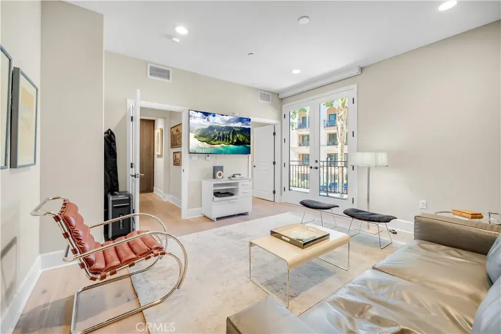 Set within one of Avanti’s most desirable locations—nestled in the heart of the gated community and overlooking the pool and lake grounds—this coveted single-level flat offers serene, tree-lined views. Architect- and designer-owned, and thoughtfully upgraded throughout , the residence combines a light-filled, open-concept floor plan with well-defined private spaces. A semi-private elevator opens directly into your own vestibule, leading to an interior designed for both comfort and privacy, with bedrooms thoughtfully placed on opposite wings. Tall ceilings, LED lighting, wide-plank oak floors, and designer wall colors extend throughout. Custom door and window coverings extend floor to ceiling. The chef’s kitchen features Thermador appliances, an oversized quartz island for serving and entertaining, and elegant under-cabinet lighting. In the great room, a custom Poliform shelving and TV system enhances both style and function, while French doors in every room open to Juliet balconies that bring the outdoors in, along with a covered patio—ideal for dining al fresco, enjoying morning coffee, or watching evening sunsets. The large oak tree provides added privacy and views. The primary suite enjoys tranquil treetop views overlooking the picturesque lake grounds in the distance. Its en-suite, spa-like bathroom showcases honed limestone floors and counters, dual sinks, a soaking tub, a separate rimless glass shower, and a sleek, Italian-inspired upgraded walk-in closet designed by California Closets. Just outside the primary suite, a built-in workspace offers extended counter space.