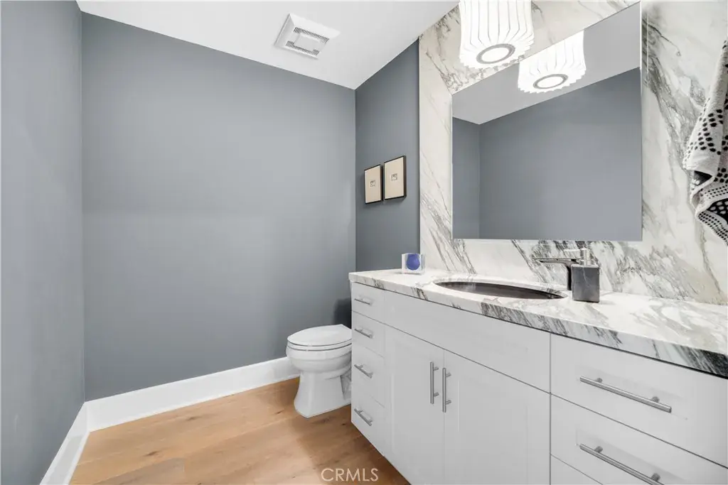 The secondary bedroom offers versatility with custom built-in bookcases, and closet along with two hidden Murphy beds and a reimagined walk-in closet transformed into a home office. The powder bath makes a striking impression, with Carrara marble extending from counter top to ceiling.