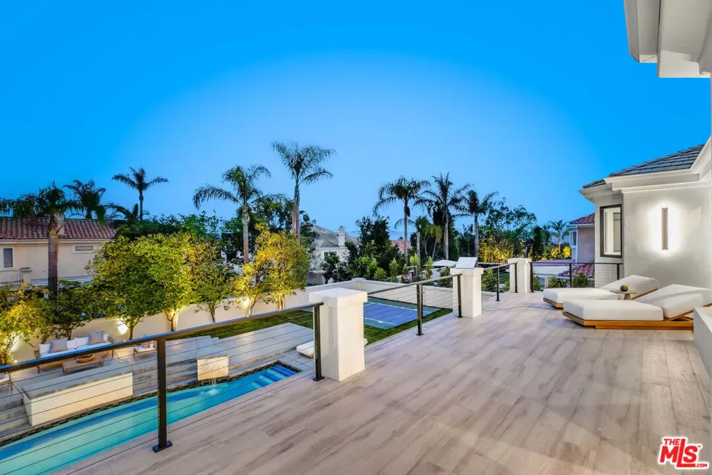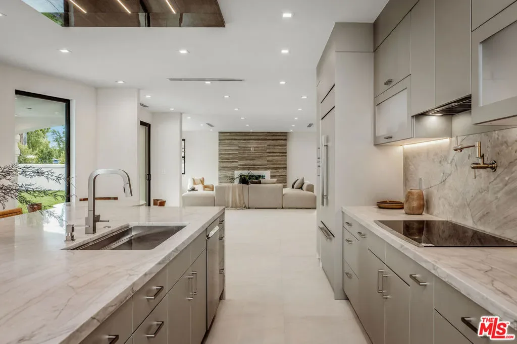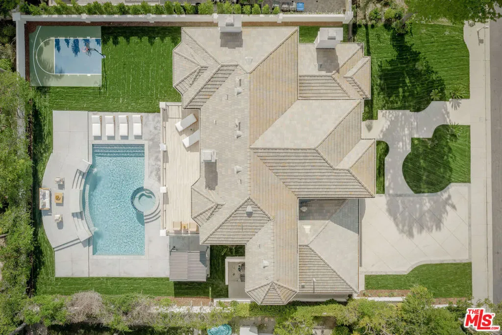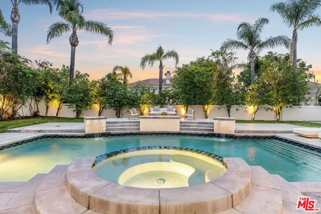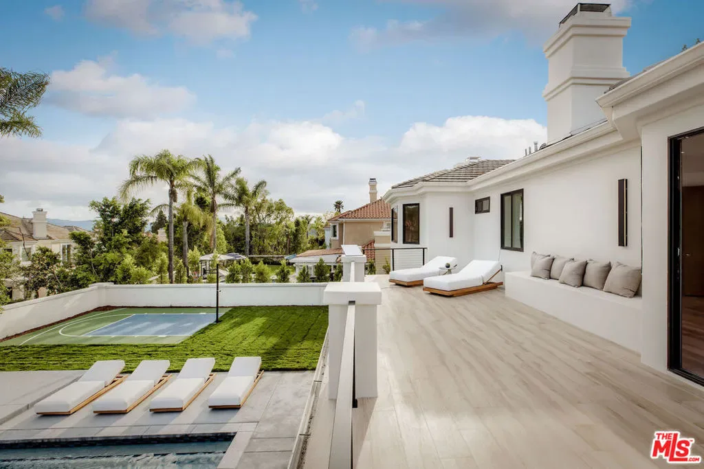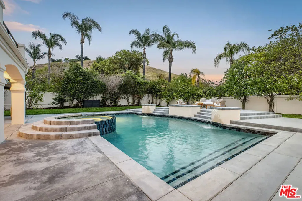 Newly completed 2026 designer remodel in guard-gated Mountain View Estates, adjacent to Hidden Hills. Set on a quiet cul-de-sac, this ELM Studio Homes renovation, designed and built by ELM Studio Homes, blends modern architecture with warm, organic finishes. A striking pivot entry opens to a dramatic two-story foyer, anchored by custom wood detailing and clean, contemporary lines throughout. The state-of-the-art kitchen features a waterfall stone island, integrated appliances, and opens seamlessly to the family room with a floor-to-ceiling travertine fireplace and indoor-outdoor flow. Formal living and dining spaces are refined yet inviting. The expansive primary suite offers a private terrace, a fireplace, and a spa-inspired bath with dual vanities, a soaking tub, and an oversized shower. Resort-style grounds include a pool, lounge areas, and a basketball court, creating a true entertainer’s setting. Located moments from award-winning Las Virgenes schools, dining, and Malibu beaches.