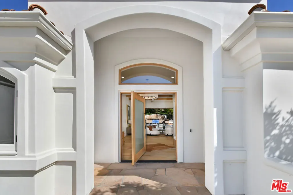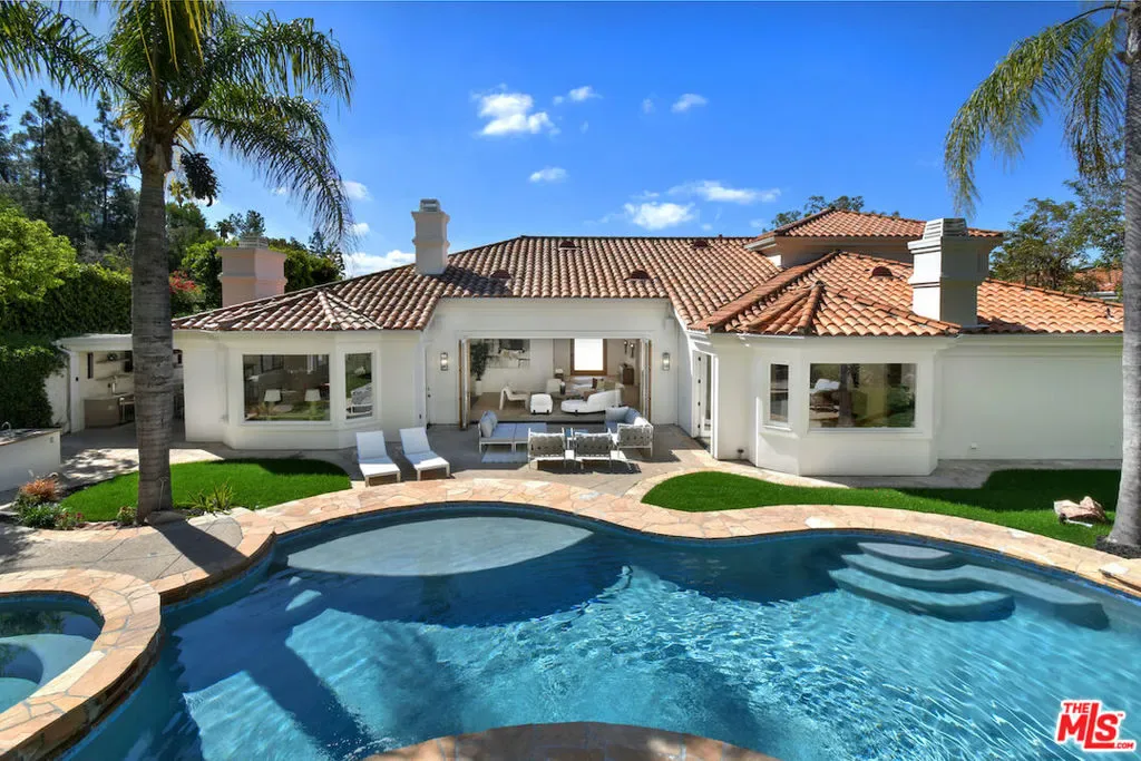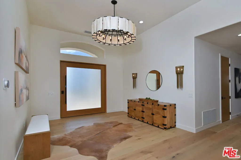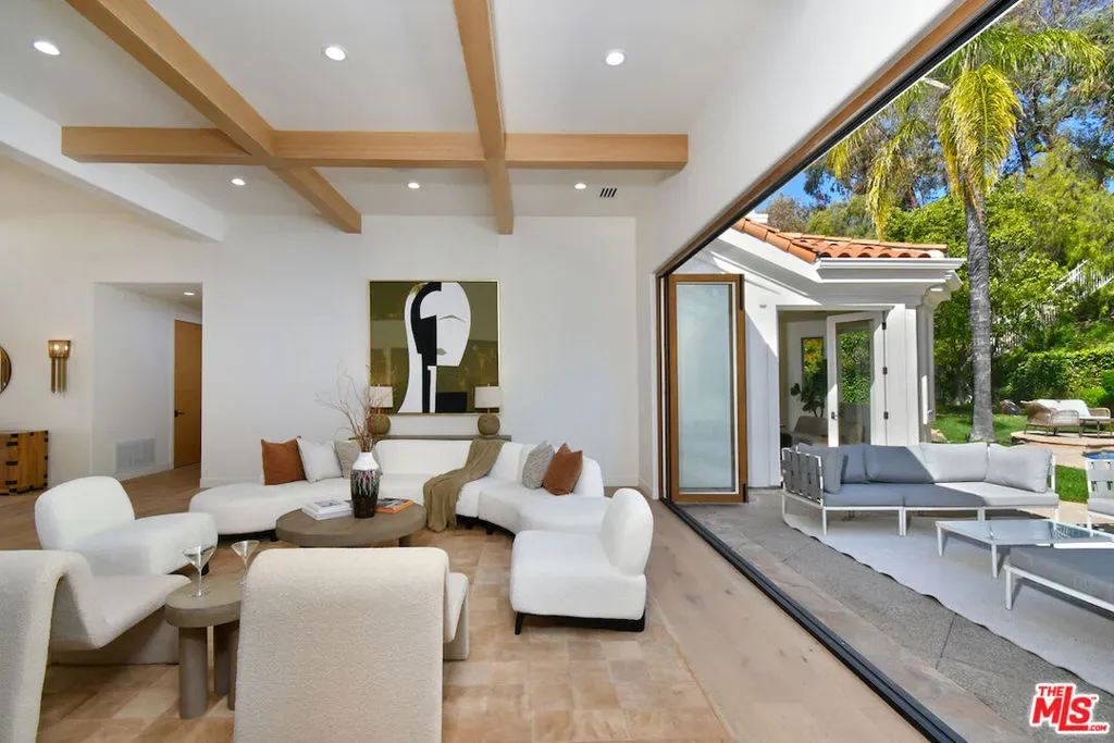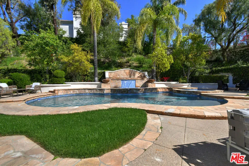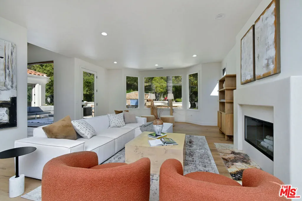 Absolutely stunning single-story residence tucked away on a quiet cul-de-sac within the prestigious 24-hour guard-gated Mountain View Estates in prime Calabasas. This newly renovated approx. 4,750 sq ft home offers 5 bedrooms and 6 baths on an expansive 18,300 sq ft corner lot, seamlessly blending modern luxury with quintessential California indoor-outdoor living. A dramatic pivot entry door opens to a light-filled showplace featuring soaring ceilings, wide-plank hardwood floors, and oversized retractable doors that create effortless flow to the outdoors. The expansive chef’s kitchen is the heart of the home, showcasing a large center island, Taj Mahal quartzite countertops, custom cabinetry, brand-new Viking appliances, designer lighting, and an inviting dining area. The kitchen opens to a spacious family room with a custom wet bar, ice maker, beverage refrigerator, chic fireplace, and picturesque oversized window. Designed for entertaining, the formal dining room comfortably hosts large gatherings and holiday celebrations, while the formal living room exudes organic modern elegance with wood-beamed ceilings, a sleek Venetian plaster fireplace, and direct access to the lush backyard. The primary suite is a private retreat featuring a marble fireplace, spa-inspired bath with glass-enclosed shower, freestanding soaking tub, electric toilet, and dual walk-in closets. Three additional bedrooms are generously sized and ensuite. The oversized fifth bedroom offers flexibility as a bonus room, media room, or in-law suite. Additional highlights include a large utility room and 3-car garage with epoxy flooring and custom lighting. The resort-style backyard is designed for year-round enjoyment, featuring a covered outdoor dining pavilion with large-screen TV, serving area, beverage refrigerator, and beer tap. The redesigned pool and spa with Baja shelf, fire and water features, built-in BBQ, grassy play areas, and multiple entertaining zones complete this exceptional property. A rare opportunity to own a turnkey, one-story estate that truly checks every box; style, function, and setting.