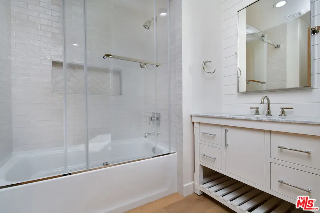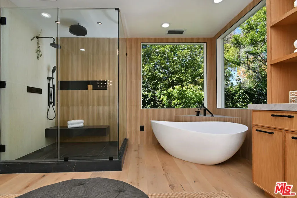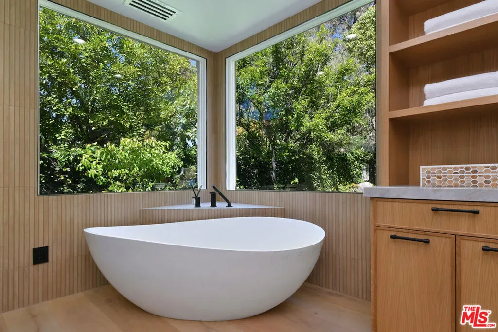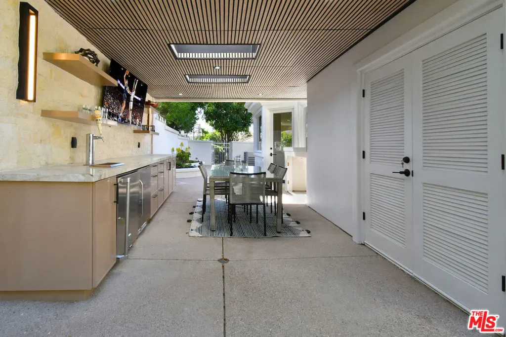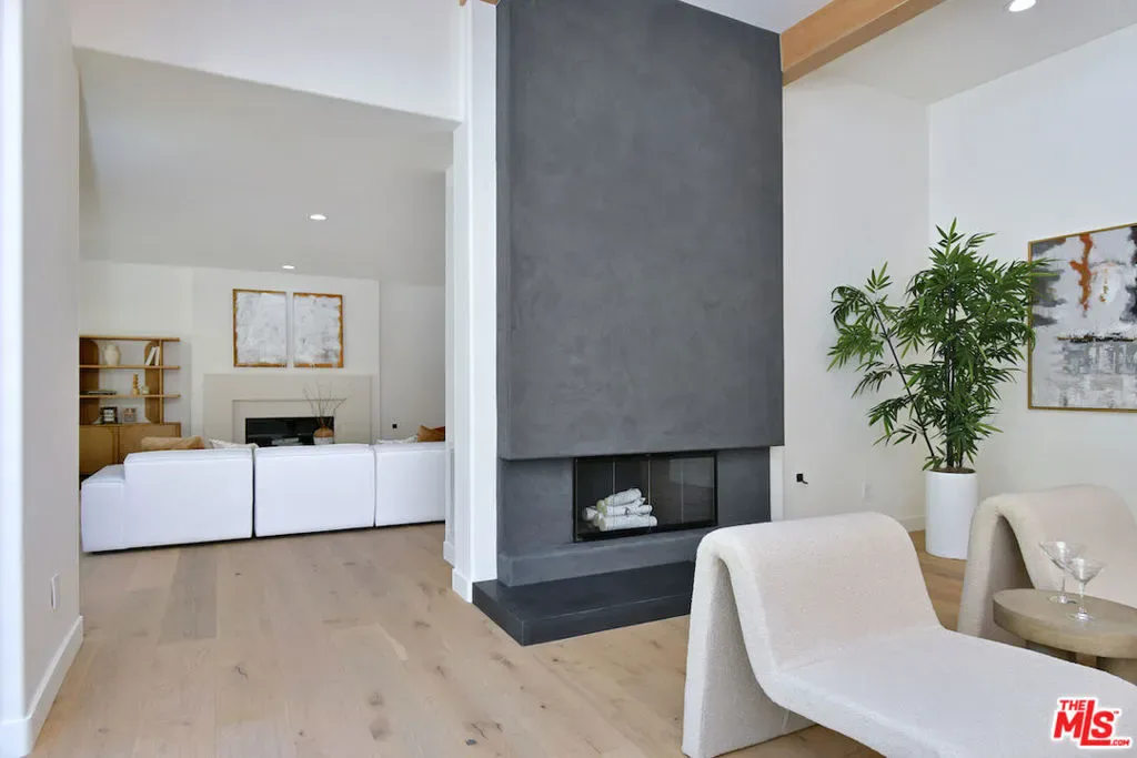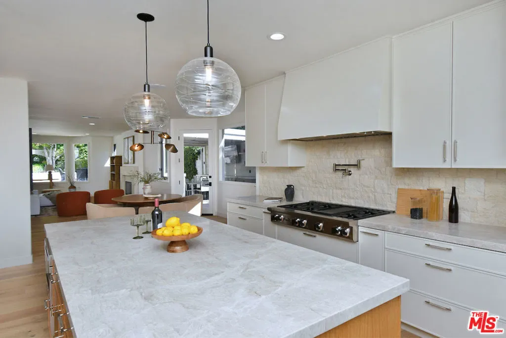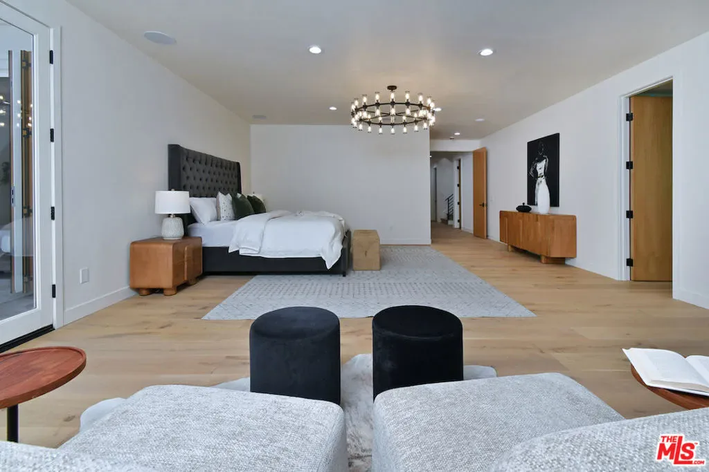 Absolutely stunning single-story residence tucked away on a quiet cul-de-sac within the prestigious 24-hour guard-gated Mountain View Estates in prime Calabasas. This newly renovated approx. 4,750 sq ft home offers 5 bedrooms and 6 baths on an expansive 18,300 sq ft corner lot, seamlessly blending modern luxury with quintessential California indoor-outdoor living. A dramatic pivot entry door opens to a light-filled showplace featuring soaring ceilings, wide-plank hardwood floors, and oversized retractable doors that create effortless flow to the outdoors. The expansive chef’s kitchen is the heart of the home, showcasing a large center island, Taj Mahal quartzite countertops, custom cabinetry, brand-new Viking appliances, designer lighting, and an inviting dining area. The kitchen opens to a spacious family room with a custom wet bar, ice maker, beverage refrigerator, chic fireplace, and picturesque oversized window. Designed for entertaining, the formal dining room comfortably hosts large gatherings and holiday celebrations, while the formal living room exudes organic modern elegance with wood-beamed ceilings, a sleek Venetian plaster fireplace, and direct access to the lush backyard. The primary suite is a private retreat featuring a marble fireplace, spa-inspired bath with glass-enclosed shower, freestanding soaking tub, electric toilet, and dual walk-in closets. Three additional bedrooms are generously sized and ensuite. The oversized fifth bedroom offers flexibility as a bonus room, media room, or in-law suite. Additional highlights include a large utility room and 3-car garage with epoxy flooring and custom lighting. The resort-style backyard is designed for year-round enjoyment, featuring a covered outdoor dining pavilion with large-screen TV, serving area, beverage refrigerator, and beer tap. The redesigned pool and spa with Baja shelf, fire and water features, built-in BBQ, grassy play areas, and multiple entertaining zones complete this exceptional property. A rare opportunity to own a turnkey, one-story estate that truly checks every box; style, function, and setting.