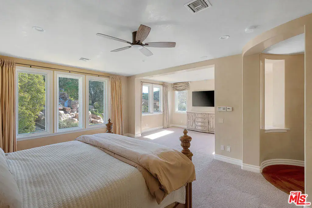 Located behind the iconic guard gates of The Oaks of Calabasas, this estate sits on a rare double cul-de-sac on an approximately 20,000 sq ft corner lot, offering exceptional seclusion. The residence spans approximately 6,255 sqft and is designed for seamless indoor-outdoor living. The home features a grand foyer with soaring ceilings, solid hardwood floors, and a sweeping staircase. Multiple formal and informal living spaces flow around a private interior courtyard, creating an efficient and functional layout for everyday living, entertaining and relaxing. The residence offers 5 en-suite bedrooms, 4 upstairs and 1 downstairs. The primary suite was designed as a luxurious private sanctuary complimented by a spa-inspired his-and-her bathroom featuring separate toilets and a bidet, dual vanities, oversized soaking spa tub, walk-in closet, private gym, enclosed office space, and peaceful views. Additionally Upstairs, 3 en-suite bedrooms surround a large bonus room ideal for children’s own play space or movie watching with friends..At the heart of the home is the chef’s kitchen and breakfast nook opening directly to the family room to serve as the central gathering place. This open-concept design features professional-grade Viking appliances, a Sub-Zero refrigerator with ice and water dispenser, 3 dishwashers, custom cabinetry, a butler’s pantry, 2 walk-in pantries, and an oversized island with vegetable sink. The backyard is a true showpiece. Designed for resort-style enjoyment the grounds feature a built-in BBQ, stovetop burners, a real wood-burning pizza oven imported from Italy, dramatic rockscape, beach-entry pool and spa with cascading waterfalls and waterslide, expansive patio areas, and lush landscaping. Completing the estate include two garages, rooftop solar panel system, EV-charger, tankless water heater, 4 independent A/C units, whole-house central vacuum system, French doors with Phantom screens and plantation shutters..Residents enjoy exclusive 24-hour guard-gated security and access to The Oaks’ amenities, including a clubhouse, fitness center, tennis and pickleball courts, sport courts for basketball, and an Olympic-size community pool. The home is minutes from The Commons at Calabasas offering premier dining and shopping, top-rated schools and scenic & hiking trails.
