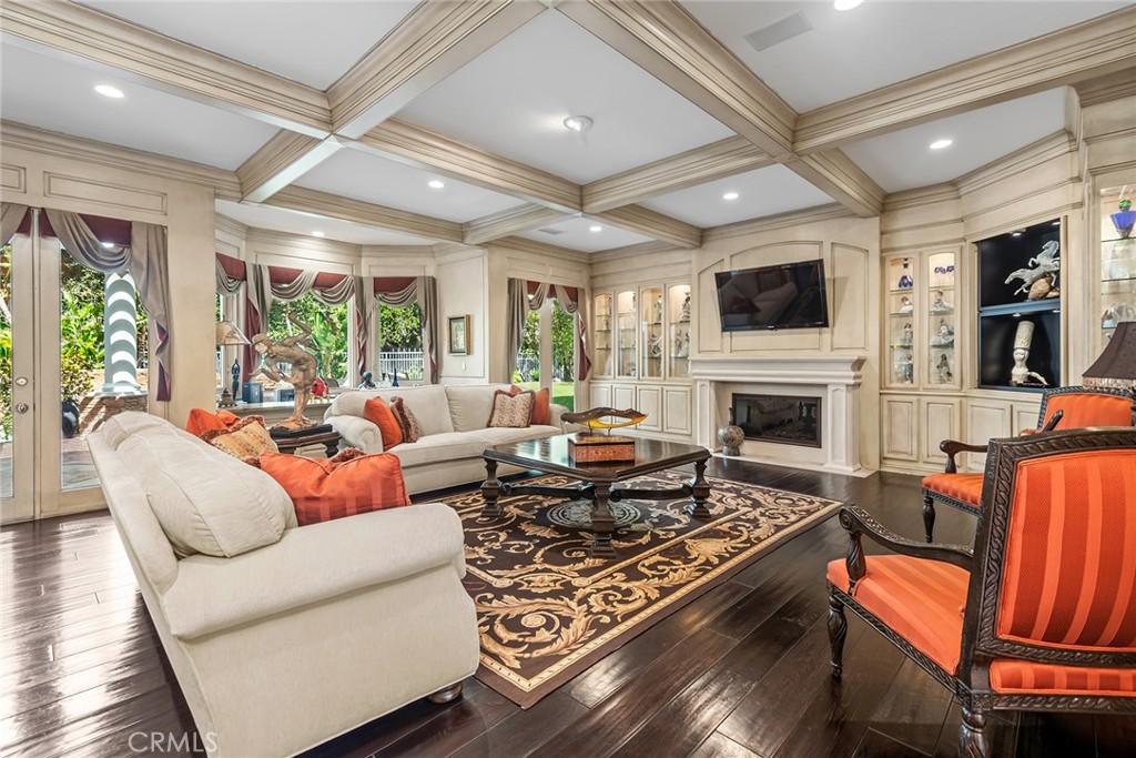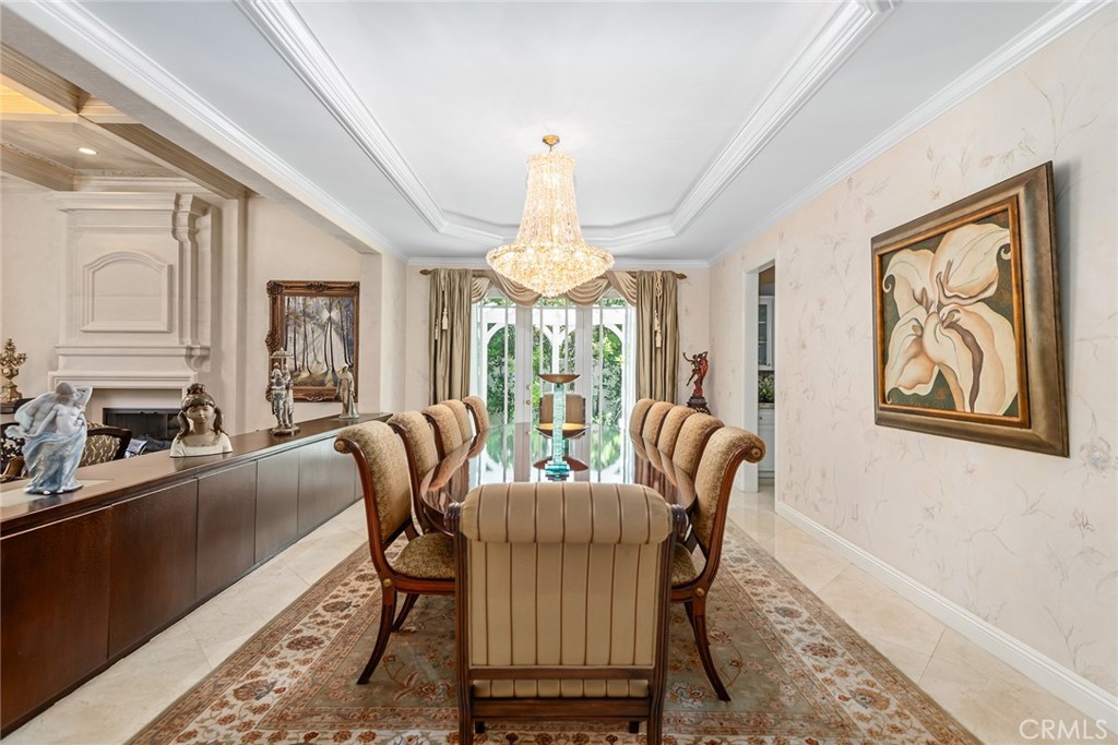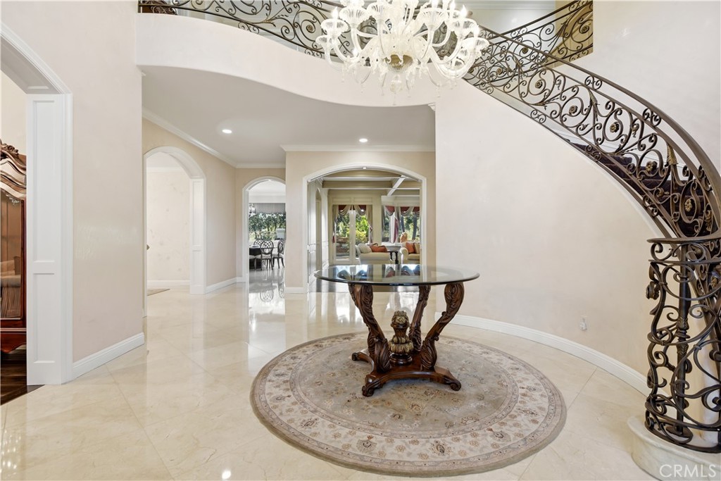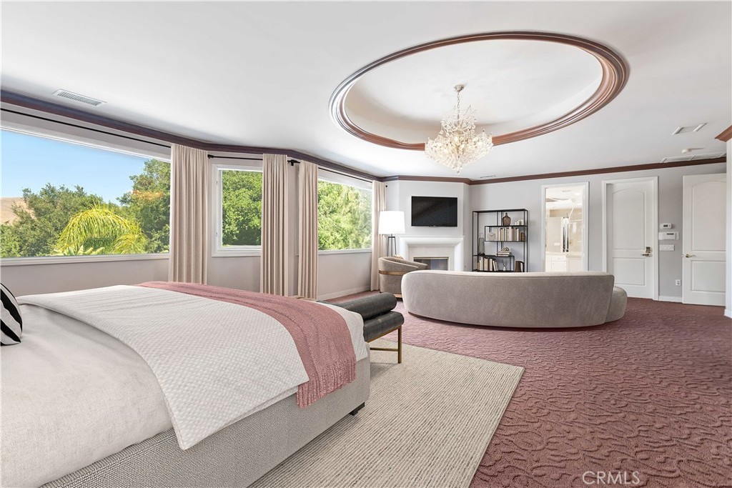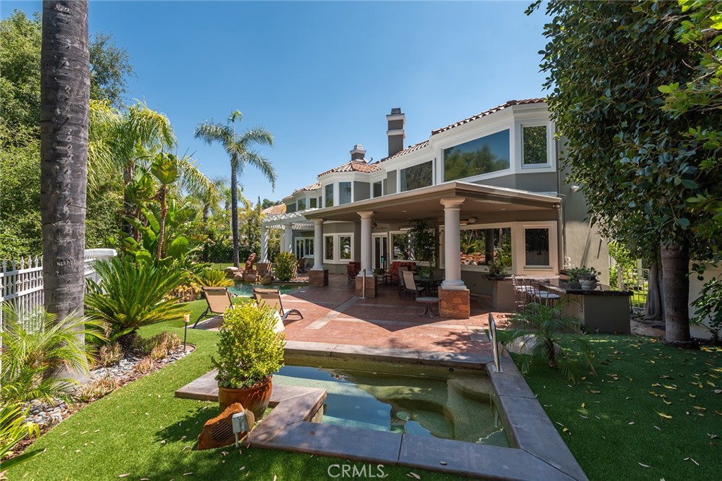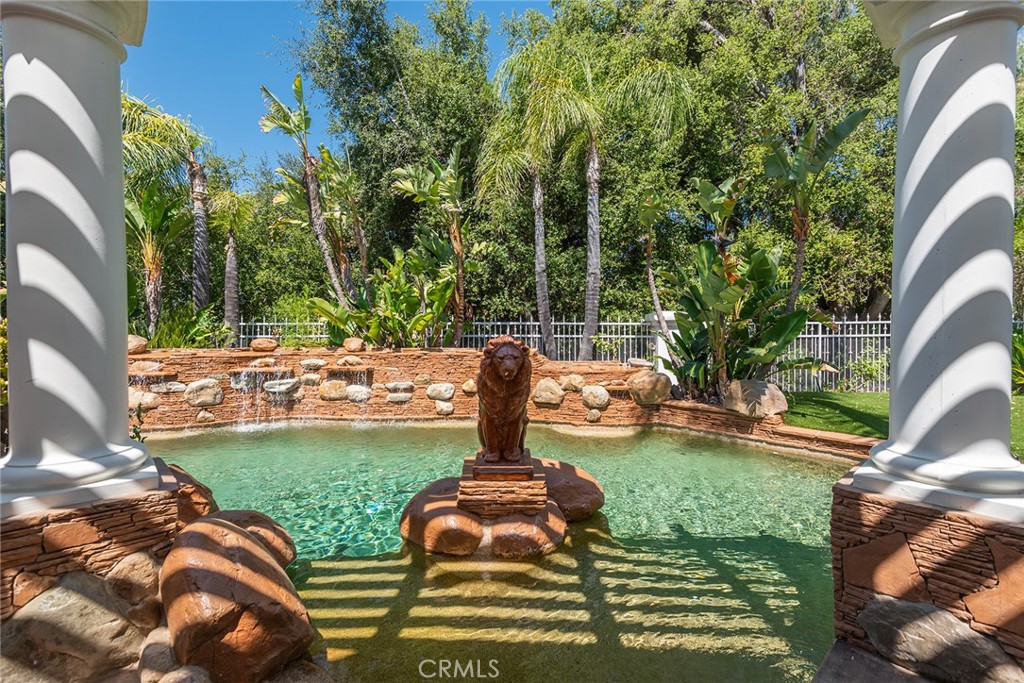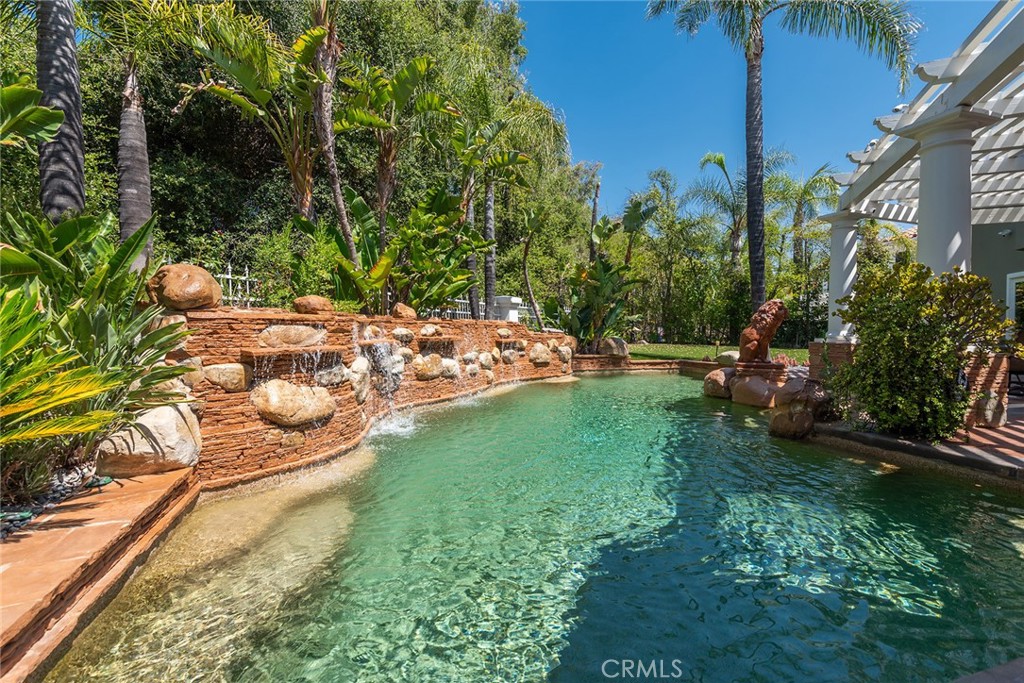 Located in the prestigious guard-gated community of Mountain View Estates this customized and expanded Plan 7 offers 6868 sq. ft. of refined living space with 6 en-suite bedrooms, including 2 primary suites, plus a 4-car garage. En-suite bedrooms 5 and 6 are currently used as a home theater and a large game room, providing excellent flexibility for modern living. Set on a single-loaded cul-de-sac, the home features beautiful curb appeal and meticulous maintenance. A dramatic 2 story foyer showcases a sweeping wrought-iron staircase, marble floors, & a Murano glass chandelier. The spacious family room includes custom built-ins, hardwood floors, a wet bar, and a fireplace, opening to the expansive kitchen with grand dining area, walk-in pantry, large center island, & butler’s pantry. The elegant formal dining room offers French doors to a charming side yard, a crystal chandelier, and built-in buffet cabinetry. The formal living room features coffered ceilings, hardwood floors, a fireplace, & another crystal chandelier. The main primary suite boasts a fireplace, 2 oversized walk-in closets, a spa style bathroom with dual vanities, spa tub & separate shower. The second primary suite includes 2 closets and a bathroom. Two additional en-suite bedrooms complete the upper level. The backyard is a private tropical oasis with lush landscaping, a beach entry saltwater pool, stacked stone & rock waterfalls, & a separate spa. A built-in BBQ, covered patio, & artificial lawn create in ideal setting for entertaining or relaxing. Additional features include a 4 zone heating & air, low maintenance artificial grass, water softner, & a Tesla Virtual Power Plant providing backup power for up to 82 hours. Located in the award winning Las Virgenes School District, near restaurants, shopping & a short drive to Malibu beaches.