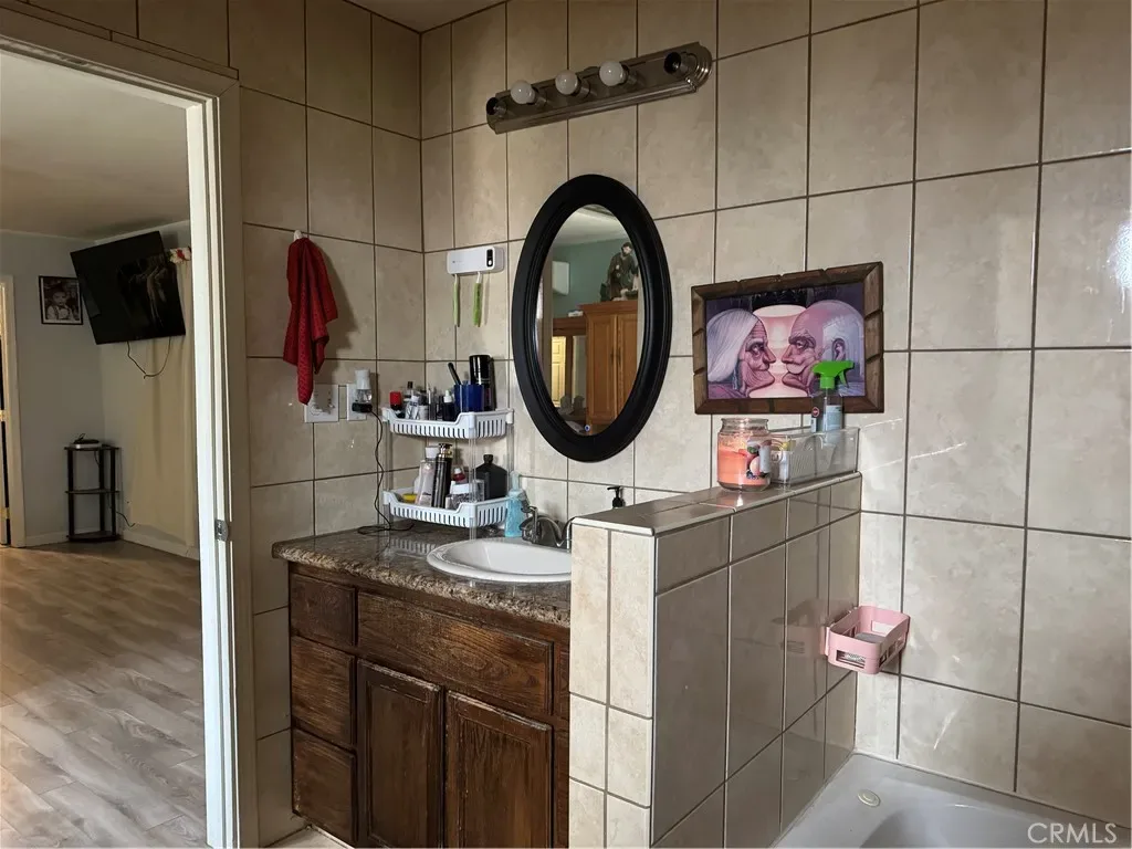 and separate shower ,beautiful vanity ,small cute bedroom, half bath , open concept Kitchen, dining and living areas with own exit to the garage where the laundry is located ,plus another area beside the garage for the extra items