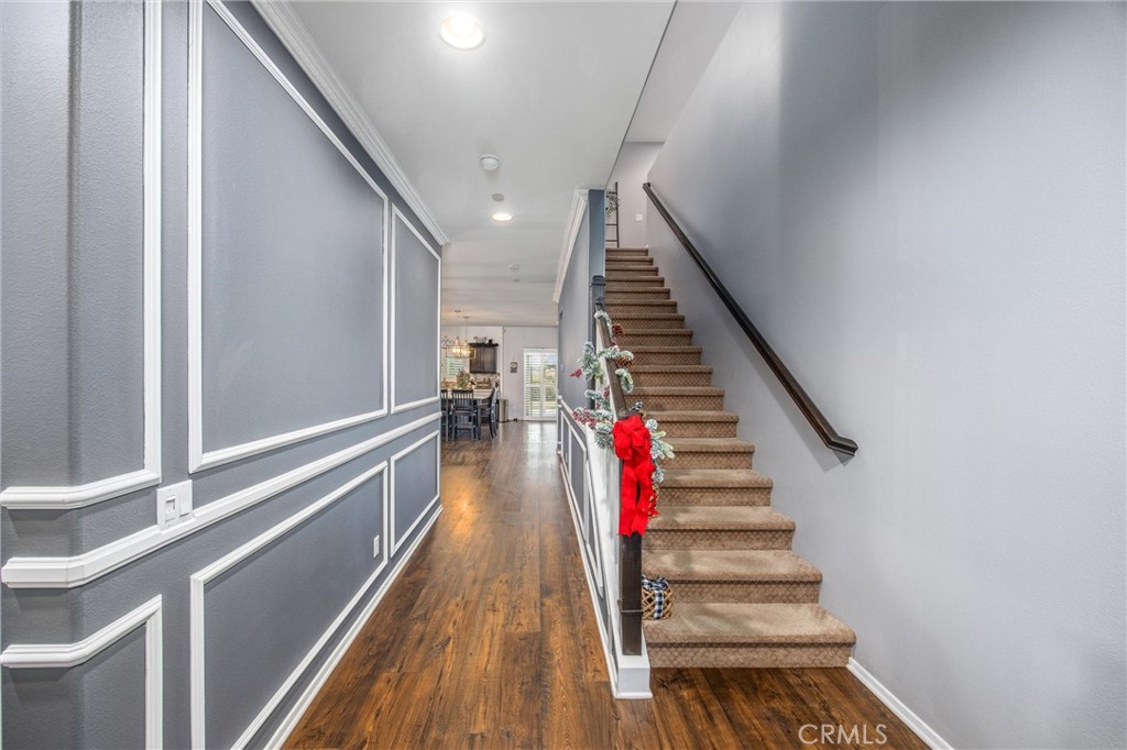 Inside, the open-concept layout keeps everyone connected. The chef’s kitchen flows seamlessly into the great room and features quartz countertops, abundant cabinetry, a separate pantry, and a seller-added designer backsplash with updated lighting. The oversized island—expanded to double the original builder size—creates the perfect hub for entertaining, homework, or game night, while a spacious breakfast nook and large dining area make hosting easy. Elegant touches throughout include crown molding, Wainscoting with custom wall trim detail, plantation shutters, and high-quality wood laminate flooring.