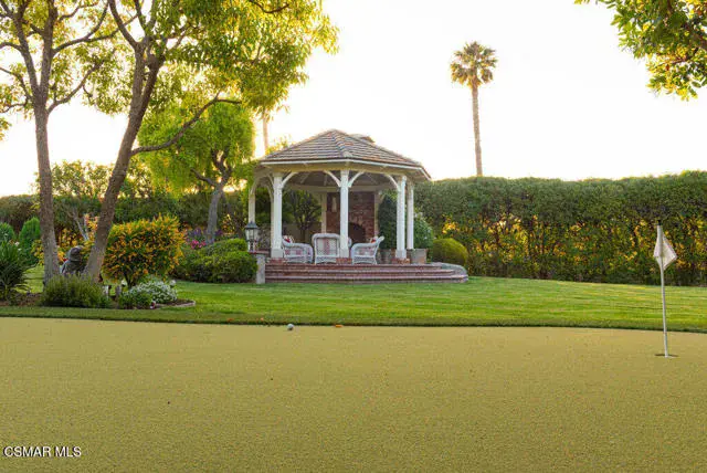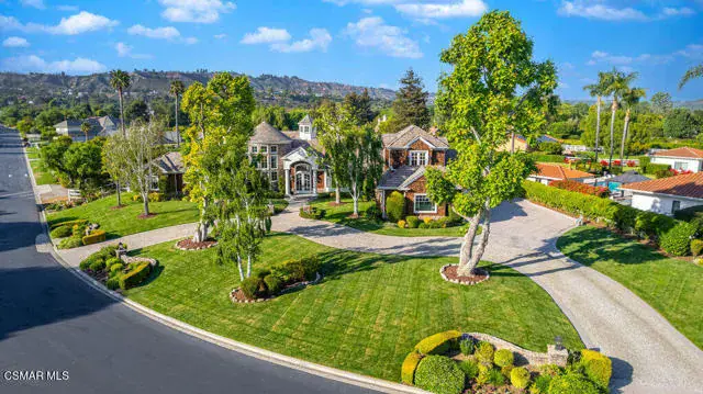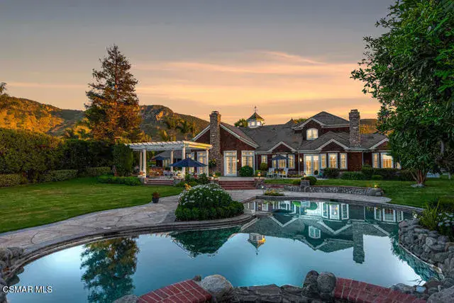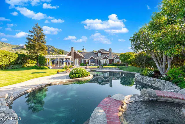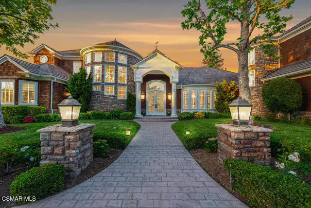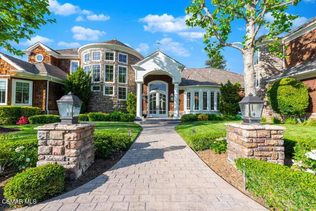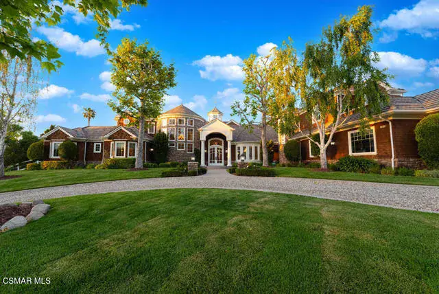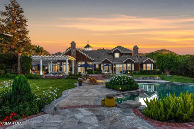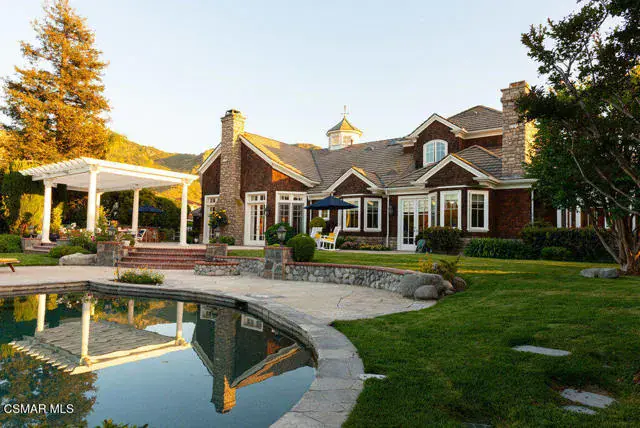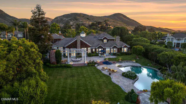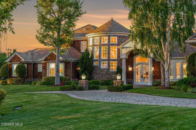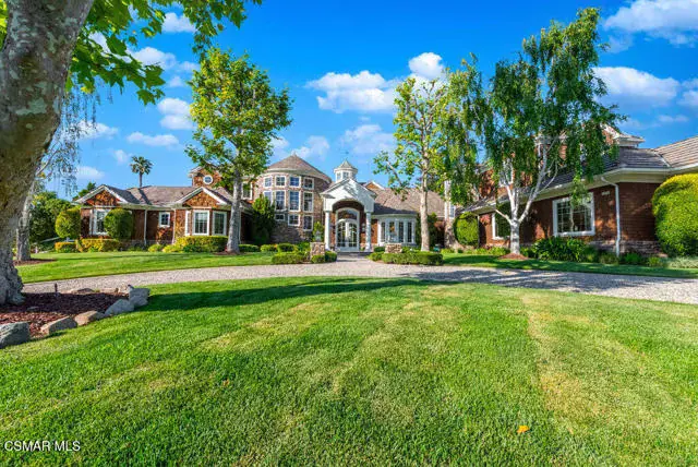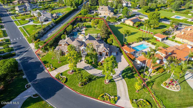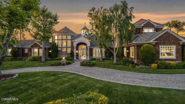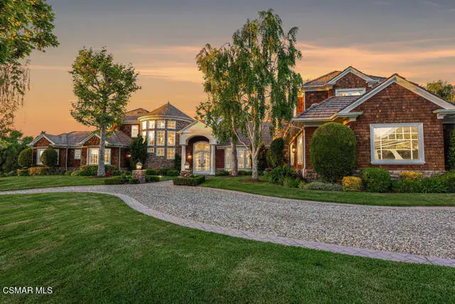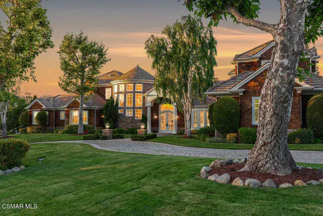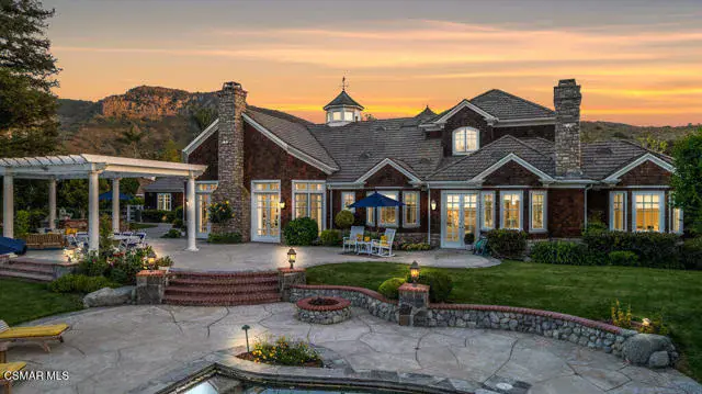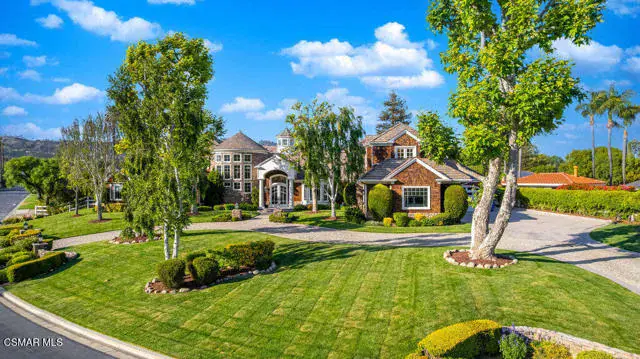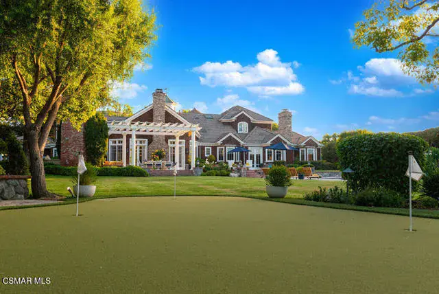 Architectural Masterpiece in Shingle Style Elegance!Welcome to a one-of-a-kind architectural dream home where East Coast charm meets California luxury. This expansive Shingle Style estate is set behind gates and rests on a coveted corner lot spanning over an acre of perfectly manicured grounds. A stately half-circle driveway that offers a stunning entrance and showcases the homes grand curb appeal. Step through soaring, double arched French doors into a dramatic foyer with towering ceilings and a sweeping curved staircase. Rich hardwood floors with custom inlays, towering ceilings in the turret and family room. Designer light fixtures, skylights, soaring windows, white wood paneling, intricate architectural details throughout the home flood the interiors with natural light and unwavering craftsmanship and design. Just off the grand entry and seamlessly connected to the great room, the formal dining room with arched windows and ceiling with cove lighting and fixturing offering an elegant space for intimate dinners and large scale entertaining. The heart of the home features a statement bar with glass-front cabinetry, integrated lighting, and a beverage fridge–flowing effortlessly into the expansive great room, breakfast nook, and chef’s kitchen. The kitchen is beautifully appointed with granite countertops, a Dacor stove and oven, a built-in refrigerator, a brand-new Bosch dishwasher and custom cabinetry. A generous walk-in pantry provides ample storage, while a nearby utility space offering more glass cabinets with built-in lighting and storage.The smart and spacious floorplan features four bedrooms downstairs, each with walk-in closets. One is a private en-suite with backyard views, while two others have a generous Jack-and-Jill bath. The luxurious primary suite includes a fireplace, dual walk-in closets, a sitting area, and a spa-like bath with a double shower, soaking tub and serene backyard vistas. Upstairs, a separate wing offers an additional guest suite with private bath and balcony. Don’t miss the oversized laundry room with secondary fridge, ample cabinetry and direct access to the full pool bath with exterior entry. The other set of sprawling stairs leads you to a work-from-home luxury, a richly appointed library/office features floor-to-ceiling custom dark wood built-ins and its own full bath and walk-in closet.French doors throughout the home open to a spectacular entertainer’s dream backyard designed for year-round enjoyment and tailored seamlessly for indoor/outdoor gatherings. Highlights include a granite-outfitted outdoor kitchen with built-in BBQ, fridge, ice chest, a cozy outdoor fireplace with TV lounge area, fire pit with seating, covered beamed patio and a lighted gazebo with fireplace. The backyard continues with a stunning pool and spa featuring waterfalls and water features and bridge, a six-hole lighted putting green, decorative waterfall and meticulously manicured landscaping with lush expansive grassy area lined with mature trees and privacy.A four-car garage rounds out the home, with built-in cabinetry, shelving and abundant storage space. A whole house generator to top it off. This rare, custom estate is packed with premium finishes, thoughtful details and luxury upgrades at every turn–this truly is a dream home with it all.