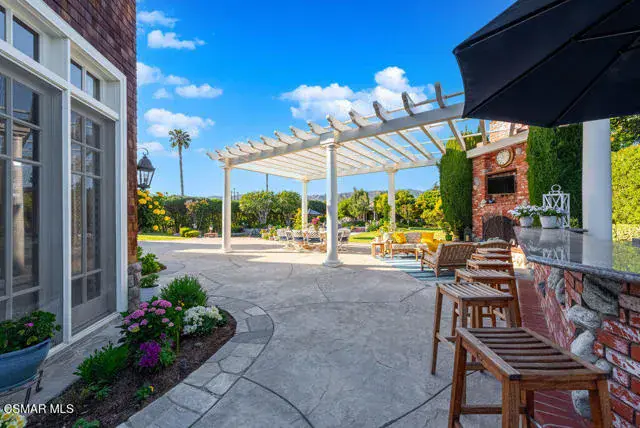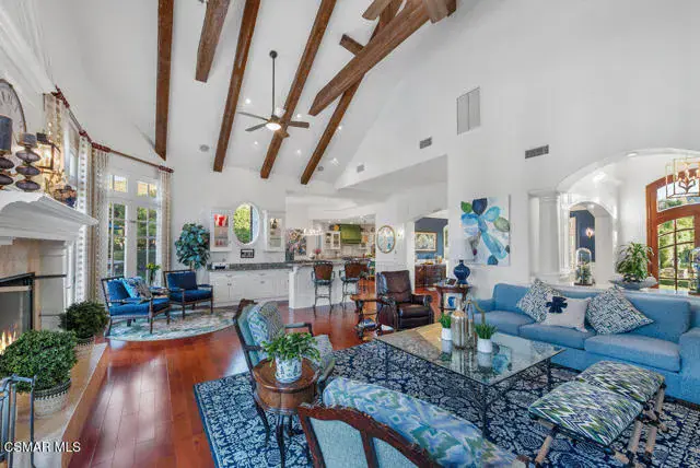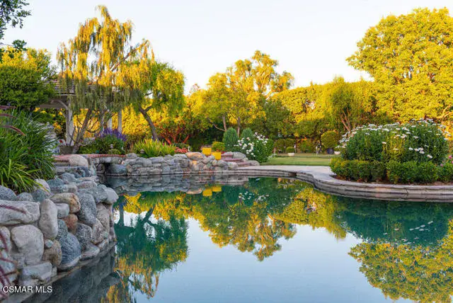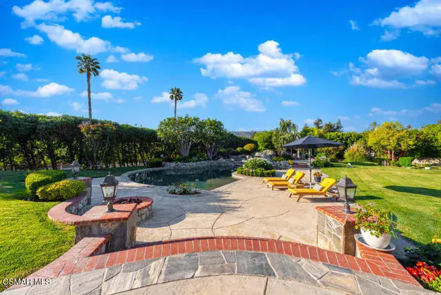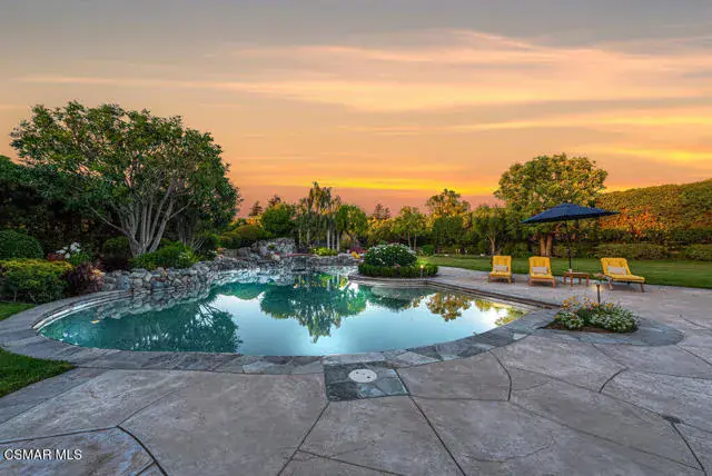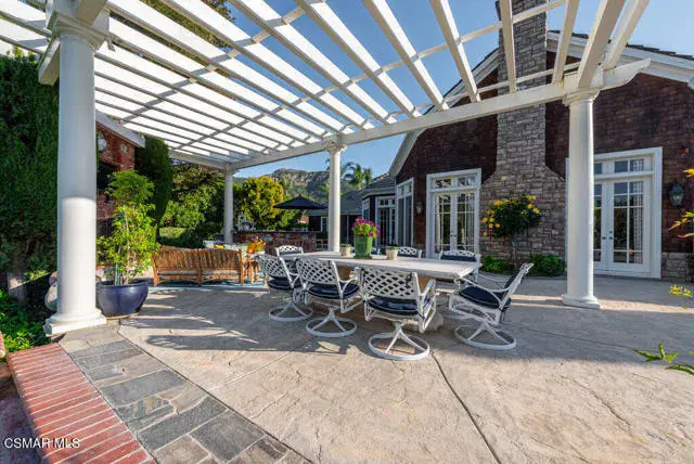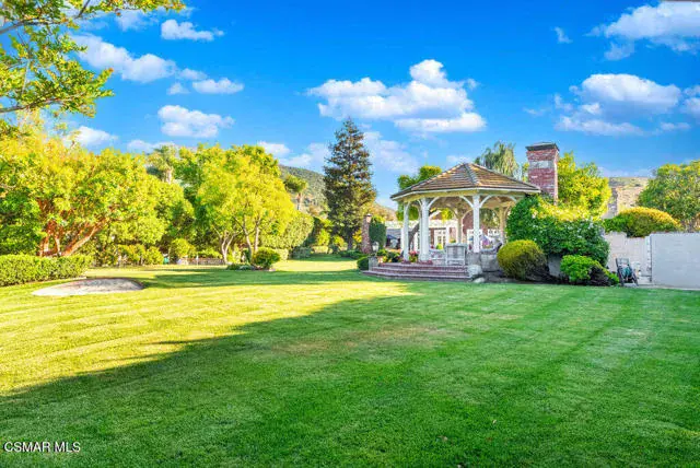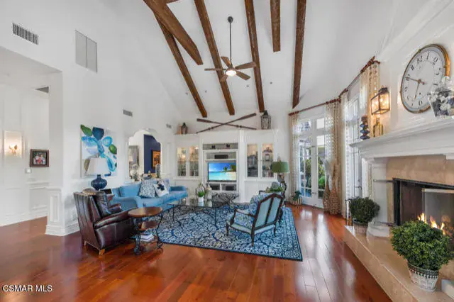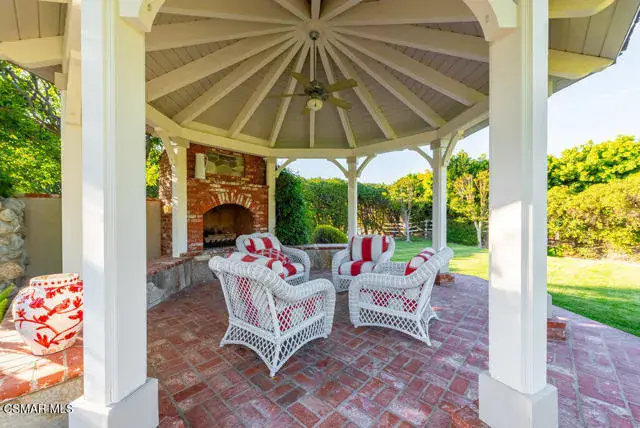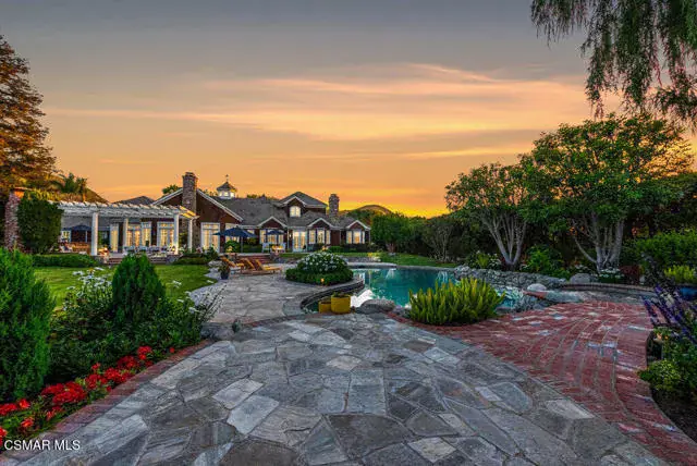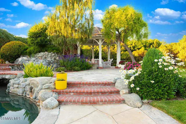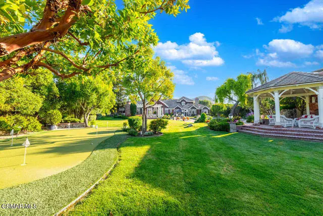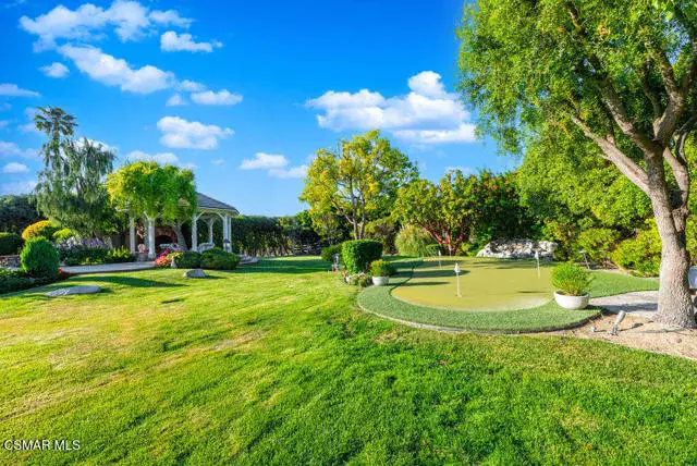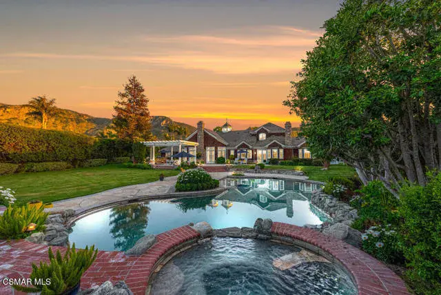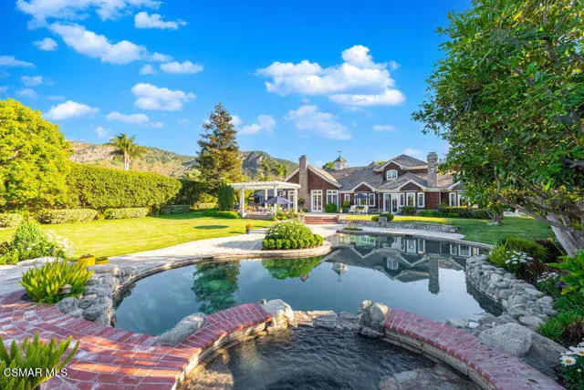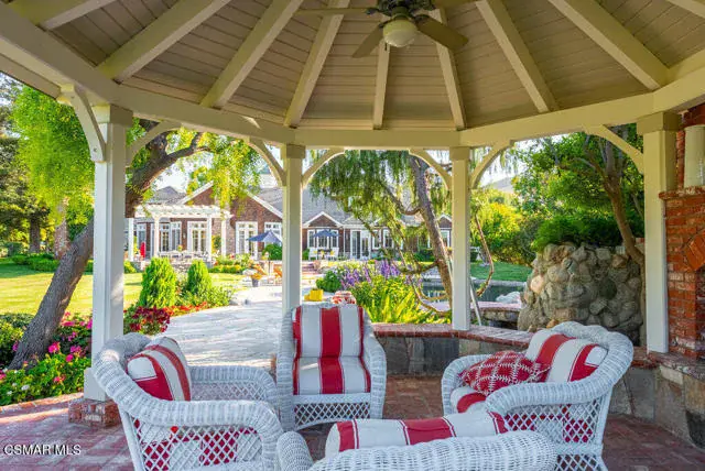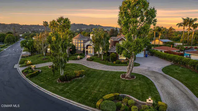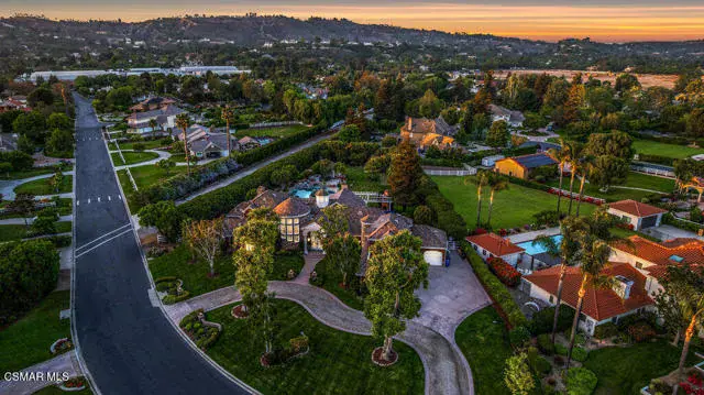 Architectural Masterpiece in Shingle Style Elegance!Welcome to a one-of-a-kind architectural dream home where East Coast charm meets California luxury. This expansive Shingle Style estate is set behind gates and rests on a coveted corner lot spanning over an acre of perfectly manicured grounds. A stately half-circle driveway that offers a stunning entrance and showcases the homes grand curb appeal. Step through soaring, double arched French doors into a dramatic foyer with towering ceilings and a sweeping curved staircase. Rich hardwood floors with custom inlays, towering ceilings in the turret and family room. Designer light fixtures, skylights, soaring windows, white wood paneling, intricate architectural details throughout the home flood the interiors with natural light and unwavering craftsmanship and design. Just off the grand entry and seamlessly connected to the great room, the formal dining room with arched windows and ceiling with cove lighting and fixturing offering an elegant space for intimate dinners and large scale entertaining. The heart of the home features a statement bar with glass-front cabinetry, integrated lighting, and a beverage fridge–flowing effortlessly into the expansive great room, breakfast nook, and chef’s kitchen. The kitchen is beautifully appointed with granite countertops, a Dacor stove and oven, a built-in refrigerator, a brand-new Bosch dishwasher and custom cabinetry. A generous walk-in pantry provides ample storage, while a nearby utility space offering more glass cabinets with built-in lighting and storage.The smart and spacious floorplan features four bedrooms downstairs, each with walk-in closets. One is a private en-suite with backyard views, while two others have a generous Jack-and-Jill bath. The luxurious primary suite includes a fireplace, dual walk-in closets, a sitting area, and a spa-like bath with a double shower, soaking tub and serene backyard vistas. Upstairs, a separate wing offers an additional guest suite with private bath and balcony. Don’t miss the oversized laundry room with secondary fridge, ample cabinetry and direct access to the full pool bath with exterior entry. The other set of sprawling stairs leads you to a work-from-home luxury, a richly appointed library/office features floor-to-ceiling custom dark wood built-ins and its own full bath and walk-in closet.French doors throughout the home open to a spectacular entertainer’s dream backyard designed for year-round enjoyment and tailored seamlessly for indoor/outdoor gatherings. Highlights include a granite-outfitted outdoor kitchen with built-in BBQ, fridge, ice chest, a cozy outdoor fireplace with TV lounge area, fire pit with seating, covered beamed patio and a lighted gazebo with fireplace. The backyard continues with a stunning pool and spa featuring waterfalls and water features and bridge, a six-hole lighted putting green, decorative waterfall and meticulously manicured landscaping with lush expansive grassy area lined with mature trees and privacy.A four-car garage rounds out the home, with built-in cabinetry, shelving and abundant storage space. A whole house generator to top it off. This rare, custom estate is packed with premium finishes, thoughtful details and luxury upgrades at every turn–this truly is a dream home with it all.
