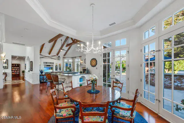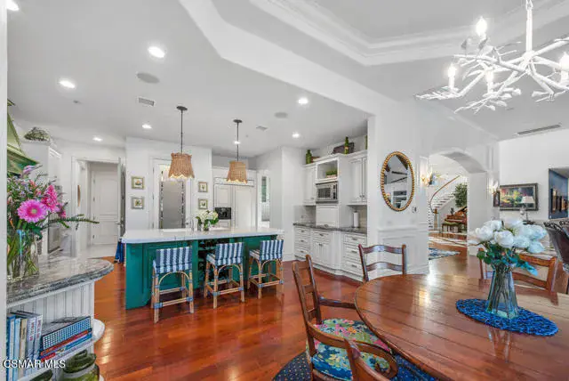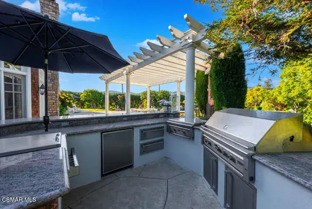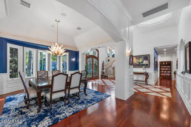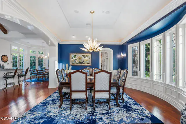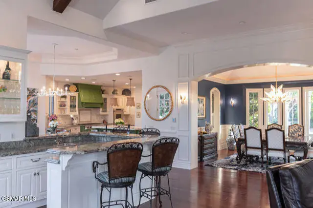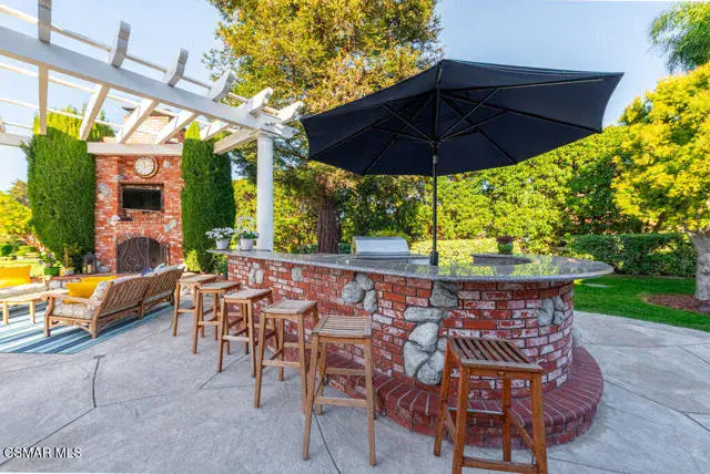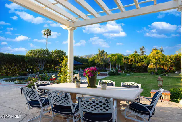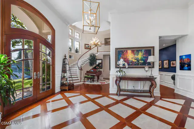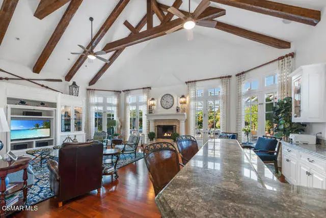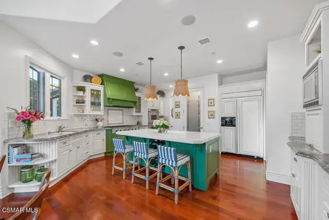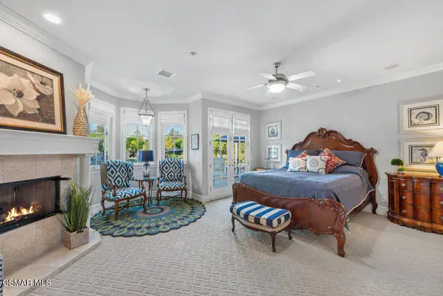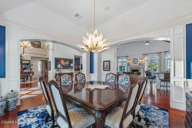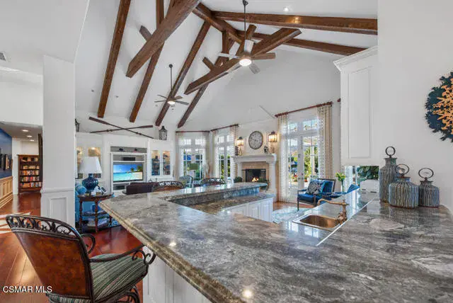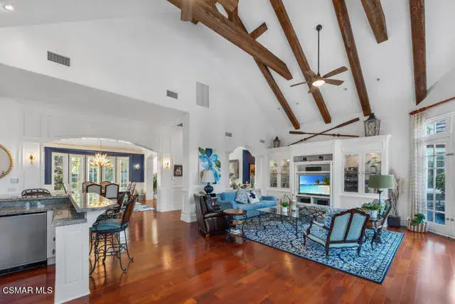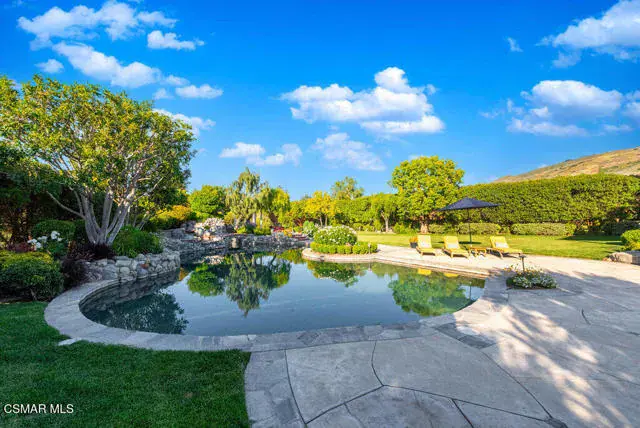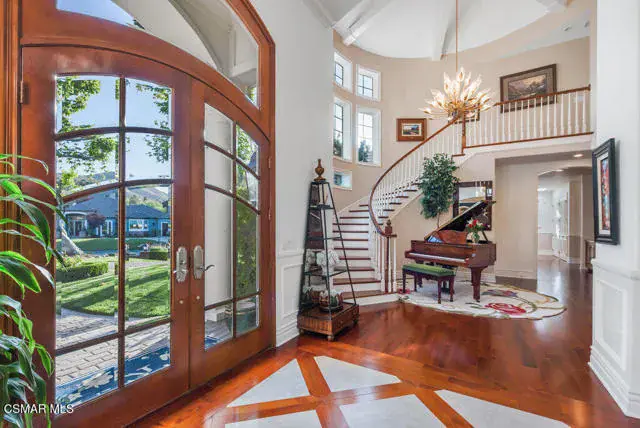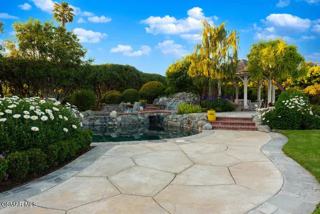 Architectural Masterpiece in Shingle Style Elegance!Welcome to a one-of-a-kind architectural dream home where East Coast charm meets California luxury. This expansive Shingle Style estate is set behind gates and rests on a coveted corner lot spanning over an acre of perfectly manicured grounds. A stately half-circle driveway that offers a stunning entrance and showcases the homes grand curb appeal. Step through soaring, double arched French doors into a dramatic foyer with towering ceilings and a sweeping curved staircase. Rich hardwood floors with custom inlays, towering ceilings in the turret and family room. Designer light fixtures, skylights, soaring windows, white wood paneling, intricate architectural details throughout the home flood the interiors with natural light and unwavering craftsmanship and design. Just off the grand entry and seamlessly connected to the great room, the formal dining room with arched windows and ceiling with cove lighting and fixturing offering an elegant space for intimate dinners and large scale entertaining. The heart of the home features a statement bar with glass-front cabinetry, integrated lighting, and a beverage fridge–flowing effortlessly into the expansive great room, breakfast nook, and chef’s kitchen. The kitchen is beautifully appointed with granite countertops, a Dacor stove and oven, a built-in refrigerator, a brand-new Bosch dishwasher and custom cabinetry. A generous walk-in pantry provides ample storage, while a nearby utility space offering more glass cabinets with built-in lighting and storage.The smart and spacious floorplan features four bedrooms downstairs, each with walk-in closets. One is a private en-suite with backyard views, while two others have a generous Jack-and-Jill bath. The luxurious primary suite includes a fireplace, dual walk-in closets, a sitting area, and a spa-like bath with a double shower, soaking tub and serene backyard vistas. Upstairs, a separate wing offers an additional guest suite with private bath and balcony. Don’t miss the oversized laundry room with secondary fridge, ample cabinetry and direct access to the full pool bath with exterior entry. The other set of sprawling stairs leads you to a work-from-home luxury, a richly appointed library/office features floor-to-ceiling custom dark wood built-ins and its own full bath and walk-in closet.French doors throughout the home open to a spectacular entertainer’s dream backyard designed for year-round enjoyment and tailored seamlessly for indoor/outdoor gatherings. Highlights include a granite-outfitted outdoor kitchen with built-in BBQ, fridge, ice chest, a cozy outdoor fireplace with TV lounge area, fire pit with seating, covered beamed patio and a lighted gazebo with fireplace. The backyard continues with a stunning pool and spa featuring waterfalls and water features and bridge, a six-hole lighted putting green, decorative waterfall and meticulously manicured landscaping with lush expansive grassy area lined with mature trees and privacy.A four-car garage rounds out the home, with built-in cabinetry, shelving and abundant storage space. A whole house generator to top it off. This rare, custom estate is packed with premium finishes, thoughtful details and luxury upgrades at every turn–this truly is a dream home with it all.