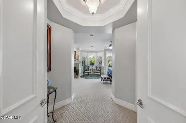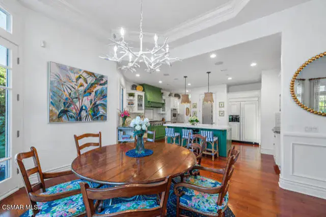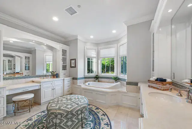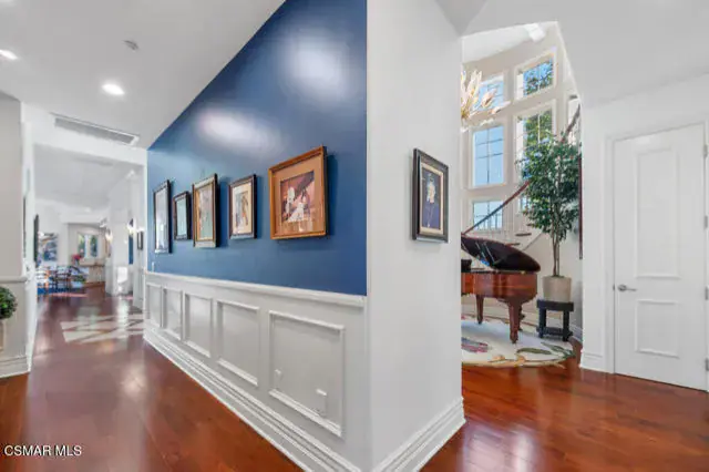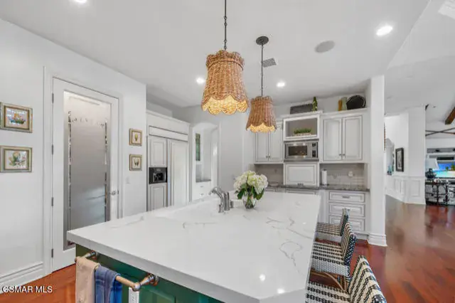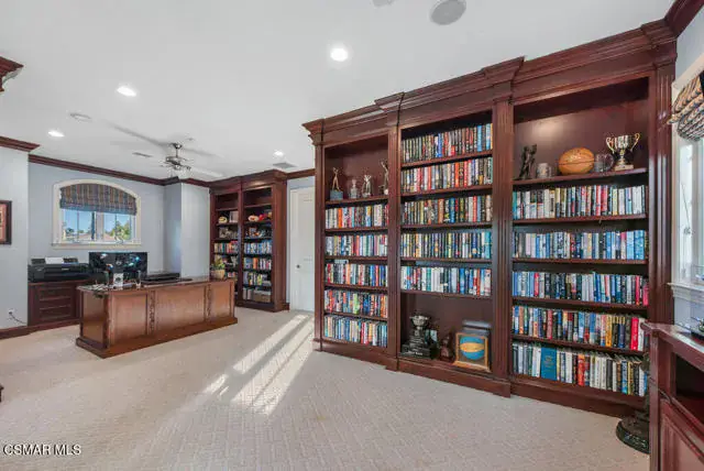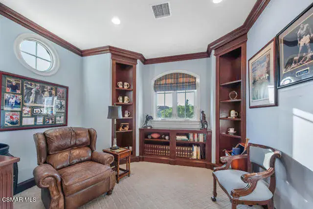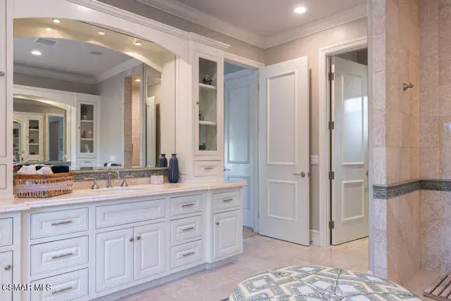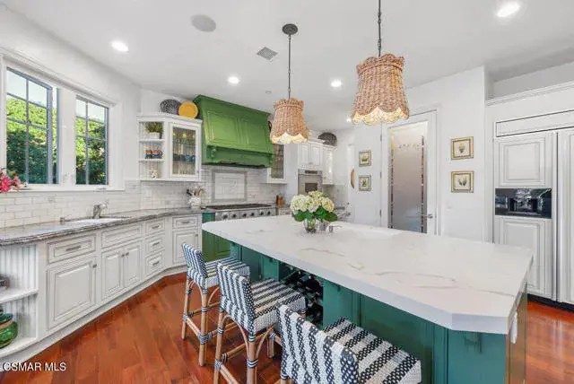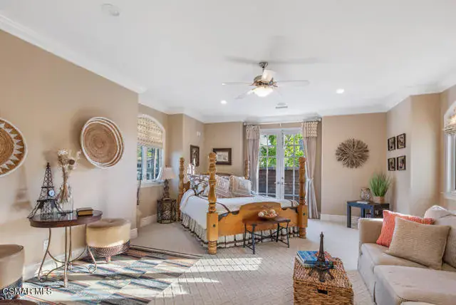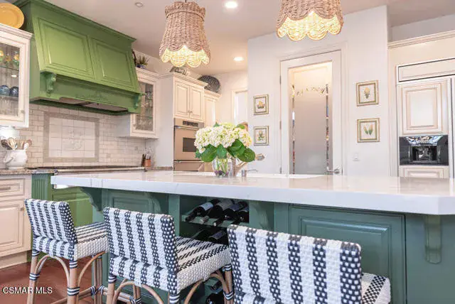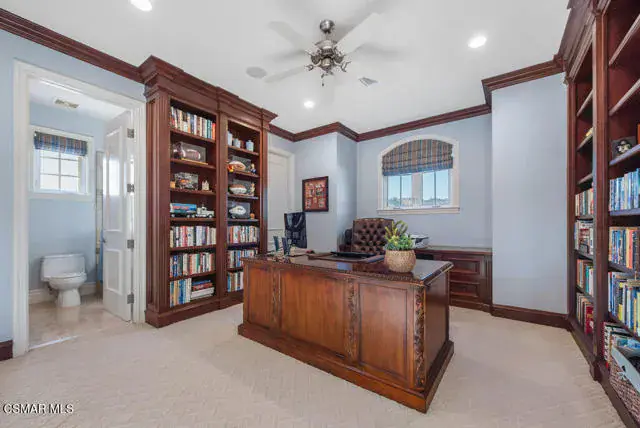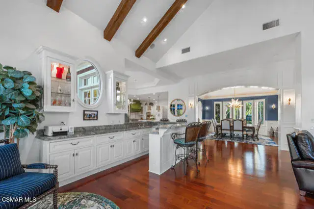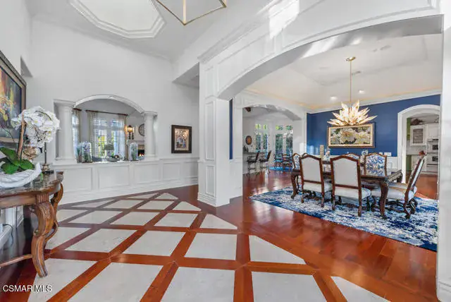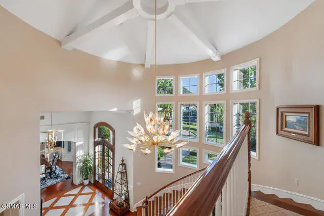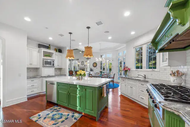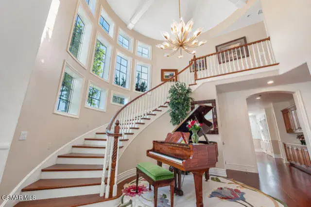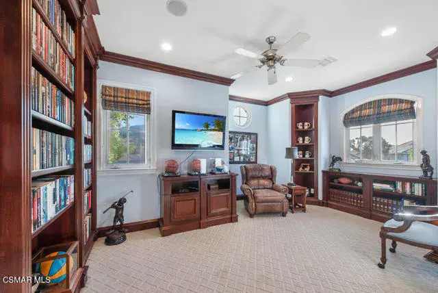 Architectural Masterpiece in Shingle Style Elegance!Welcome to a one-of-a-kind architectural dream home where East Coast charm meets California luxury. This expansive Shingle Style estate is set behind gates and rests on a coveted corner lot spanning over an acre of perfectly manicured grounds. A stately half-circle driveway that offers a stunning entrance and showcases the homes grand curb appeal. Step through soaring, double arched French doors into a dramatic foyer with towering ceilings and a sweeping curved staircase. Rich hardwood floors with custom inlays, towering ceilings in the turret and family room. Designer light fixtures, skylights, soaring windows, white wood paneling, intricate architectural details throughout the home flood the interiors with natural light and unwavering craftsmanship and design. Just off the grand entry and seamlessly connected to the great room, the formal dining room with arched windows and ceiling with cove lighting and fixturing offering an elegant space for intimate dinners and large scale entertaining. The heart of the home features a statement bar with glass-front cabinetry, integrated lighting, and a beverage fridge–flowing effortlessly into the expansive great room, breakfast nook, and chef’s kitchen. The kitchen is beautifully appointed with granite countertops, a Dacor stove and oven, a built-in refrigerator, a brand-new Bosch dishwasher and custom cabinetry. A generous walk-in pantry provides ample storage, while a nearby utility space offering more glass cabinets with built-in lighting and storage.The smart and spacious floorplan features four bedrooms downstairs, each with walk-in closets. One is a private en-suite with backyard views, while two others have a generous Jack-and-Jill bath. The luxurious primary suite includes a fireplace, dual walk-in closets, a sitting area, and a spa-like bath with a double shower, soaking tub and serene backyard vistas. Upstairs, a separate wing offers an additional guest suite with private bath and balcony. Don’t miss the oversized laundry room with secondary fridge, ample cabinetry and direct access to the full pool bath with exterior entry. The other set of sprawling stairs leads you to a work-from-home luxury, a richly appointed library/office features floor-to-ceiling custom dark wood built-ins and its own full bath and walk-in closet.French doors throughout the home open to a spectacular entertainer’s dream backyard designed for year-round enjoyment and tailored seamlessly for indoor/outdoor gatherings. Highlights include a granite-outfitted outdoor kitchen with built-in BBQ, fridge, ice chest, a cozy outdoor fireplace with TV lounge area, fire pit with seating, covered beamed patio and a lighted gazebo with fireplace. The backyard continues with a stunning pool and spa featuring waterfalls and water features and bridge, a six-hole lighted putting green, decorative waterfall and meticulously manicured landscaping with lush expansive grassy area lined with mature trees and privacy.A four-car garage rounds out the home, with built-in cabinetry, shelving and abundant storage space. A whole house generator to top it off. This rare, custom estate is packed with premium finishes, thoughtful details and luxury upgrades at every turn–this truly is a dream home with it all.