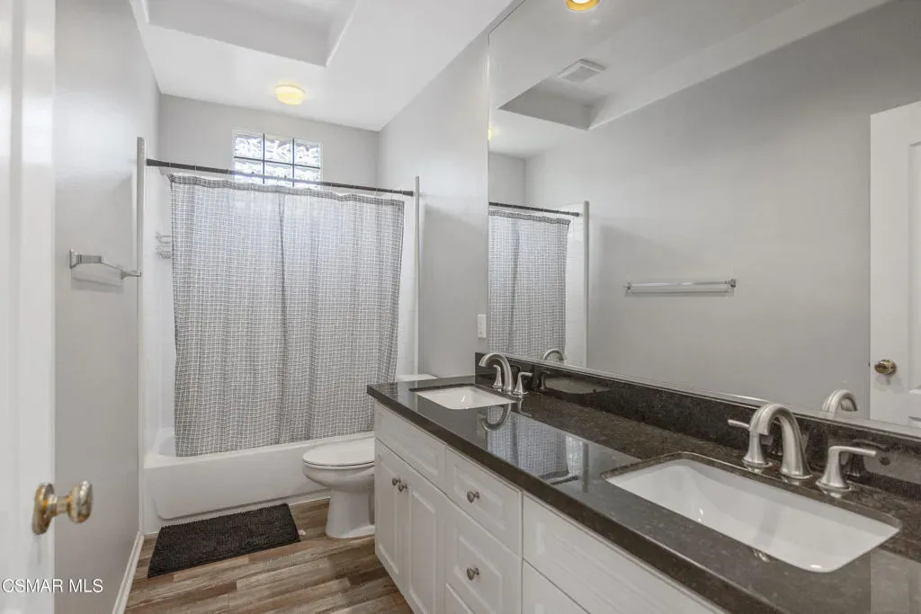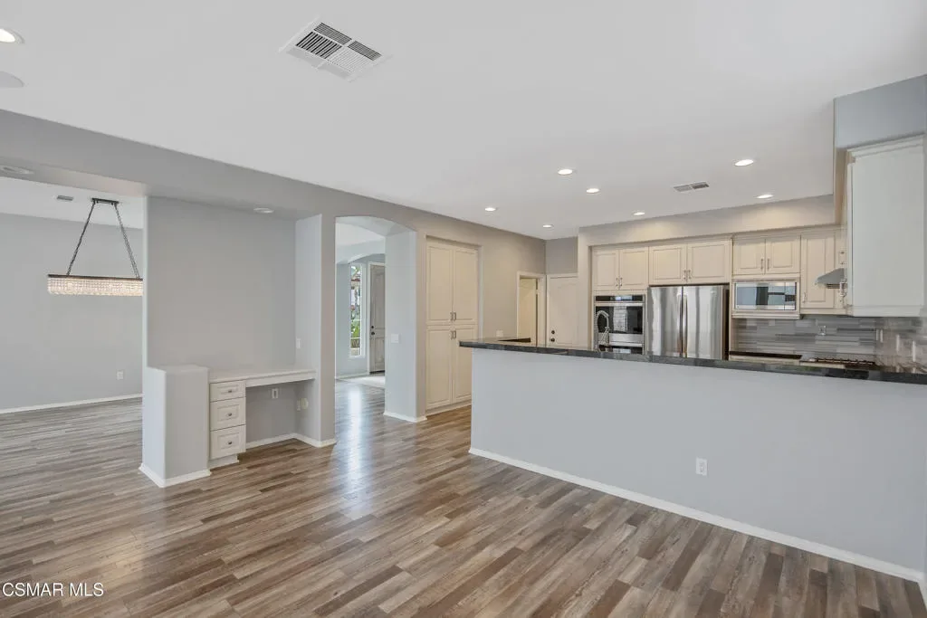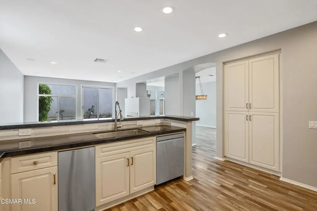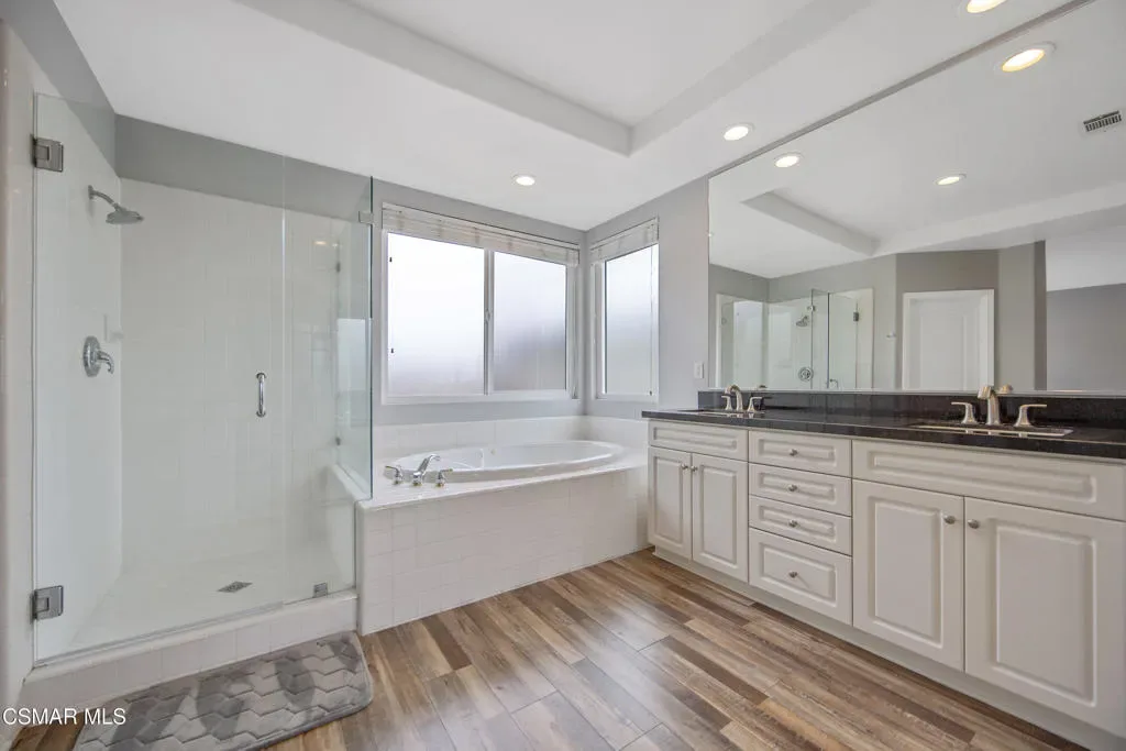 Welcome to an exceptional opportunity behind the gates at The Fairways at Sterling Hills in beautiful Camarillo. This stunning 2,570 sq. ft. four-bedroom, three-bath home is one of the only four-bedroom floor plans available in the entire community, making it a truly rare offering.Recently refreshed and move-in ready, the home features beautiful large plank flooring throughout, new windows, recessed lighting, surround sound throughout and fresh interior paint, creating a bright and modern feel from the moment you enter. The thoughtfully designed floor plan offers both a spacious family room and a separate living and dining room, perfect for everyday living and entertaining.The light-filled upstairs living area offers wonderful views through oversized windows that bring in an abundance of natural light, creating a peaceful and uplifting atmosphere. The primary suite is generously sized and includes a luxurious bathroom with large soaking tub, separate shower, and a walk-in closet.The kitchen showcases granite countertops, elegant white cabinetry, and a warm inviting layout, ideal for gathering with family and friends.Step outside to a secluded and tranquil backyard, perfect for relaxing, or simply enjoying the quiet surroundings. The property also includes a spacious attached two-car garage and convenient upstairs laundry room.Located in the gated Fairways at Sterling Hills community, residents enjoy access to resort-style amenities including a pool, spa, tennis courts, picnic area and community RV parking all set within a beautifully maintained neighborhood.Quiet, private, and calming, this is truly a one-of-a-kind home at this price point–offering space, style, and an unbeatable location.
