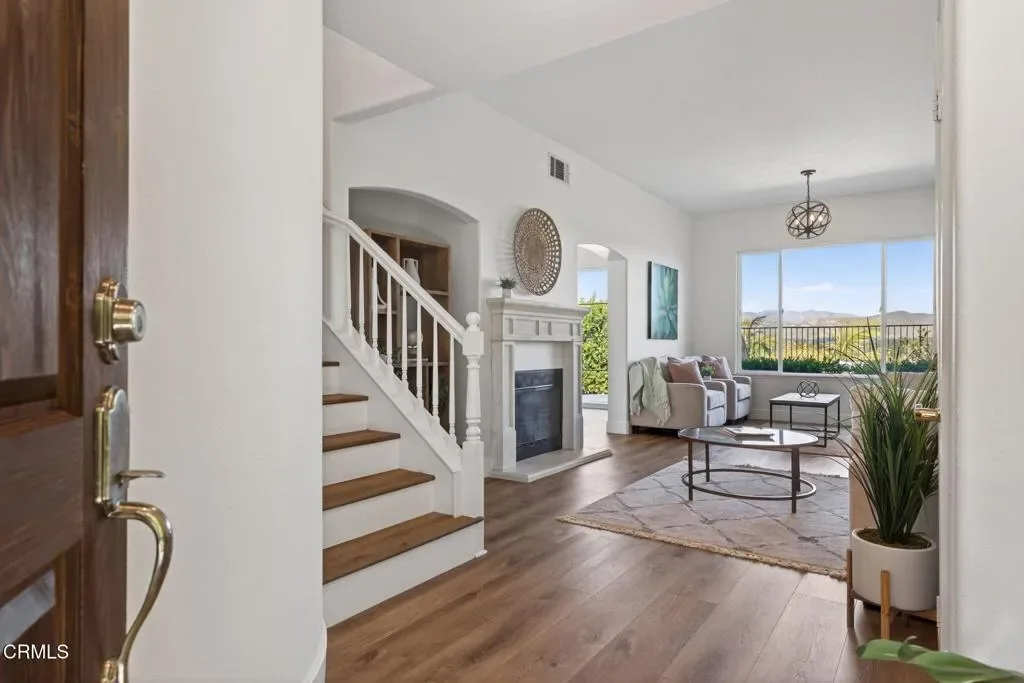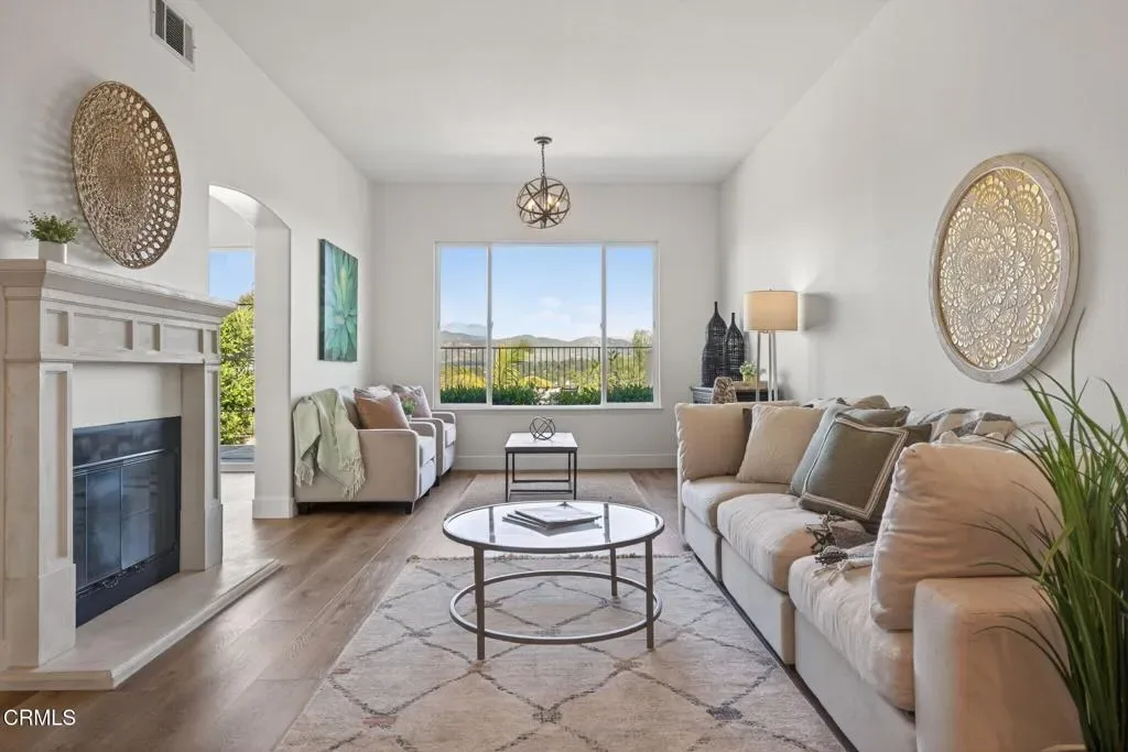 Views take center stage in this exceptional home, where a premier location meets sweeping mountain vistas and glowing city lights, a rare and striking combination that sets this residence apart. Welcome to 931 Corte Augusta, ideally positioned within the prestigious, gated Golf Villa II community within Spanish Hills. This residence is one of only a select few to offer breathtaking views, enjoyed from all main living areas, one of the upstairs bedrooms, and the inviting backyard–perfect for entertaining family and friends while taking in the scenery. A second upstairs bedroom also has the potential to capture similar views with the replacement of two smaller windows with a larger picture window. The home offers 3 bedrooms, 2.5 bathrooms, and 1,623 square feet of thoughtfully designed living space. The first floor features a versatile layout ideal for both everyday living and entertaining. Highlights include a cozy family room centered around a fireplace with a custom mantel, and hearth, a flexible space that can serve as a formal dining area or sitting room, and an inviting kitchen with a generously sized breakfast nook for casual meals. High-end luxury vinyl plank flooring flows throughout the first floor, staircase, and upstairs hallways, while all three bedrooms are carpeted. The primary suite provides a private retreat, separated from the other bedrooms, and includes a walk-in closet and a private balcony. The recently remodeled primary bathroom features a custom vanity with quartzite countertops, dual sinks, illuminated mirrors, a spacious shower, and a private water closet. The secondary bathroom has also been remodeled, featuring custom tile work, a large soaking tub, and elegant matte-gold plumbing fixtures. Additional features include central air conditioning, dual-pane vinyl windows, a private laundry room, and a two car garage for convenience and comfort. The $480 monthly HOA dues provides gated security and access to desirable amenities including a clubhouse, pool, spa, and RV parking. The community is also within walking distance of the renowned Spanish Hills Country Club, offering multiple membership options with access to golf, tennis, pickleball, swimming, and a highly rated restaurant. The home is also ideally located near the Camarillo Premium Outlets and the Camarillo Airport, with quick access to both the 101 and 118 freeways, perfect for commuters or anyone who values convenience and connectivity.