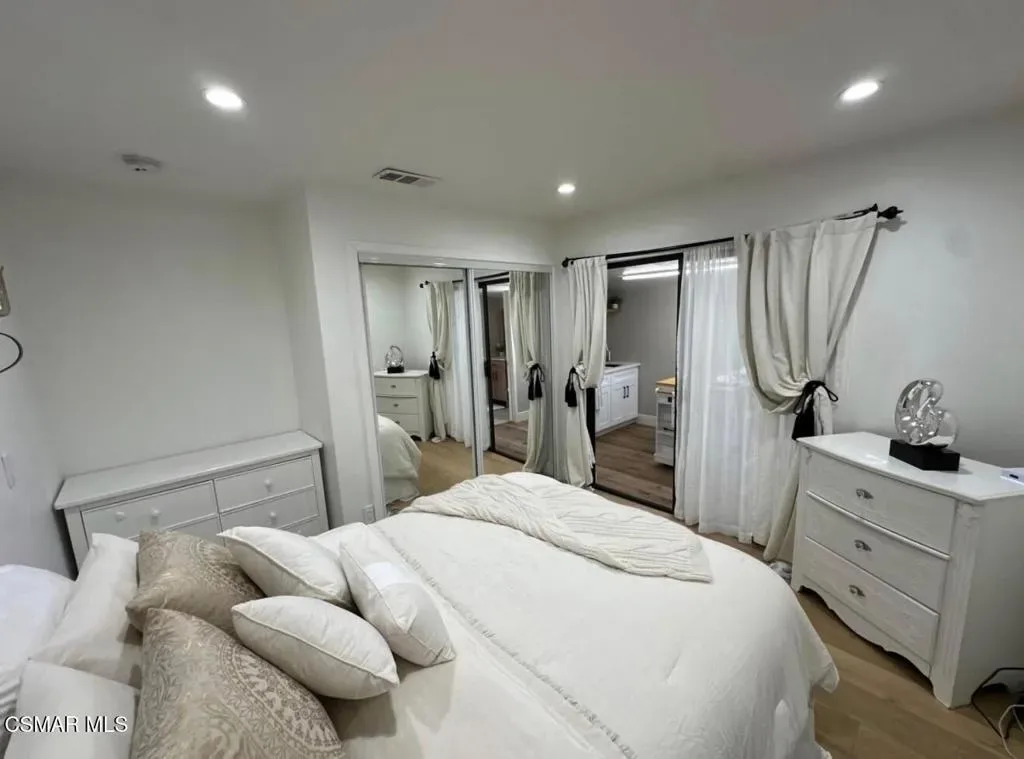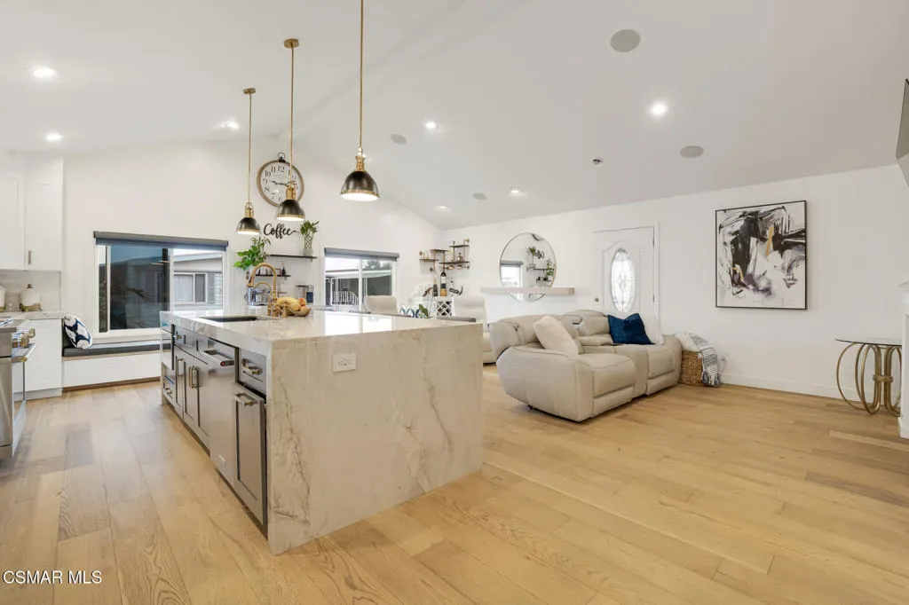 A truly special offering in the coveted Lamplighter community of Camarillo. This completely reimagined residence offers a versatile layout with 2 bedrooms and 2 bathrooms in the main home, plus an attached guest suite featuring an additional bedroom, full bathroom, and kitchenette, ideal for extended family or guests. At the heart of the home is a stunning chef’s kitchen, highlighted by a massive waterfall quartzite island that serves as the centerpiece. The kitchen opens seamlessly to the family room, creating an inviting space perfect for both everyday living and entertaining. The family room is anchored by a beautiful fireplace and complemented by custom built-ins, ideal for a wine or coffee bar. Down the hall, you’ll find a spacious guest bedroom with a large walk-in closet, a fully remodeled guest bathroom, and a serene primary suite tucked toward the rear of the home. The primary offers a peaceful retreat with direct access to the backyard, enhancing the indoor-outdoor living experience. The attached guest suite features its own private rear entrance and includes a generous bedroom, full bathroom, and convenient kitchenette, offering flexibility and privacy. Step outside to the expansive back patio, perfect for relaxing or entertaining, which opens to a large greenbelt, creating a rare sense of openness and privacy. Additional features include a convenient storage shed and ample covered parking. Upgrades include engineered hardwood flooring, Monogram appliances, Built-in Sonos speakers, indoor laundry, electric fireplace, tankless water heater, and much more. The Lamplighter community offers resort-style amenities including a pool, spa, clubhouse, gym, billiards room, and more, providing a lifestyle that blends comfort, convenience, and leisure.