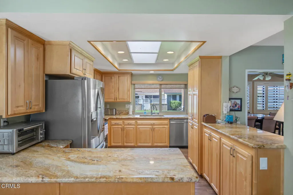 Welcome to one of the most sought-after floor plans in Leisure Village 55+ gated community–the highly desirable Holmby II model, a layout buyers love but rarely find since only a limited number were built. This beautifully updated home offers over 1,500 sft of living space thanks to a thoughtfully integrated patio enclosure that creates a bright, spacious living area filled with natural light. Large windows & multiple skylights throughout the home enhance the open feel & bring the beautiful Camarillo sunshine indoors.The remodeled kitchen has been reimagined with portions of the original walls opened up to create a more open-concept layout, perfect for modern living and entertaining. The home features durable vinyl plank flooring throughout, providing a clean, contemporary look with easy maintenance. Both bathrooms have been tastefully remodeled, offering updated finishes and comfort.The very spacious primary bedroom provides a comfortable retreat and includes a walk-in closet, a feature buyers particularly appreciate in this model. The popular Holmby II design offers excellent flow and comfortable living spaces, making it one of the most desirable layouts for buyers looking for a home in Leisure Village Camarillo 55+ that combines functionality, light, and upgraded features.Living in Leisure Village, Camarillo’s premier active adult 55+ community, means enjoying a vibrant lifestyle with incredible amenities and activities. Residents have access to a private 18-hole par-3 golf course, swimming pool and spa, fitness center, tennis and pickleball courts, bocce ball, shuffleboard, billiards, woodworking shop, ceramics studio, sewing room, library, and RV parking. The community also offers dozens of clubs, social groups, classes, and events including art, music, travel groups, gardening, cards, and more–making it easy to stay active and connected.The HOA provides exceptional value, covering 24-hour guard-gated security, cable TV, high-speed internet, water, trash, sewer, landscaping, exterior maintenance, roof replacement, exterior painting, and maintenance of all common areas and amenities, allowing homeowners to enjoy a low-maintenance lifestyle.Located in the heart of Camarillo with its mild coastal climate, nearby shopping, restaurants, parks, and easy access to the Pacific Coast, Leisure Village is one of the most desirable 55+ retirement communities in Ventura County