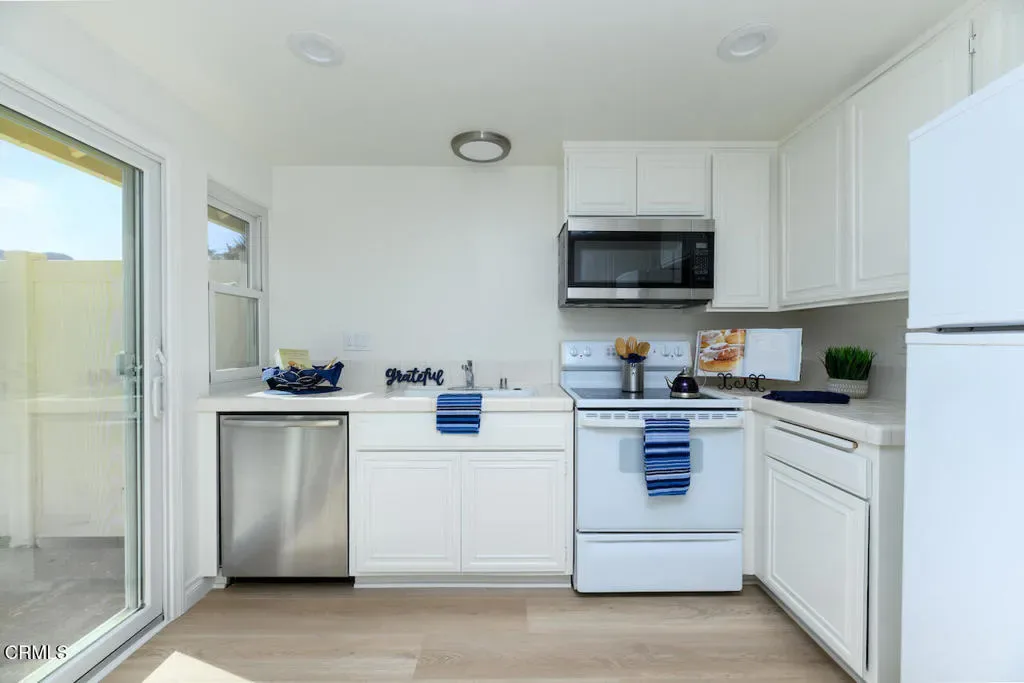 The Brentwood model in Leisure Village, Camarillo’s premier 55+ gated senior community, is one of the most popular floor plans for good reason! This efficient 951 sq ft home features 2 bedrooms and 2 bathrooms, plus a bright living room and dining area with vaulted (cathedral) ceilings that create an open, spacious feel. The thoughtful design maximizes every square foot, including a generously sized master bedroom ideal for comfort and relaxation. Freshly painted interior, popcorn ceilings removed for a clean modern look, and brand-new premium vinyl plank flooring throughout with matching baseboards–this home is spotless and truly move-in ready! Prime location near the golf course and just steps from the back of the Recreation Center puts you right in the heart of the action with unbeatable convenience. Leisure Village offers resort-style living on over 400 acres of beautifully landscaped grounds, with 24-hour guarded security and gated entry for peace of mind. Enjoy an 18-hole golf course, year-round heated Olympic-size pool and spa, state-of-the-art fitness center, pickleball and tennis courts, woodshop, ceramics studio, billiards, walking/biking paths, RV parking, and a vibrant Recreation Center hosting dances, classes, live entertainment, and events.With over 60 clubs and activities–from fitness and crafts to social gatherings and more–boredom is simply not an option unless you want it to be! Embrace the low-maintenance, high-enjoyment lifestyle in this welcoming Ventura County gem, with easy access to Camarillo’s charming Old Town shops, dining, outlets, and mild year-round Southern California weather. This Brentwood home perfectly captures what makes Leisure Village so sought-after–schedule your showing today!