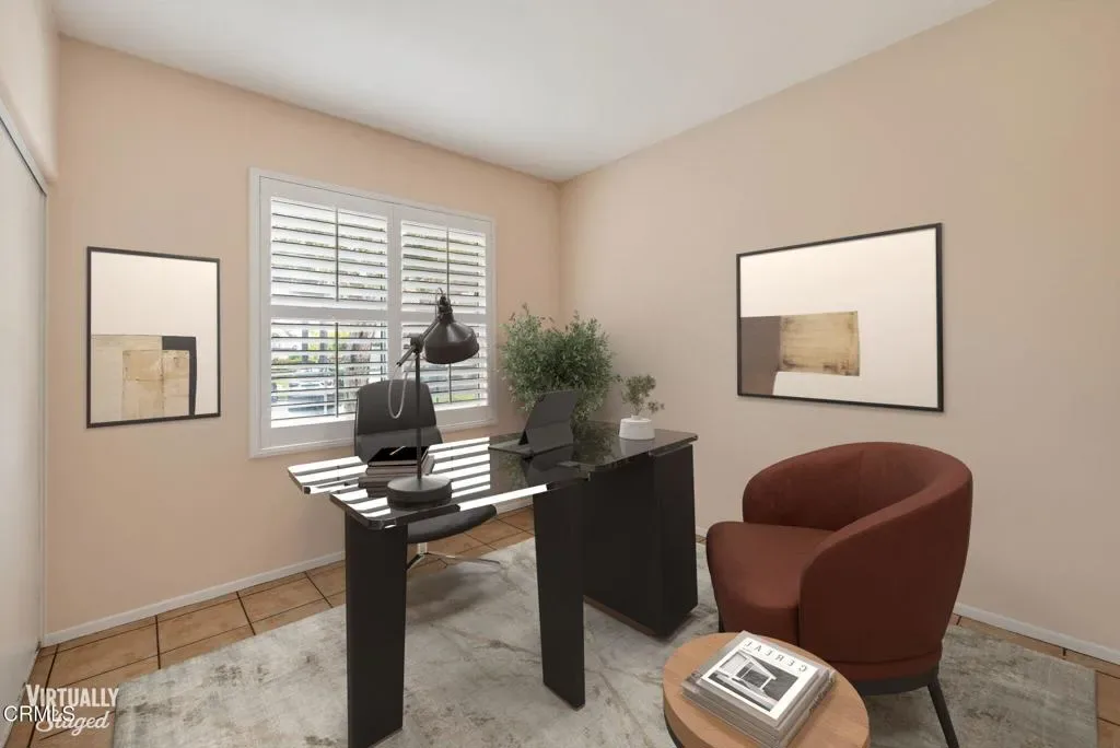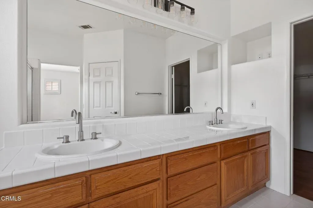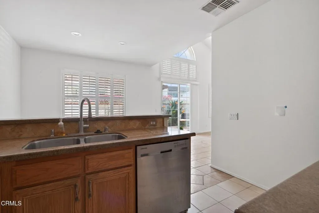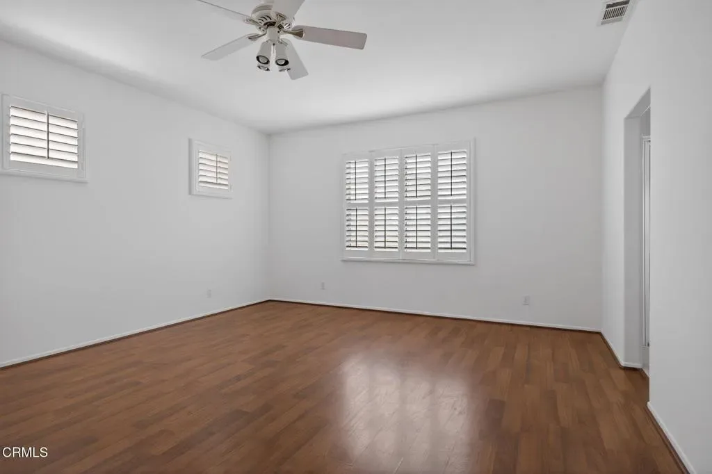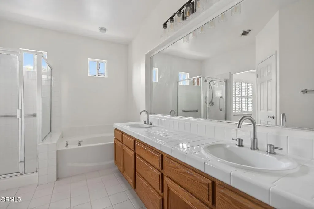 Welcome to Palm Colony, one of Camarillo’s most desirable gated communities, offering a vibrant lifestyle and outstanding amenities. This prime corner location features 3 bedrooms, 3 bathrooms, and approximately 1,860 sq ft of well-designed living space.Step inside to vaulted ceilings and abundant natural light that instantly create the feel of a single-family home. The flexible floor plan includes a main-level bedroom or office with a full bathroom–ideal for guests or working from home.The updated kitchen showcases granite countertops and custom cabinetry, opening to the dining area and spacious living room with direct access to a private side patio–perfect for entertaining or relaxing. Tile flooring downstairs, wood-like vinyl upstairs, and custom wood shutters add style throughout.Upstairs, both bedrooms are private primary suites with en-suite bathrooms. The main suite offers a cozy fireplace and walk-in closet, creating a comfortable retreat. An upstairs laundry area adds everyday convenience.Enjoy a direct-access two-car garage, ample guest parking, gated entry, and beautifully maintained greenbelts.Palm Colony amenities include a pool, spa, tennis courts, racquetball, fitness center, and RV/boat parking–everything you need for an active lifestyle.Ideally located near the Camarillo Premium Outlets, dining, shopping, and easy access to the 101 Freeway.Some photos have been virtually staged to illustrate potential.