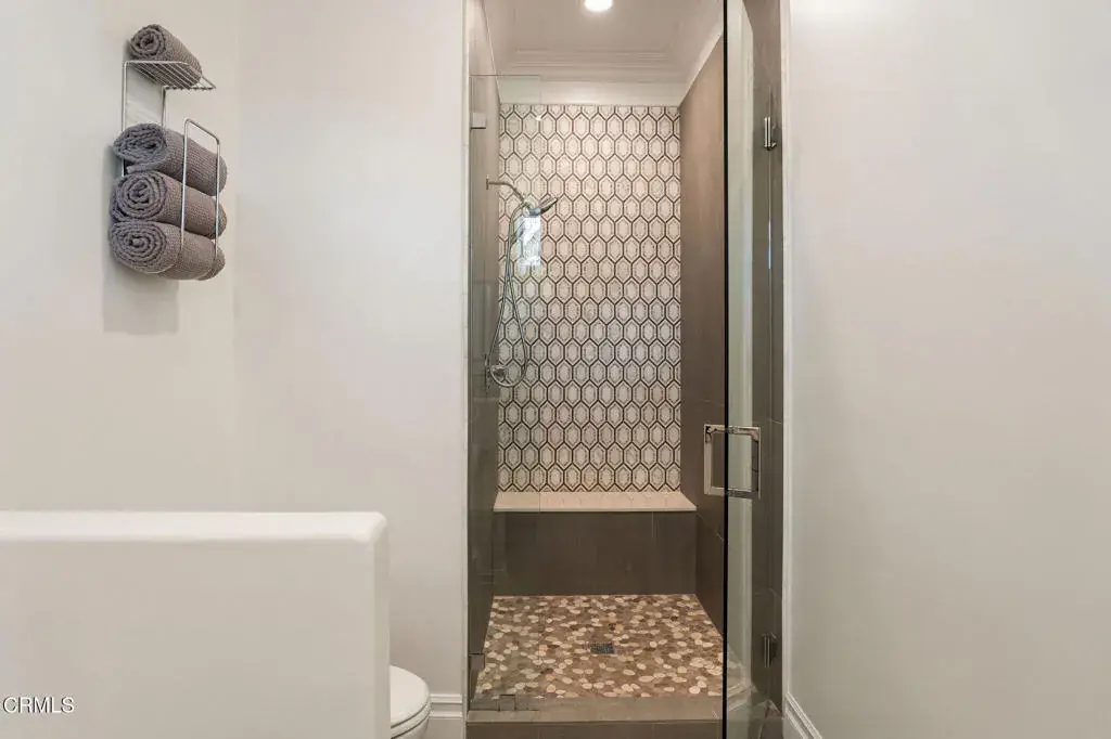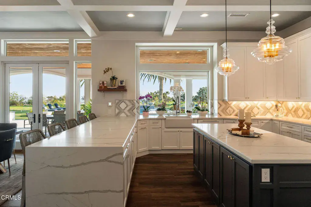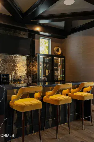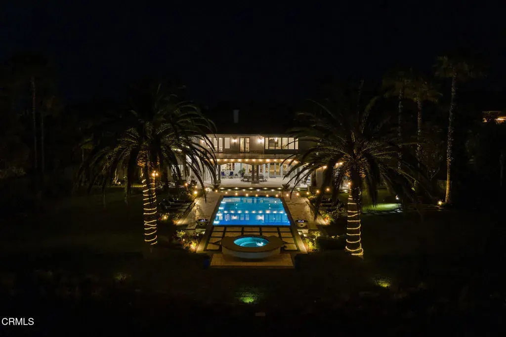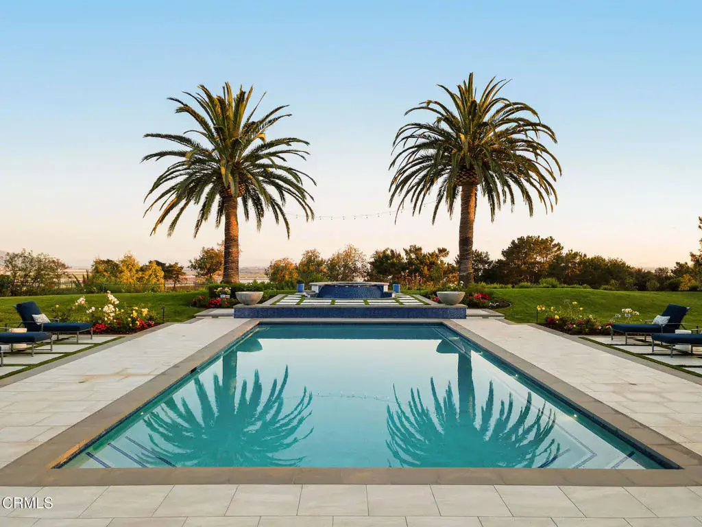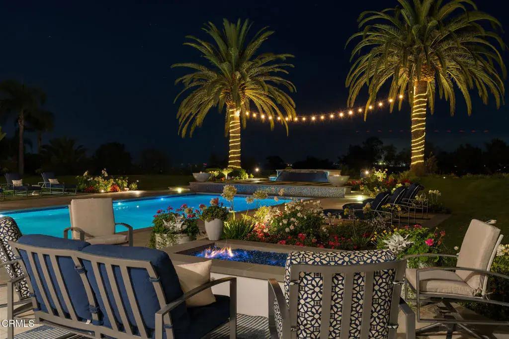 Tucked away in Camarillo’s coveted Spanish Hills community and perched on the 15th fairway of the Spanish Hills Club, 1069 Corte Barroso sits on one of the best lots in the neighborhood. This grand 7,121 SF contemporary estate on a flat, lush 1-acre lot features 6 bedrooms, 6.5 bathrooms, and a fully gated entrance offering premier privacy and exclusivity. Panoramic golf course and ocean views elevate everyday living in this beautifully designed residence that blends rich textures, clean lines, and luxurious scale. A dramatic formal entry welcomes you into voluminous interiors, where a soaring great room with a stone fireplace and oversized windows creates an elegant yet inviting space for gathering. The fully renovated and expanded kitchen is a chef’s dream, outfitted with paneled Sub-Zero and Asko appliances, Wolf double ovens, induction + gas cooktop, microwave, two warming drawers, a large island with breakfast bar, dining area, built-in desk, and separate scullery. Oversized windows and a wall of French doors frame the serene outdoor space, enhancing the seamless indoor-outdoor flow. Flanking the entry are formal living and dining rooms, while the true showpiece downstairs is a moody, speakeasy-style bar with mini fridges, ice machine, oversized wine fridge, and custom woodwork. The main level also includes a spacious primary suite, laundry room, and an additional bedroom converted into a stunning office with custom cabinetry. Upstairs, a second expansive primary suite offers a large sleeping area, sitting room, modern electric fireplace, and French doors that open to a private terrace with jaw-dropping 180-degree views of Camarillo, the golf course, airport, and the Channel Islands–where sunsets are a daily highlight. Three additional guest bedrooms upstairs each feature ensuite baths for optimal comfort. The entertainer’s backyard features lush, meticulously landscaped grounds, a renovated pool and spa, covered patio with built-in speakers, TV lounge with fireplace, full outdoor kitchen, putting green, and separate fire pit area. With an oversized 3-car garage, Tesla wall, owned solar and water purification systems, RV parking, and a truly unbeatable location, this estate is a rare offering and an exceptional place to call home.